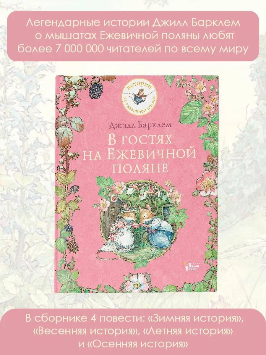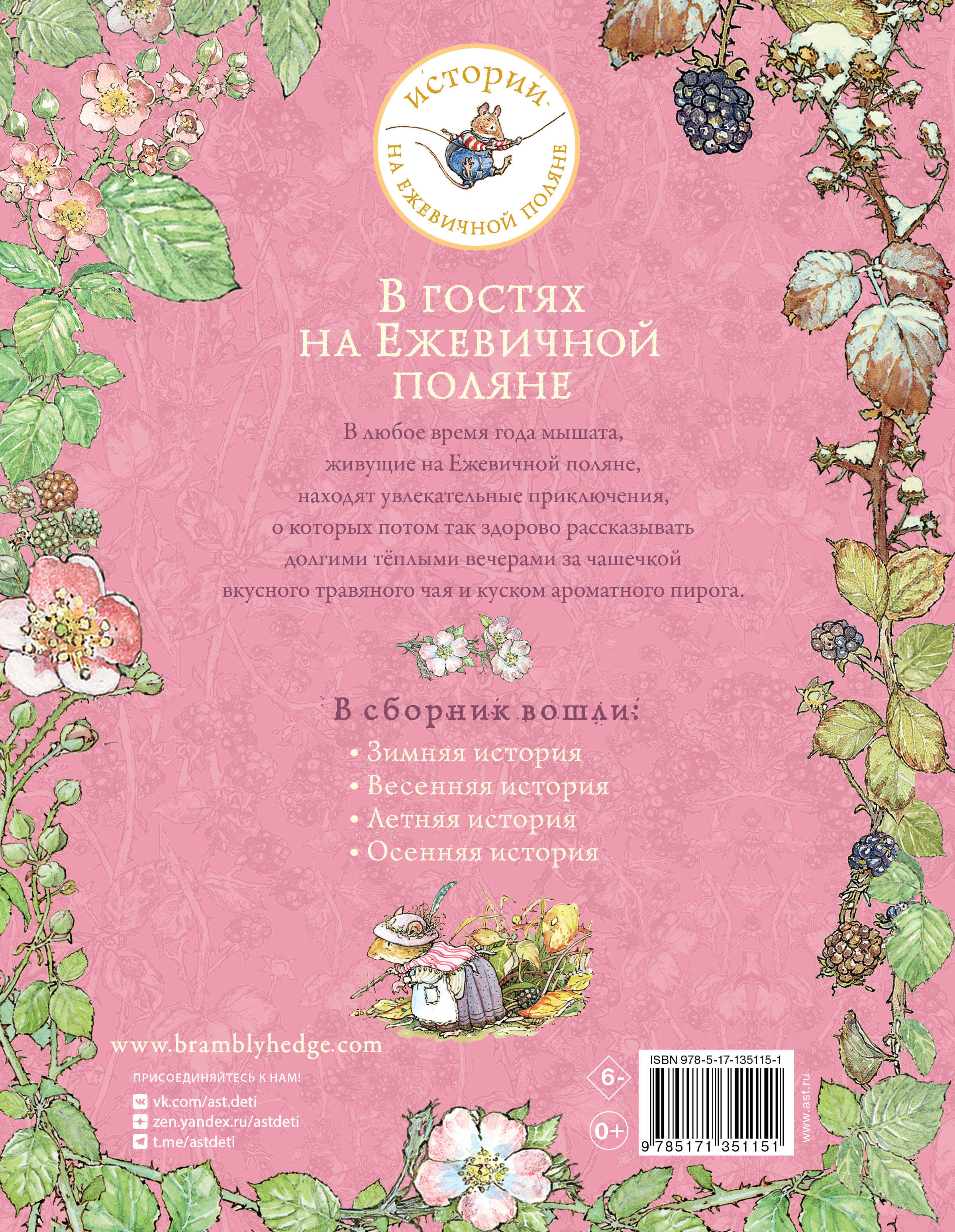 Герои сборника "В гостях на Ежевичной поляне", очаровательные мышата, все время находят веселые приключения! Провести снежный бал, отправиться на пикник, сделать зимние заготовки - в их маленьких домиках, похожих на староанглийские поместья, дела кипят круглый год… Впервые сказки про приключения мышат увидели свет в 1980 году. Четыре истории этого сборника принесли автору и иллюстратору Джилл Барклем мировую известность. Больше 7 000 000 читателей обожают жителей ежевичной поляны. Внимание даже к самыми крохотным деталям, добрые сюжеты и уютная британская атмосфера - в мире Джилл Барклем так хочется задержаться хотя бы на ещё одну чашку ароматного чая! Книга выходит в блистательном переводе Ольги Мяэотс. В сборник "В гостях на Ежевичной поляне" вошли "Зимняя история", "Весенняя история", "Летняя история" и "Осенняя история".| Издательство | ИЗДАТЕЛЬСТВО "АСТ" |