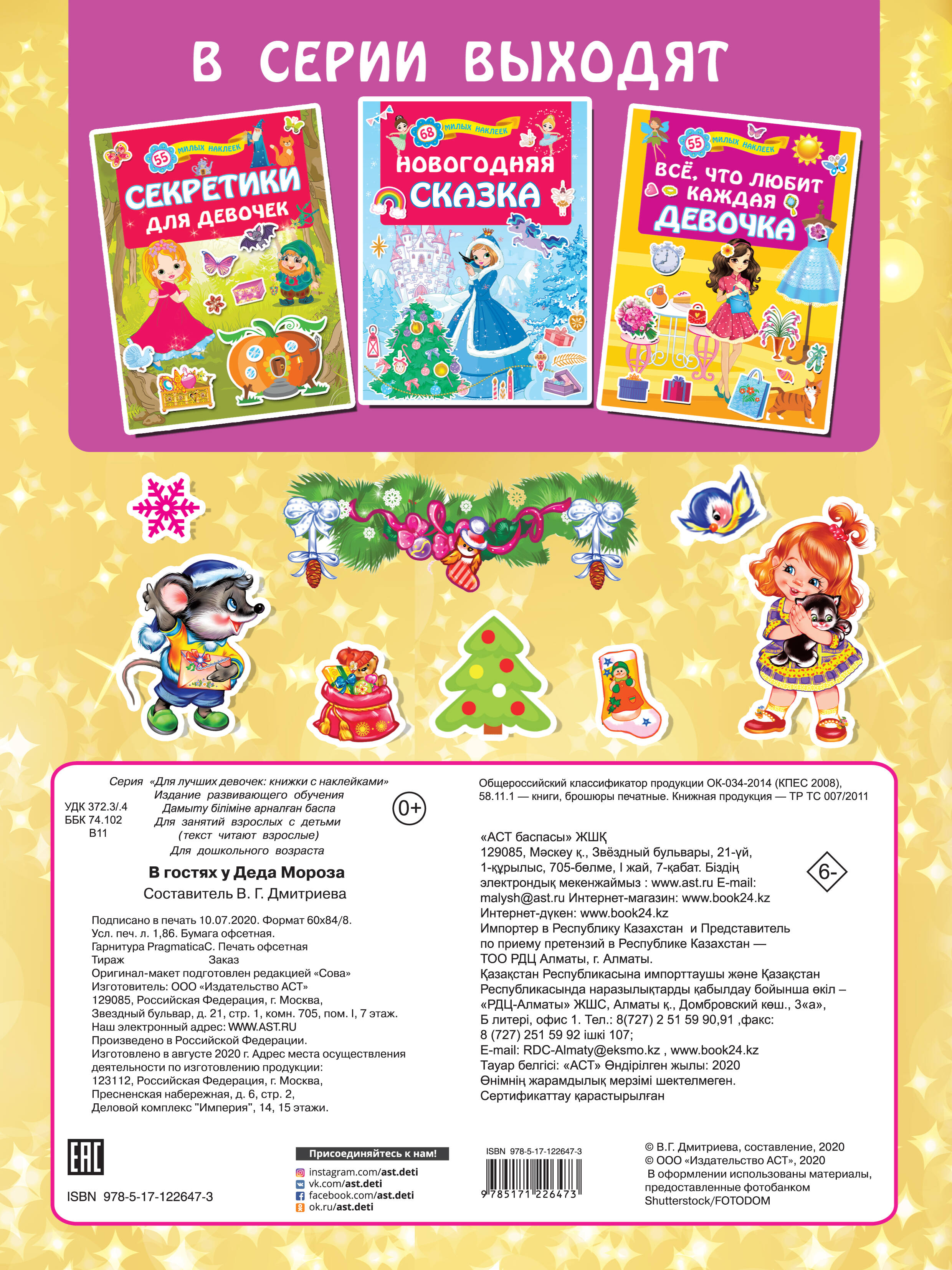 О чем эта книга «В гостях у Деда Мороза» - праздничный калейдоскоп волшебных игр, головоломок, ребусов, лабиринтов, кроссвордов, загадок + чудесные красочные праздничные наклейки, которыми можно украсить страницы книги, а также праздничные поделки и открытки. Кому эта книга будет интересна Книга развивающих заданий придется по душе всем девочкам, которые ждут Дедушку Мороза и ожидают чуда под Новый год. Это много-много загадок, головоломок, игр, лабиринтов на тему самого любимого праздника. Подружки смогут своими руками украсить иллюстрации яркими новогодними наклейками. Каковы особенности этой книги Красочно иллюстрированная новогодняя книга порадует девочек, а также их подружек. Книжка помогает раскрыть творческий потенциал, дарит множество положительных эмоций, создает атмосферу праздника. С чудесной книжкой можно пофантазировать, придумать истории, украсить страницы новогодними наклейками. Открывайте замечательную книжку игр и заданий - и устраивайте веселую и увлекательную новогоднюю викторину!