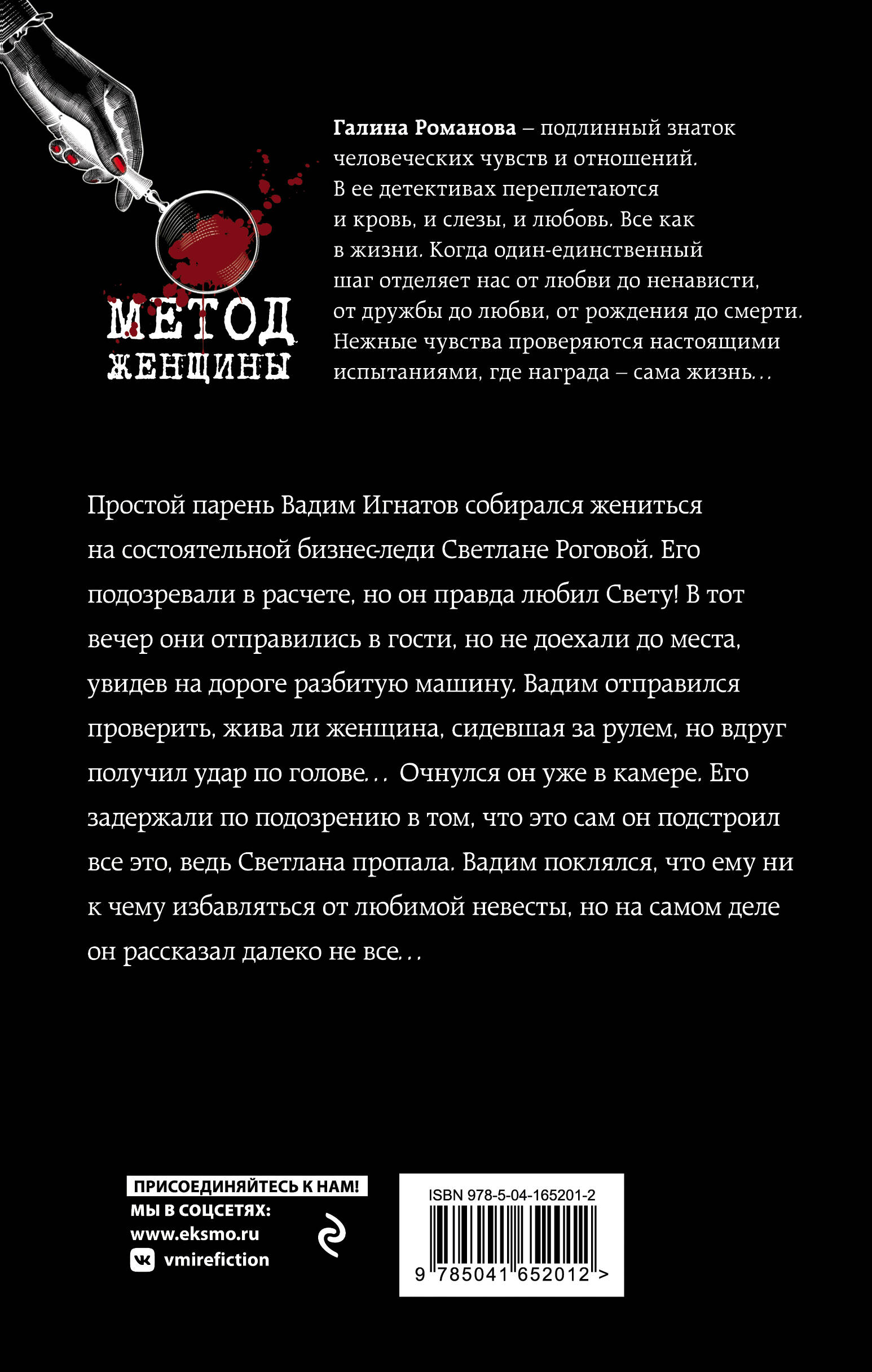 Простой парень Вадим Игнатов собирался жениться на состоятельной бизнес-леди Светлане Роговой. Его подозревали в расчете, но он правда любил Свету! В тот вечер они отправились в гости, но не доехали до места, увидев на дороге разбитую машину. Вадим отправился проверить, жива ли женщина, сидевшая за рулем, но вдруг получил удар по голове… Очнулся он уже в камере. Его задержали по подозрению в том, что это сам он подстроил все это, ведь Светлана пропала. Вадим поклялся, что ему ни к чему избавляться от любимой невесты, но на самом деле он рассказал далеко не всё… Сложно было представить, что авантюрная идея изложить на бумаге придуманную криминальную историю внезапно перерастет во что-то серьезное и станет смыслом жизни. Именно с этого начался творческий путь российской писательницы Галины Романовой. И сейчас она по праву считается подлинным знатоком чувств и отношений. Суммарный тираж книг Галины Романовой превысил 3 миллиона экземпляров.| Издательство | Эксмо |
