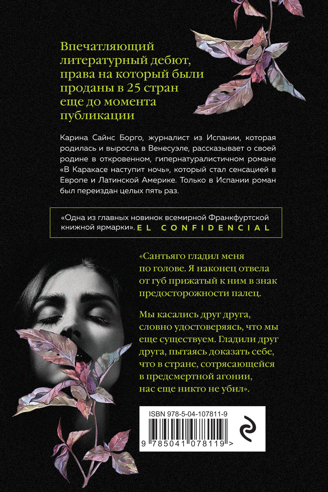 Впечатляющий литературный дебют, права на который были проданы в 25 стран еще до момента публикации. Карина Сайнс Борго, журналист из Испании, которая родилась и выросла в Венесуэле, рассказывает о своей родине в откровенном, гипернатуралистичном романе «В Каракасе наступит ночь», который стал сенсацией в Европе и Латинской Америке. Только в Испании роман был переиздан целых пять раз. «Одна из главных новинок всемирной Франкфуртской книжной ярмарки». - El Confidencial Действие романа происходит в наши дни. Главной героине Аделаиде 38 лет, она работает редактором в издательстве и получает довольно неплохую зарплату по меркам Венесуэлы. Аделаиду настораживает, что народные массы Венесуэлы поднялись на борьбу с правительством, и по этой причине товары народного потребления стали дороже, а уровень жизни в стране все падает. Когда в столице, Каракасе, наступает голод, страх за свою жизнь вынуждает людей творить страшные вещи. Беда настигает и Аделаиду, чья личность подвергается вынужденному перерождению под гнетом социальных трудностей, мародерства и отсутствия видимых перспектив на будущее.