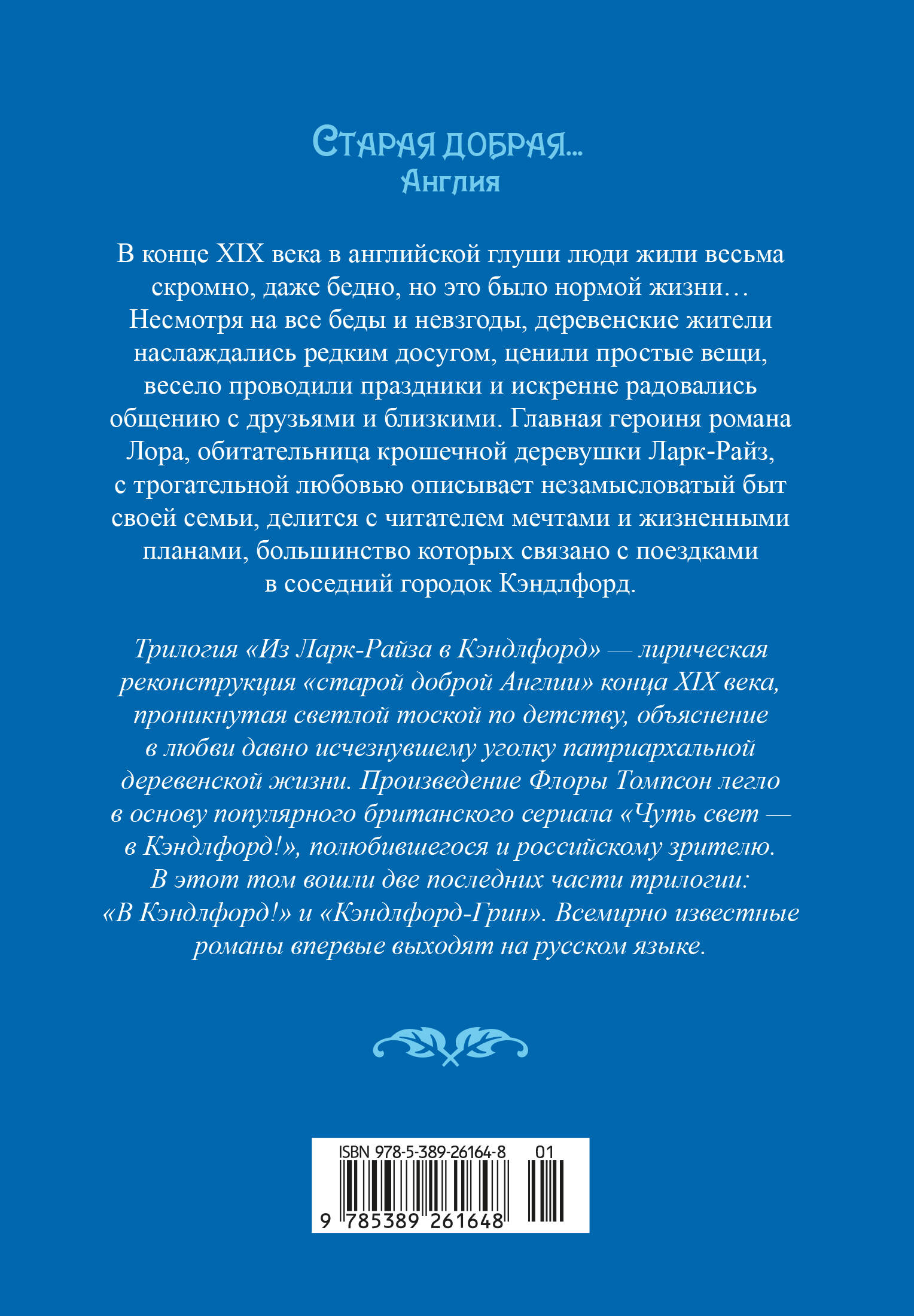 Автобиографическая трилогия "Из Ларк-Райз в Кэндлфорд" - ностальгическая ода, воспевающая жизнь провинциальной Англии Викторианской эпохи, рассказанная от лица девочки Лоры, выросшей в деревушке Ларк-Райз на севере Оксфордшира, а затем, еще подростком, устроившейся работать в почтовое отделение в близлежащем городке Кэндлфорд-Грин. Эти полулирические-полудокументальные воспоминания очаровывают искренностью повествования и простотой деревенских нравов, порой кажущихся наивными, и от этого еще более трогательных. В этот том вошли вторая и третья части трилогии.