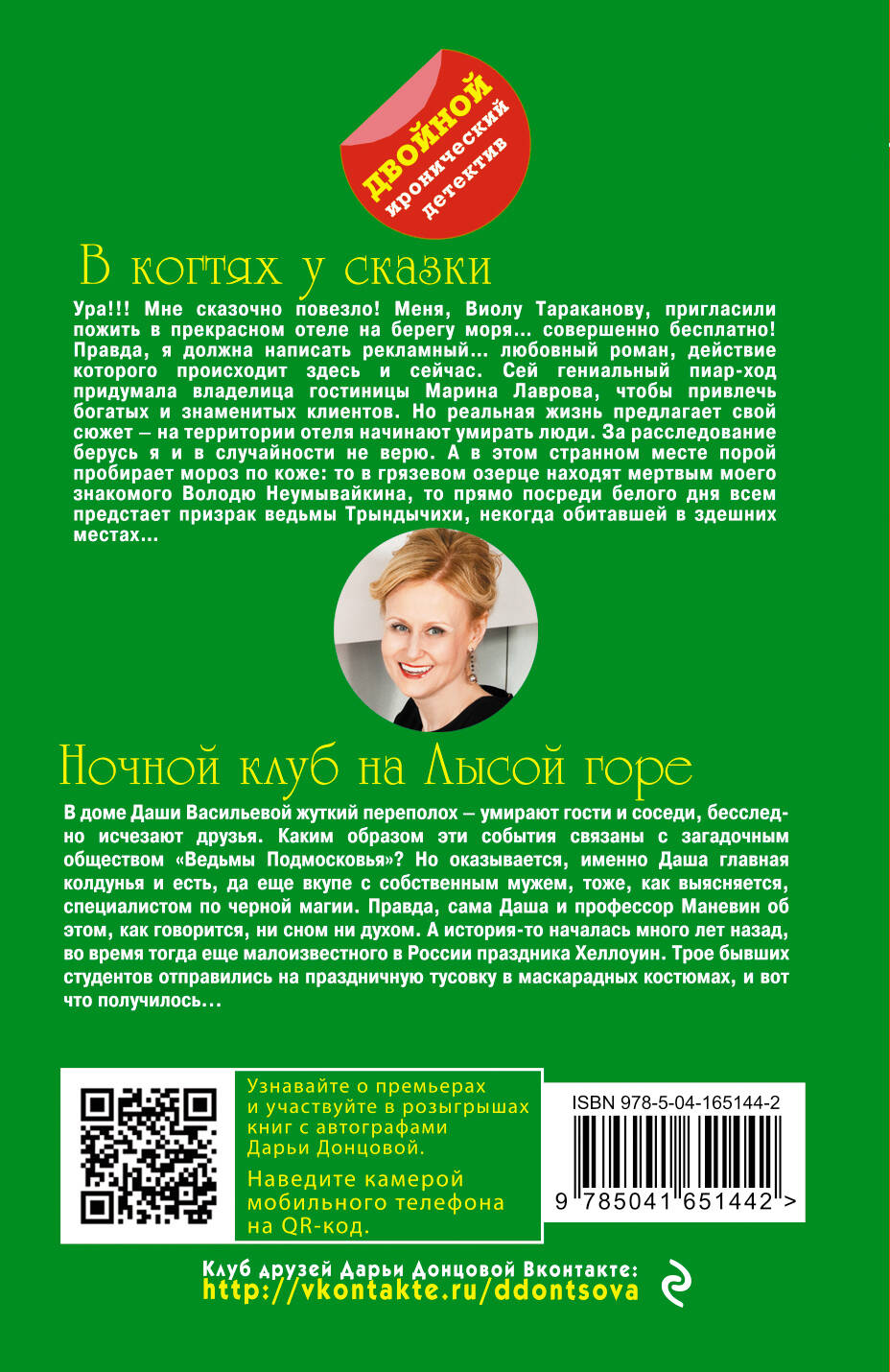 «В когтях у сказки» Ура!!! Мне сказочно повезло! Меня, Виолу Тараканову, пригласили пожить в прекрасном отеле на берегу моря… совершенно бесплатно! Правда, я должна написать рекламный… любовный роман, действие которого происходит здесь и сейчас. Сей гениальный пиар-ход придумала владелица гостиницы Марина Лаврова, чтобы привлечь богатых и знаменитых клиентов. Но реальная жизнь предлагает свой сюжет - на территории отеля начинают умирать люди. За расследование берусь я и в случайности не верю. А в этом странном месте порой пробирает мороз по коже: то в грязевом озерце находят мертвым моего знакомого Володю Неумывайкина, то прямо посреди белого дня всем предстает призрак ведьмы Трындычихи, некогда обитавшей в здешних местах… «Ночной клуб на Лысой горе» В доме Даши Васильевой жуткий переполох - умирают гости и соседи, бесследно исчезают друзья. Каким образом эти события связаны с загадочным обществом «Ведьмы Подмосковья»? Но, оказывается, именно Даша главная колдунья и есть, да еще вкупе с собственным мужем, тоже, как выясняется, специалистом по черной магии. Правда, сама Даша и профессор Маневин об этом, как говорится, ни сном ни духом. А история-то началась много лет назад, во время тогда еще мало известного в России праздника Хэллоуин. Трое бывших студентов отправились на праздничную тусовку в маскарадных костюмах, и вот что получилось... Дарья Донцова - самый популярный и востребованный автор в нашей стране, любимица миллионов читателей. В России продано более 200 миллионов экземпляров ее книг. Ее творчество наполняет сердца и души светом, оптимизмом, радостью, уверенностью в завтрашнем дне! -------------------------------------------------- «Донцова невероятная работяга! Я не знаю ни одного другого писателя, который столько работал бы. Я отношусь к ней с уважением, как к образцу писательского трудолюбия. Женщины нуждаются в психологической поддержке и получают ее от Донцовой. Я и сама в свое время прочла несколько романов Донцовой. Ее читают очень разные люди. И очень занятые бизнес-леди, чтобы на время выключить голову, и домохозяйки, у которых есть перерыв 15-20 минут между отвести-забрать детей». - Галина Юзефович, литературный критик| Издательство | Эксмо |