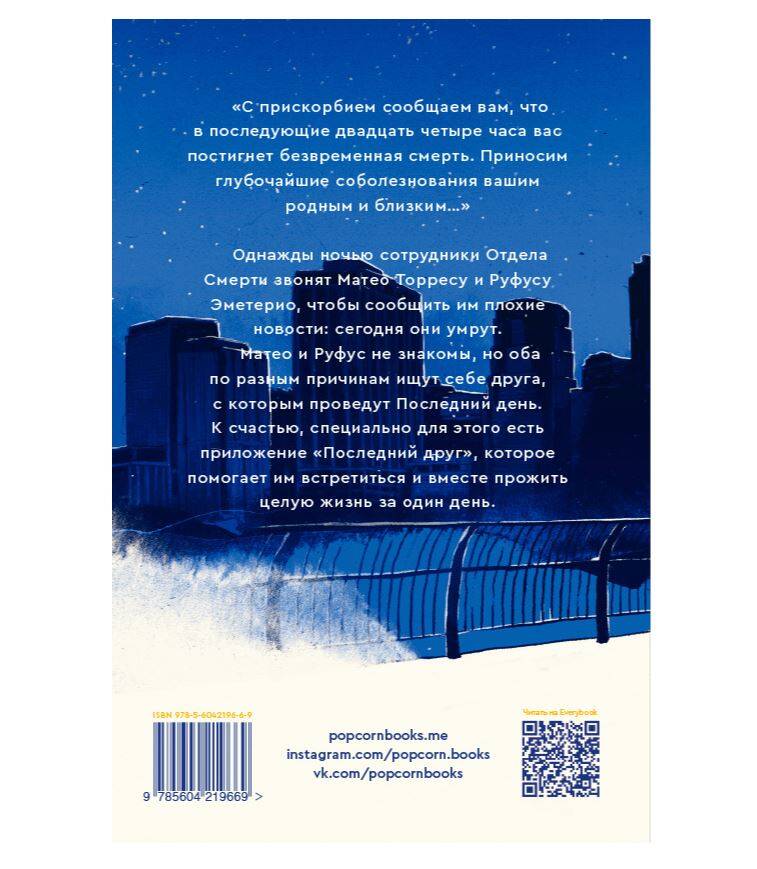 «С прискорбием сообщаем вам, что в последующие двадцать четыре часа вас постигнет безвременная смерть. Приносим глубочайшие соболезнования вашим родным и близким…» Однажды ночью сотрудники «Отдела Смерти» звонят Матео Торресу и Руфусу Эметерио, чтобы сообщить им плохие новости: сегодня они умрут. Матео и Руфус не знакомы, но оба по разным причинам ищут себе друга, с которым проведут Последний день. К счастью, специально для этого есть приложение «Последний друг», которое помогает им встретиться и вместе прожить целую жизнь за один день. Вдохновляющая и душераздирающая, очаровательная и жуткая - эта книга напоминает о том, что нет жизни без смерти, любви без потери и что даже за один день можно изменить свой мир.| Издательство | ИНДИВИДУУМ ПРИНТ ООО |