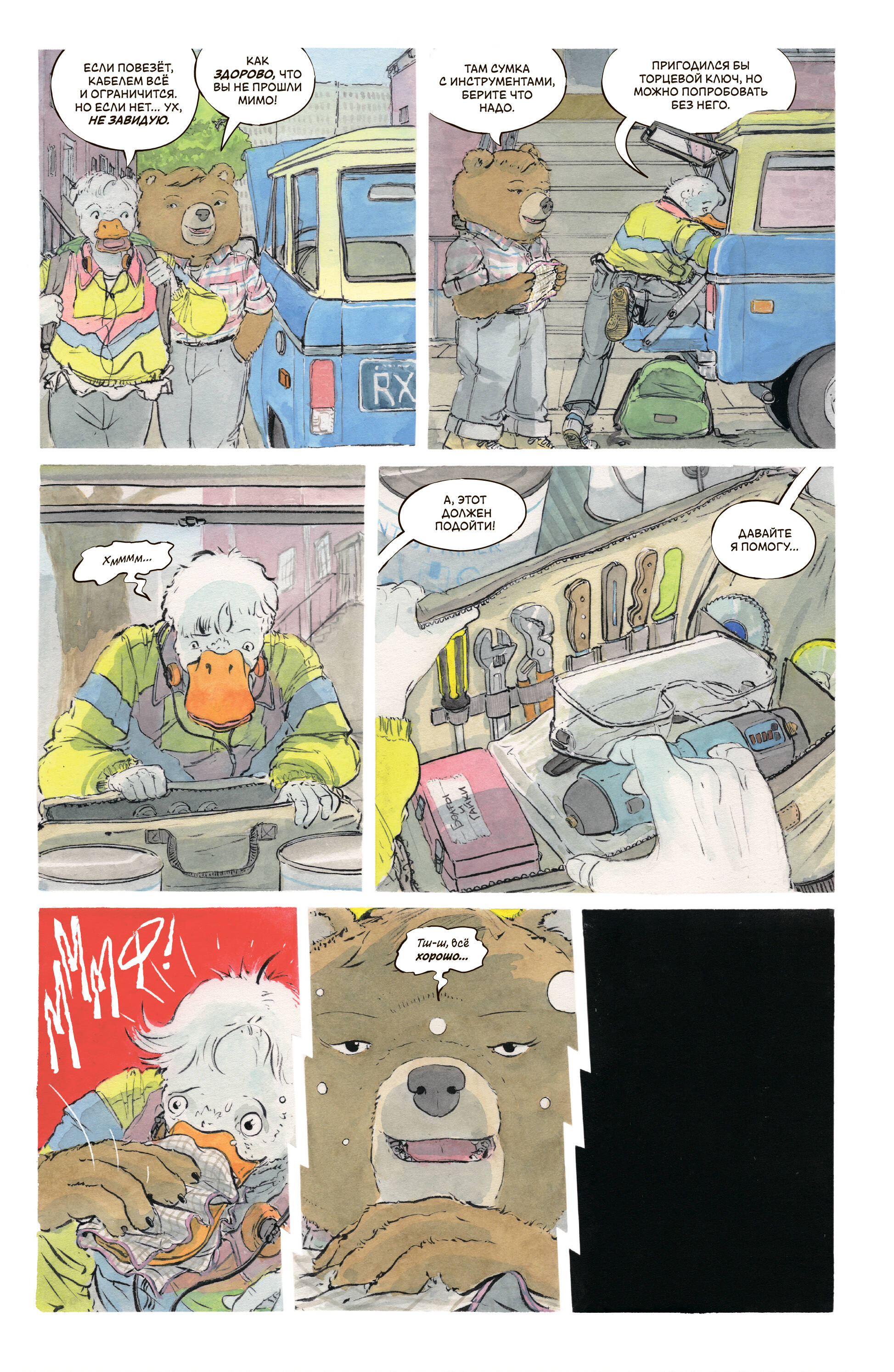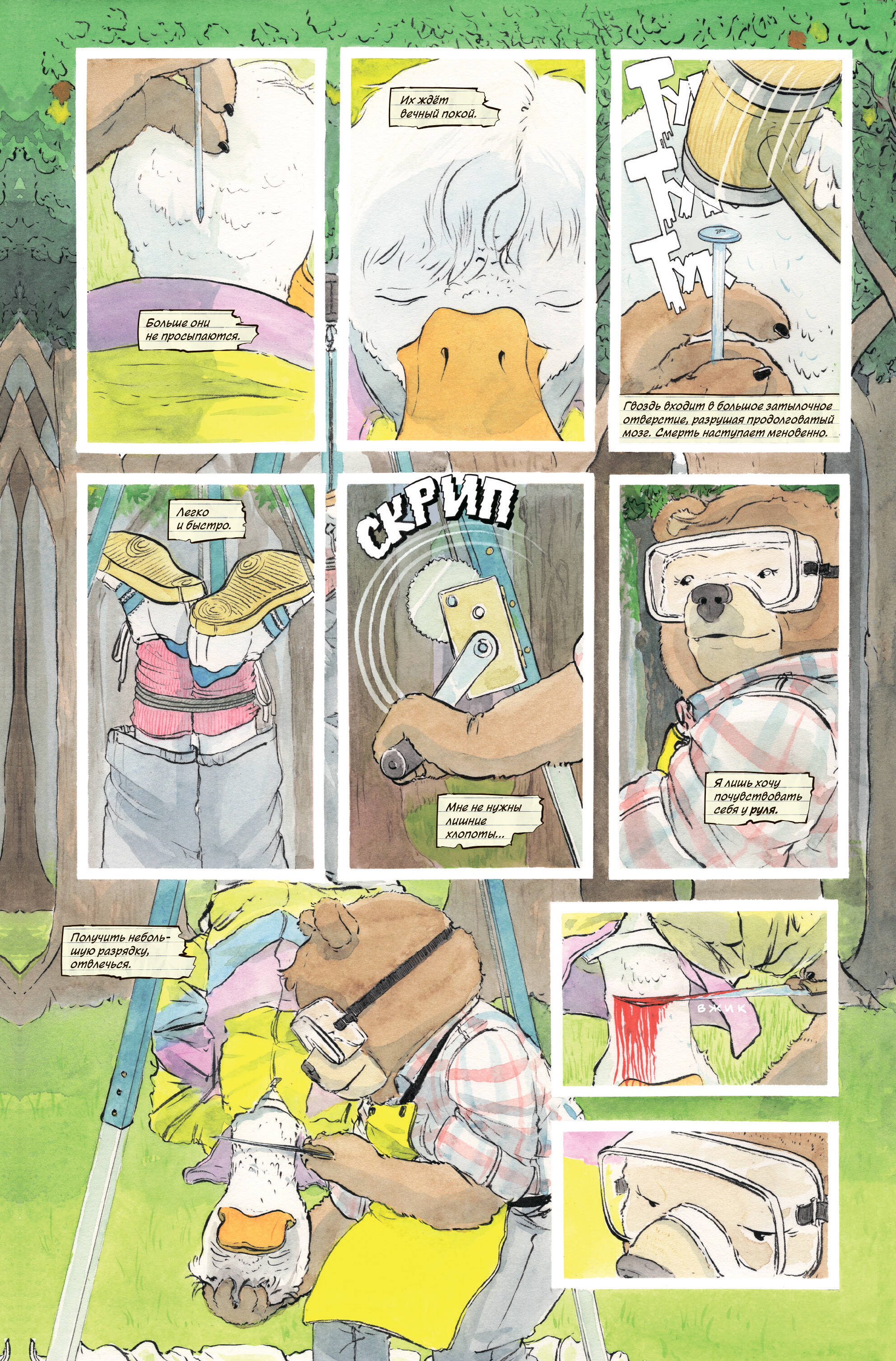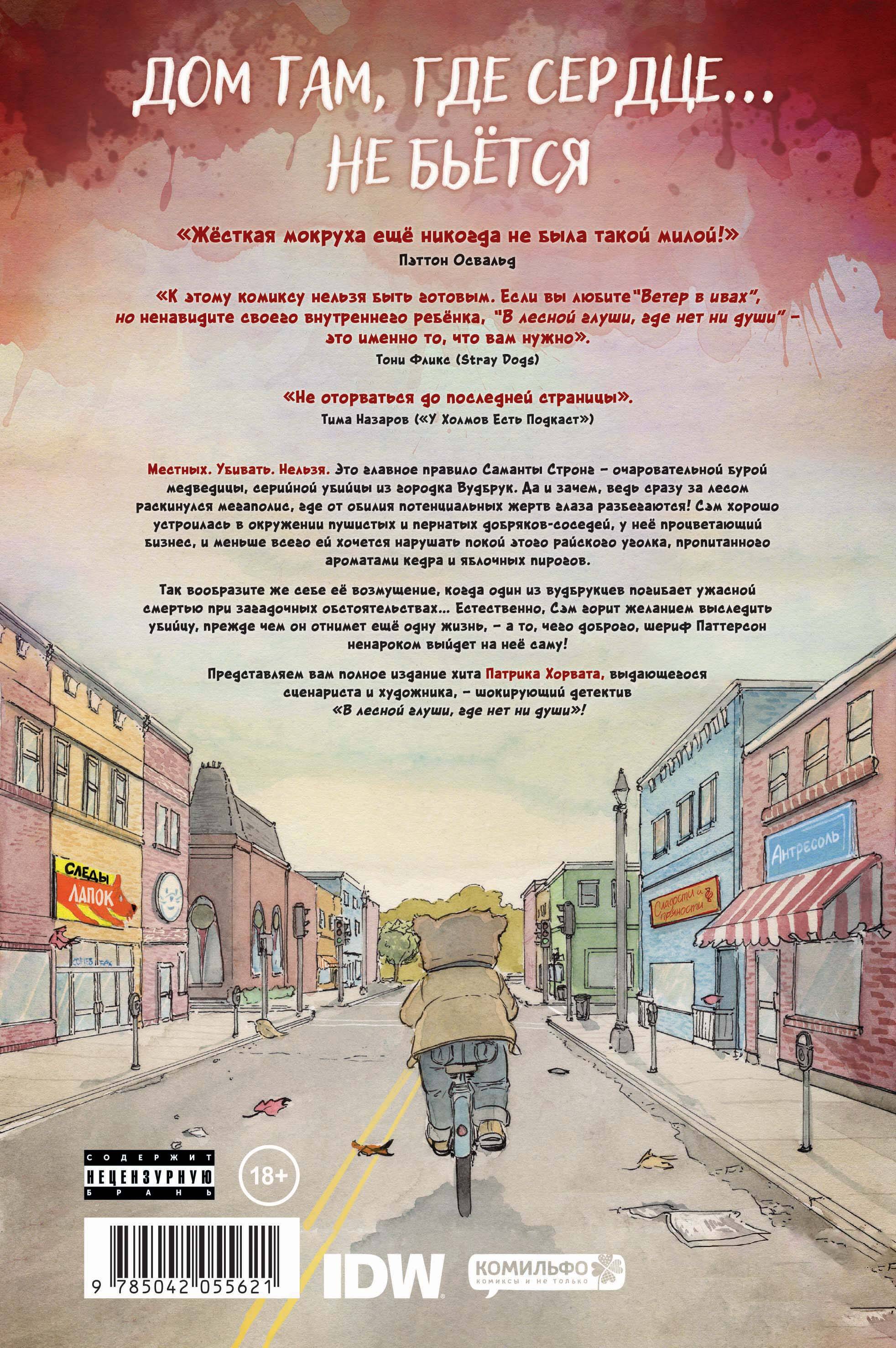 Местных. Убивать. Нельзя. Это главное правило Саманты Стронг - очаровательной бурой медведицы, серийной убийцы из городка Вудбрук. Да и зачем, ведь сразу за лесом раскинулся мегаполис, где от обилия потенциальных жертв глаза разбегаются! Сэм хорошо устроилась в окружении пушистых и пернатых добряков-соседей, у неё процветающий бизнес, и меньше всего ей хочется нарушать покой этого райского уголка, пропитанного ароматами кедра и яблочных пирогов. Однако всё меняется, когда один из вудбрукцев погибает ужасной смертью при загадочных обстоятельствах… Сэм возмущена и горит желанием выследить убийцу, прежде чем он отнимет ещё одну жизнь, - а то, чего доброго, шериф Паттерсон ненароком выйдет на неё саму! Маньяк выходит на охоту за другим маньяком в шокирующем детективе «В лесной глуши, где нет ни души»! «Жёсткая мокруха ещё никогда не была такой милой!» Пэттон Освальд «К этому комиксу нельзя быть готовым. Если вы любите «Ветер в ивах», но ненавидите своего внутреннего ребёнка, «В лесной глуши, где нет ни души» - это именно то, что вам нужно». Тони Фликс (Stray Dogs) «Брутальная и интересная история, почти нуар. А графика в стиле детской книги создает контраст с мрачным содержанием, что завораживает и не позволяет оторваться до последней страницы». Тима Назаров («У Холмов Есть Подкаст»)| Издательство | ООО "Издательство "Эксмо" |