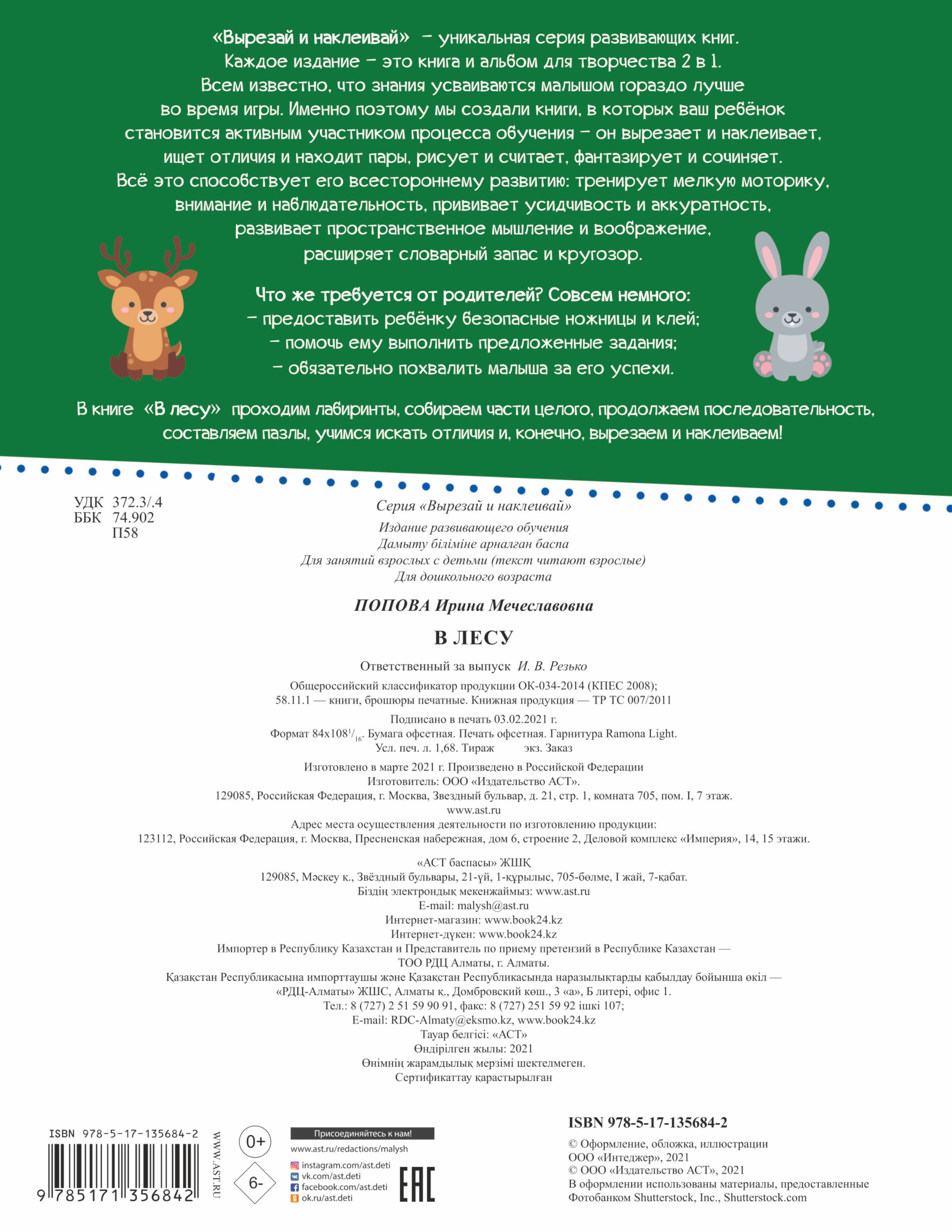 "Вырезай и наклеивай" - уникальная серия развивающих книг. Каждое издание - это книга и альбом для творчества 2 в 1. Всем известно, что знания усваиваются малышом гораздо лучше во время игры. Именно поэтому мы создали книги, в которых ваш ребёнок становится активным участником процесса обучения - он вырезает и наклеивает, ищет отличия и находит пары, рисует и считает, фантазирует и сочиняет. Всё это способствует его всестороннему развитию: тренирует мелкую моторику, внимание и наблюдательность, прививает усидчивость и аккуратность, развивает пространственное мышление и воображение, расширяет словарный запас и кругозор. Что же требуется от родителей? Совсем немного: - предоставить ребёнку безопасные ножницы и клей; - помочь ему выполнить предложенные задания; - обязательно похвалить малыша за его успехи. В книге "В лесу" проходим лабиринты, собираем части целого, продолжаем последовательность, составляем пазлы, учимся искать отличия и, конечно, вырезаем и наклеиваем!| Издательство | ИЗДАТЕЛЬСТВО "АСТ" |