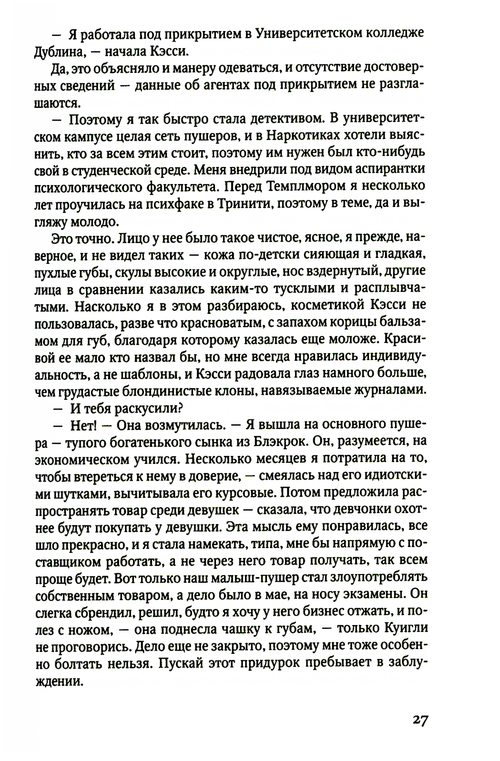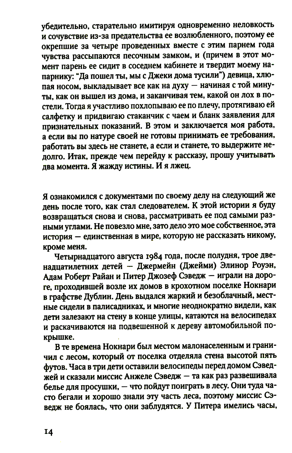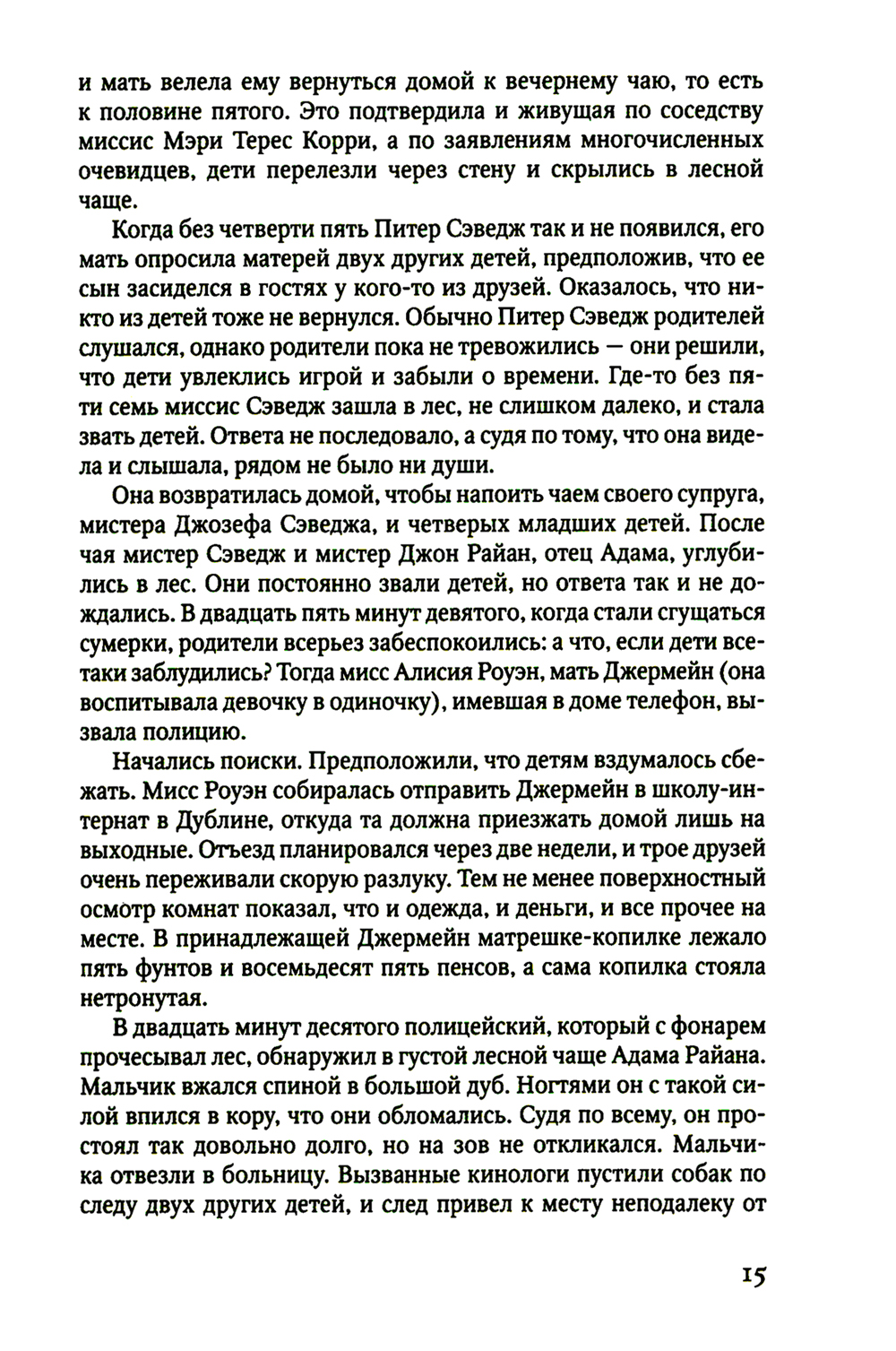 Летом 1984 года, когда сумерки опускаются на идиллический поселок в пригороде Дублина, матери зовут своих детей домой. Но в этот теплый вечер из темного и безмолвного леса не возвращаются трое детей, два мальчика и девочка. Полиция найдет только одного мальчика, Адама. Он в ужасе прижимается к стволу старого дерева, его кроссовки пропитались кровью, и он ничего не помнит... Двадцать лет спустя найденный мальчик, которого теперь зовут Роб Райан, работает детективом в Дублинском отделе убийств и хранит свое прошлое в секрете. Но когда рядом с тем же лесом находят тело убитой двенадцатилетней девочки, все пугающе напоминает то давнее нераскрытое преступление. По одной из версий Роба Райана и его напарницы Кэсси Мэддокс. которым поручено расследование, это убийство ребенка, возможно, как-то связано с пропавшими двадцать лет назад детьми. Перебирая обрывки уцелевших, однако давно похороненных воспоминаний, Райан осознает, что у него есть шанс не только раскрыть новое преступление, но и найти разгадку тайны собственного прошлого.| Издательство | Фантом Пресс |