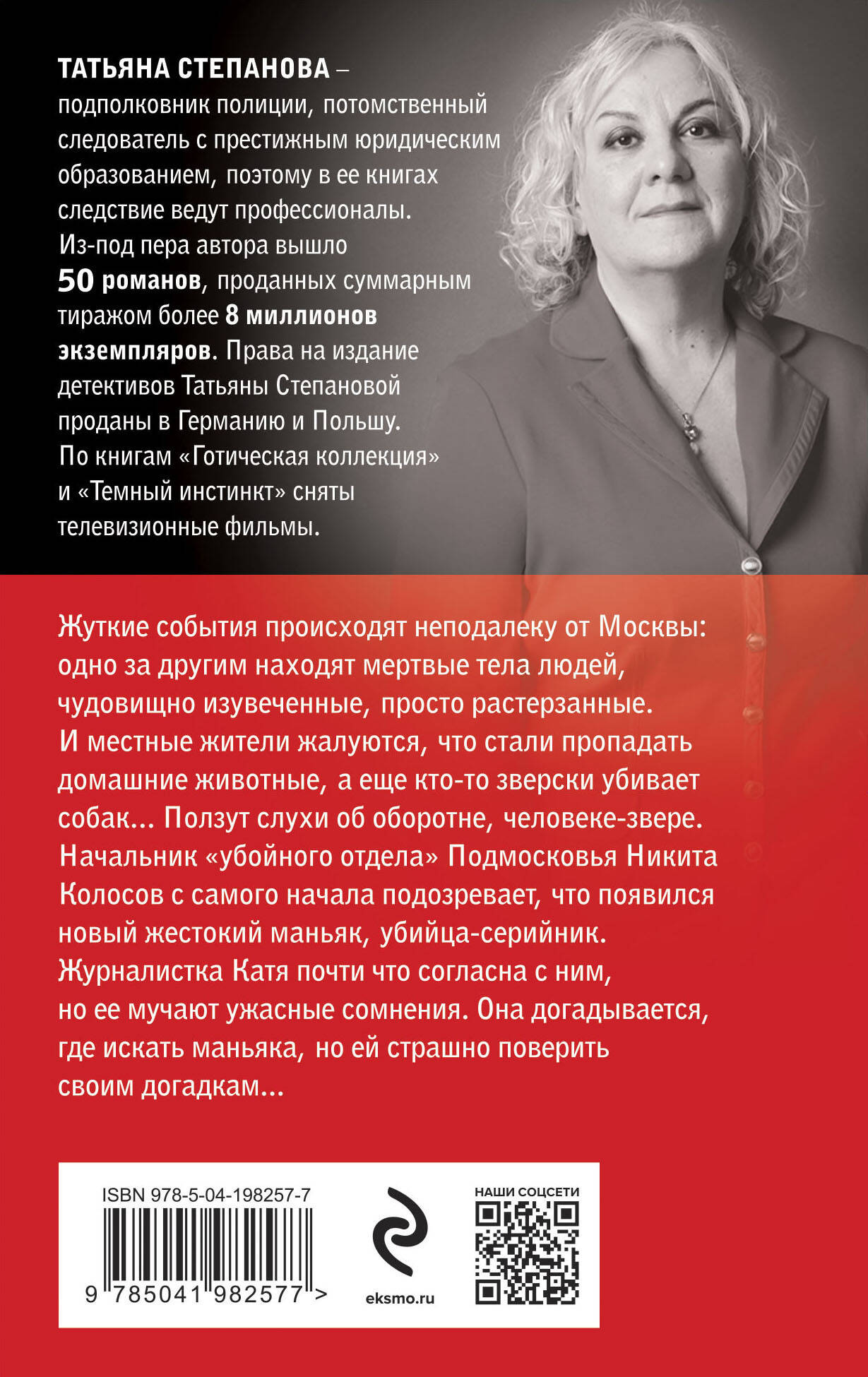 Жуткие события происходят неподалеку от Москвы: одно за другим находят мертвые тела людей, чудовищно изувеченные, просто растерзанные. И местные жители жалуются, что стали пропадать домашние животные, а еще кто-то зверски убивает собак... Ползут слухи об оборотне, человеке-звере. Начальник «убойного отдела» Подмосковья Никита Колосов с самого начала подозревает, что появился новый жестокий маньяк, убийца-серийник. Журналистка Катя почти что согласна с ним, но ее мучают ужасные сомнения. Она догадывается, где искать маньяка, но ей страшно поверить своим догадкам... Романы потомственного следователя Татьяны Степановой позволяют читателю побывать в литературной «комнате страха». Таинственные убийства, почти осязаемая атмосфера преступления, томительное и тревожное ожидание чего-то неведомого, пугающего... Все это Татьяне Степановой удается воспроизвести просто блестяще. Случайные встречи, повседневные дела, незначительные детали изображаются в ее детективах в каком-то особом, драматическом свете, словно безобидный весенний луг перед стремительно надвигающейся грозой.| Издательство | ООО "Издательство "Эксмо" |