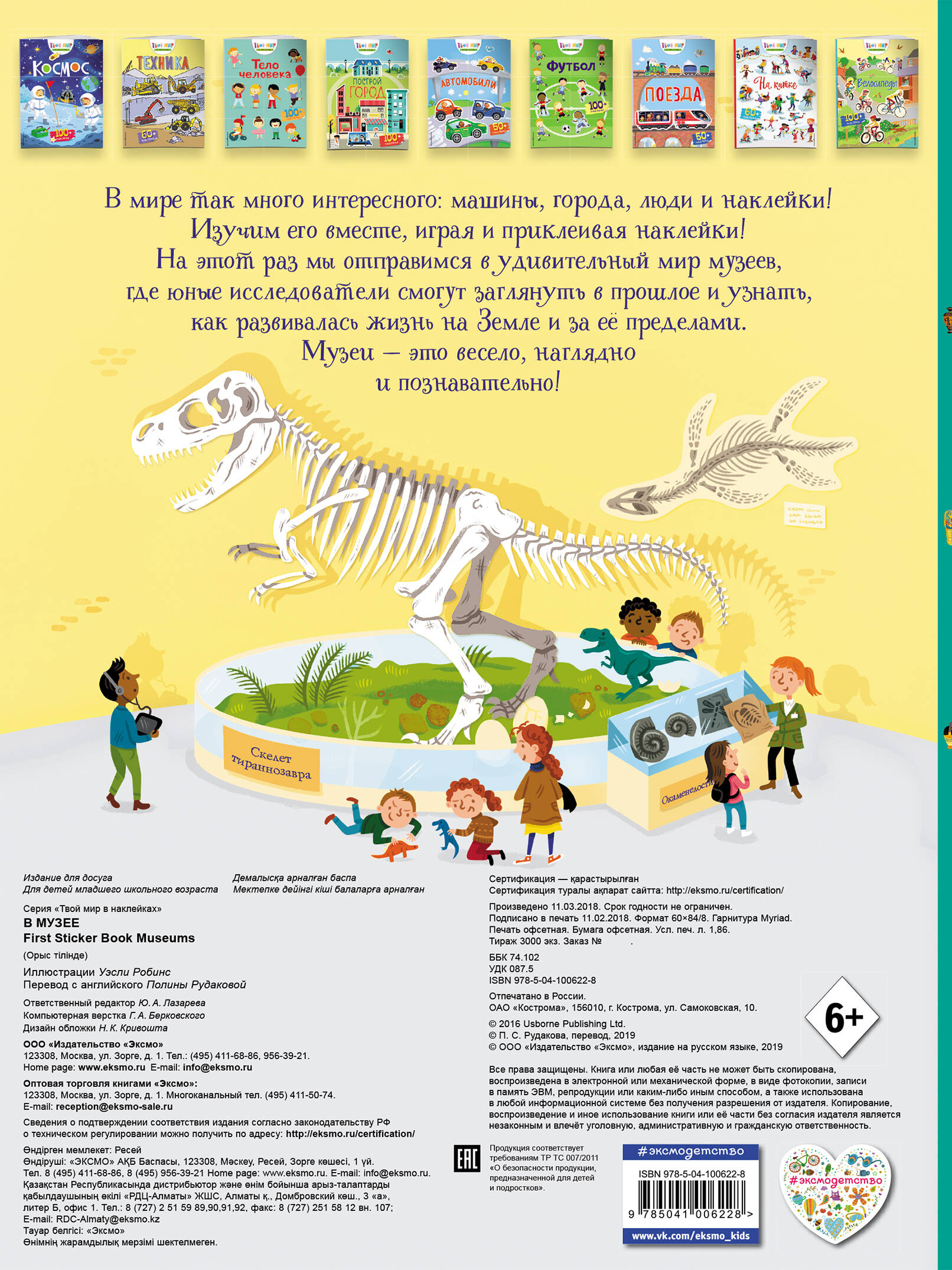 В мире так много интересного: машины, города, люди… и наклейки! Изучим его вместе, играя и приклеивая наклейки! В этот раз юные читатели отправятся и в прошлое, и в будущее! Как? Очень просто - заглянув в музей! Скелеты доисторичсеких гигантов, космические ракеты, самолеты, поезда, картины, игрушки - чего только не найдешь в удивительных музейных коллекциях. Ваш ребенок строгим взглядом сможет оценить все экспонаты и расставить их по местам с помощью красочных наклеек.| Издательство | ООО "Издательство "Эксмо" |