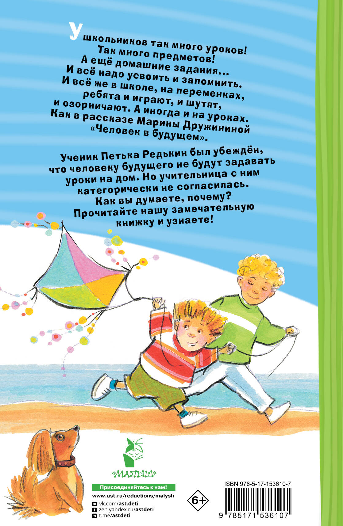 У школьников так много уроков! Так много предметов! А ещё домашние задания... И всё надо усвоить и запомнить. И всё же в школе, на переменках, ребята и играют, и шутят, и озорничают. А иногда и на уроках. Как в рассказе Марины Дружининой «Человек в будущем». Ученик Петька Редькин был убеждён, что человеку будущего не будут задавать уроки на дом. Но учительница с ним категорически не согласилась. Как вы думаете, почему? Прочитайте нашу замечательную книжку и узнаете!| Издательство | Издательство "АСТ" |