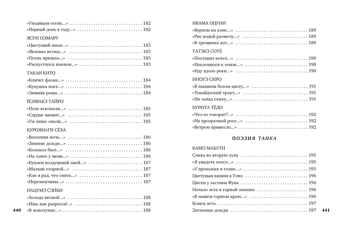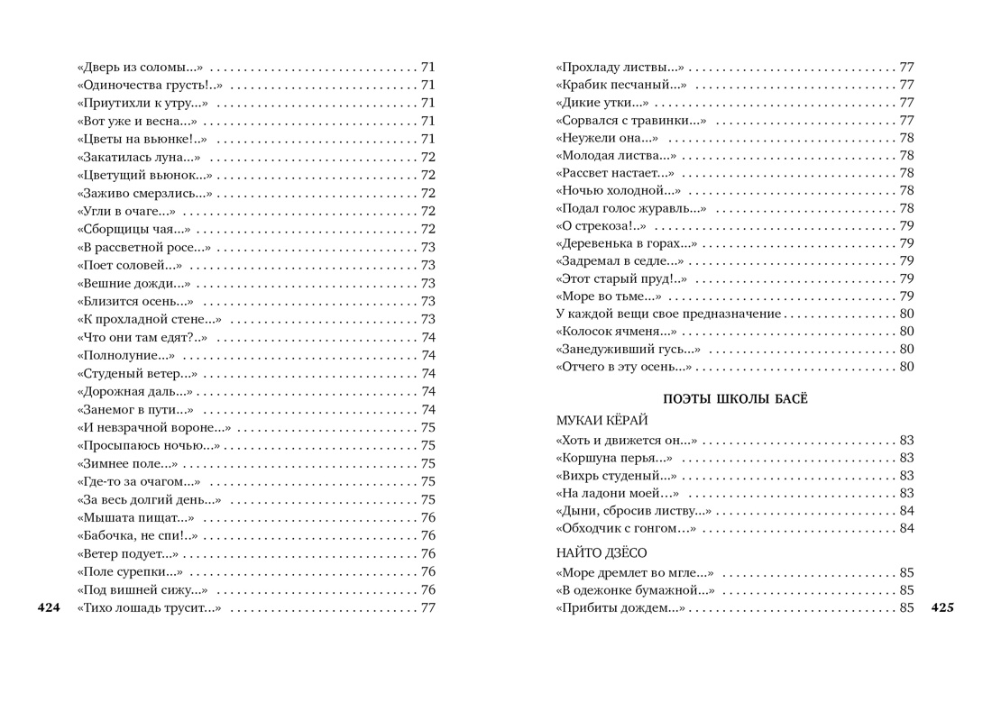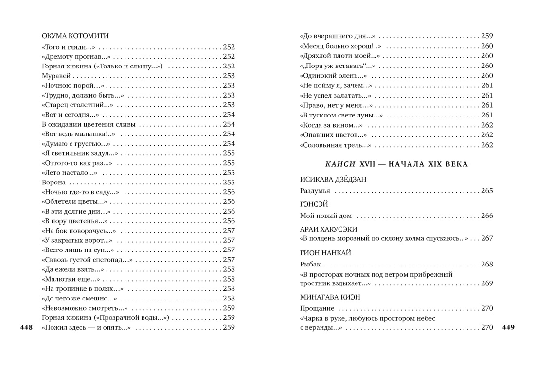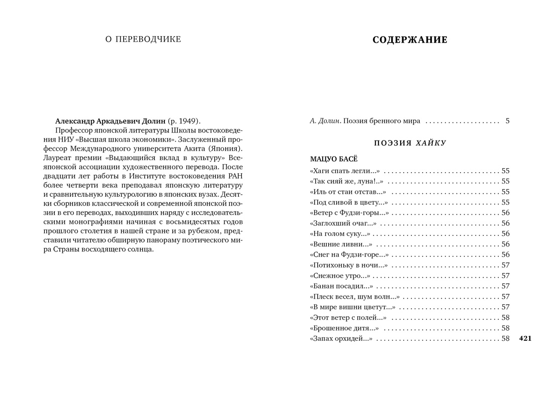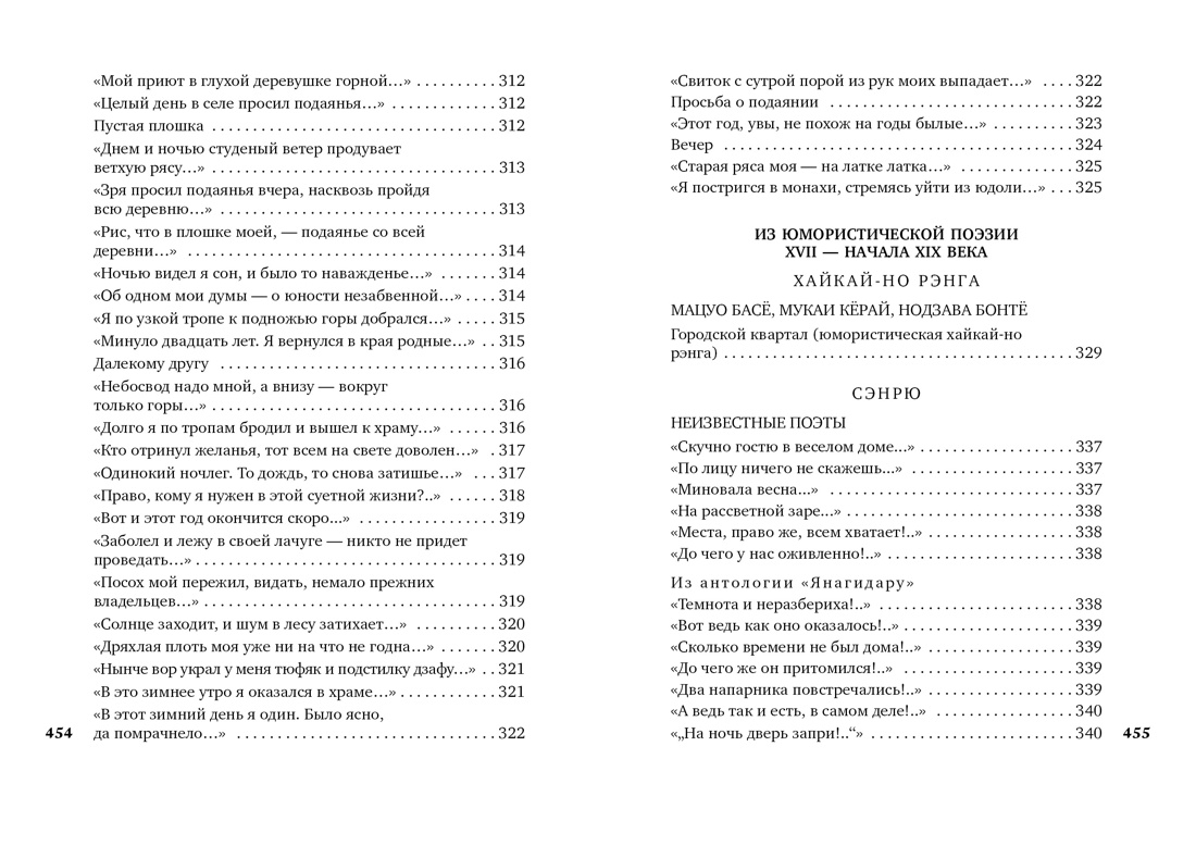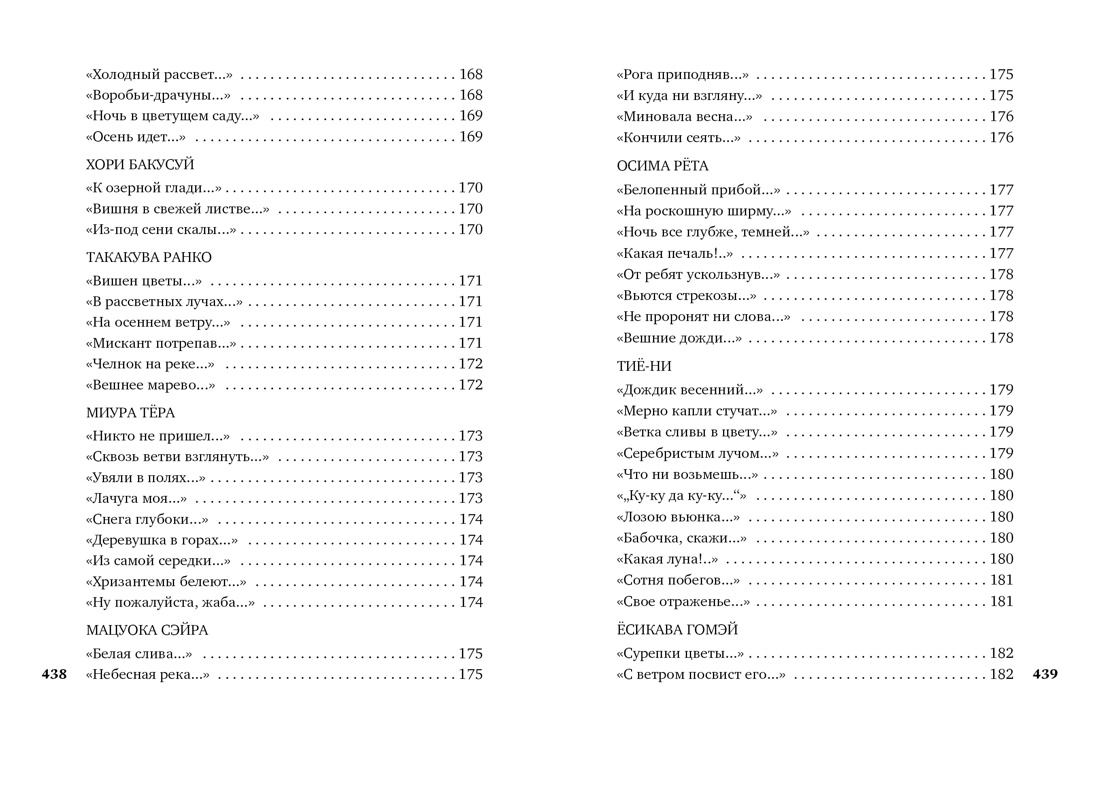 В антологию, подготовленную известным востоковедом и переводчиком японской поэзии Александром Долиным, включены классические шедевры знаменитых поэтов позднего Средневековья (XVII - начала XIX в.). Наряду с такими популярными именами, как Мацуо Басё, Ёса-но Бусон, Кобаяси Исса, Мацунага Тэйтоку, Ихара Сайкаку, Камо Мабути, Одзава Роан Рай Санъё или инок Рёкан, читатель найдет в книге немало новых авторов, чьи творения украшают золотой фонд японской и мировой литературы. В сборнике представлена богатая палитра поэтических жанров: философские и пейзажные трехстишия хайку, утонченные пятистишия вака (танка ), образцы лирической и дидактической поэзии на китайском канси , а также стихи дзэнских мастеров и наставников, в которых тонкость эстетического мироощущения сочетается с эмоциональной напряженностью непрестанного самопознания. Ценным дополнением к шедеврам классиков служат подборки юмористической поэзии (сэнрю, кёка, хайкай-но рэнга), а также переводы фольклорных песен-коута, сложенных обитательницами «веселых кварталов». Книга воссоздает историческую панораму японской поэзии эпохи Эдо в ее удивительном жанрово-стилистическом разнообразии и знакомит читателя с крупнейшими стихотворцами периода японского культурного ренессанса, растянувшегося на весь срок самоизоляции Японии. Издание снабжено вступительной статьей и примечаниями.| Издательство | Азбука |