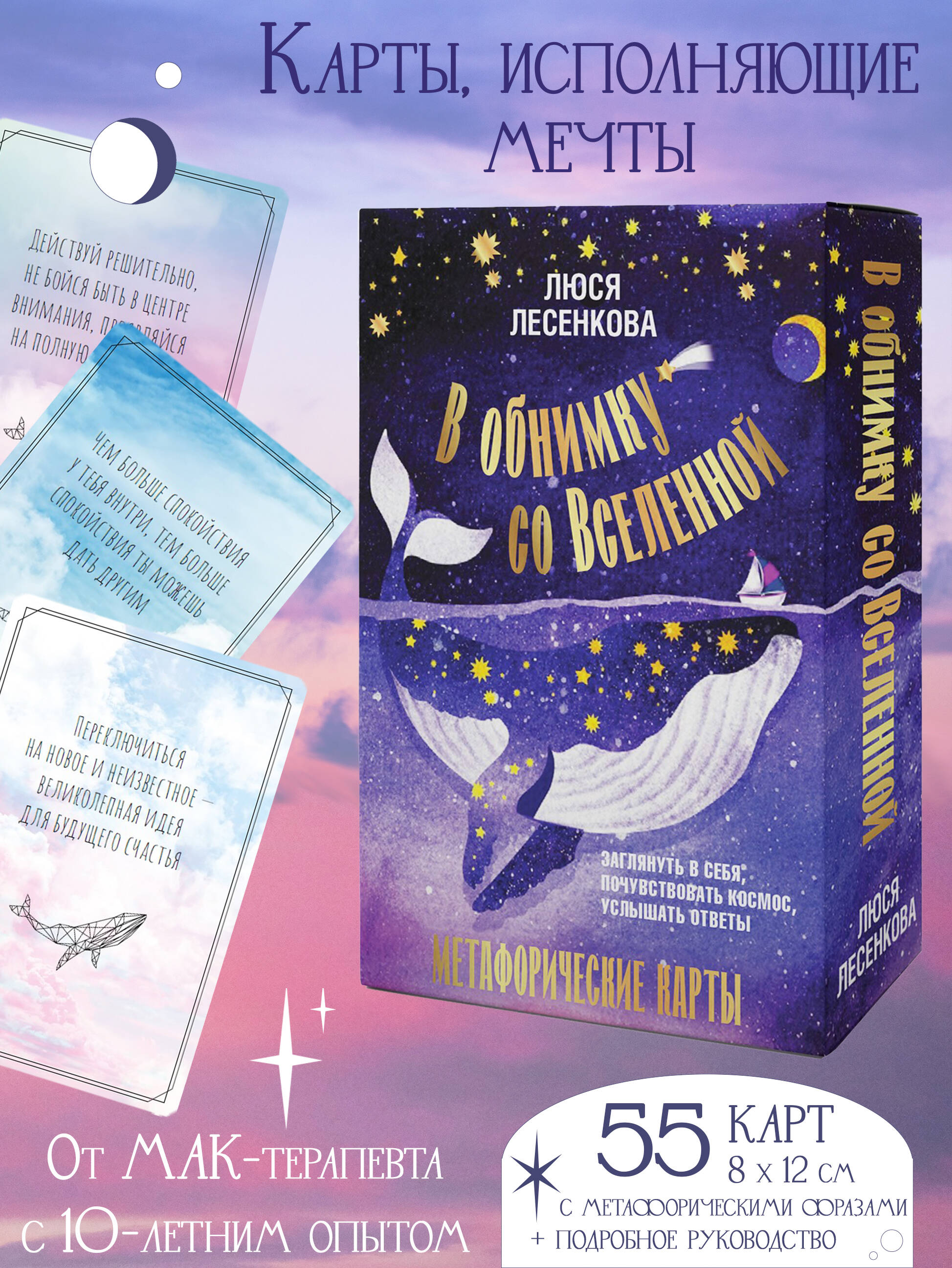 Люся Лесенкова - психолог, МАК-терапевт с опытом более 10 лет, нумеротрактолог. Автор бестселлера "На одной волне со Вселенной". Блог "Просто Лю" насчитывает более 200 000 подписчиков. Метафорические карты - мощный инструмент для работы с собой и подсознанием. Твой личный сундучок ценных, важных и подходящих именно в данный момент ответов, советов и подсказок. Колода "В обнимку со Вселенной" - уютный навигатор, который поможет двигаться по дороге жизни самым увлекательным маршрутом. Ты научишься говорить со Вселенной на ее языке, а также слышать собственный голос, часто заглушаемый чужими голосами. Каждая карта погружает тебя в теплые объятия Вселенной. И в этой атмосфере полного принятия, доверия и заботы ты понимаешь: что чувствуешь, куда и к чему стремишься, как вытащить себя из любой передряги и прийти к любой мечте. Ведь тому, кто наладил крепчайшую дружбу со Вселенной и истинным "Я", по плечу самые высокие вершины! 55 карт с метафорическими фразами и инструкция по работе с колодой.| Издательство | Издательство "АСТ" |