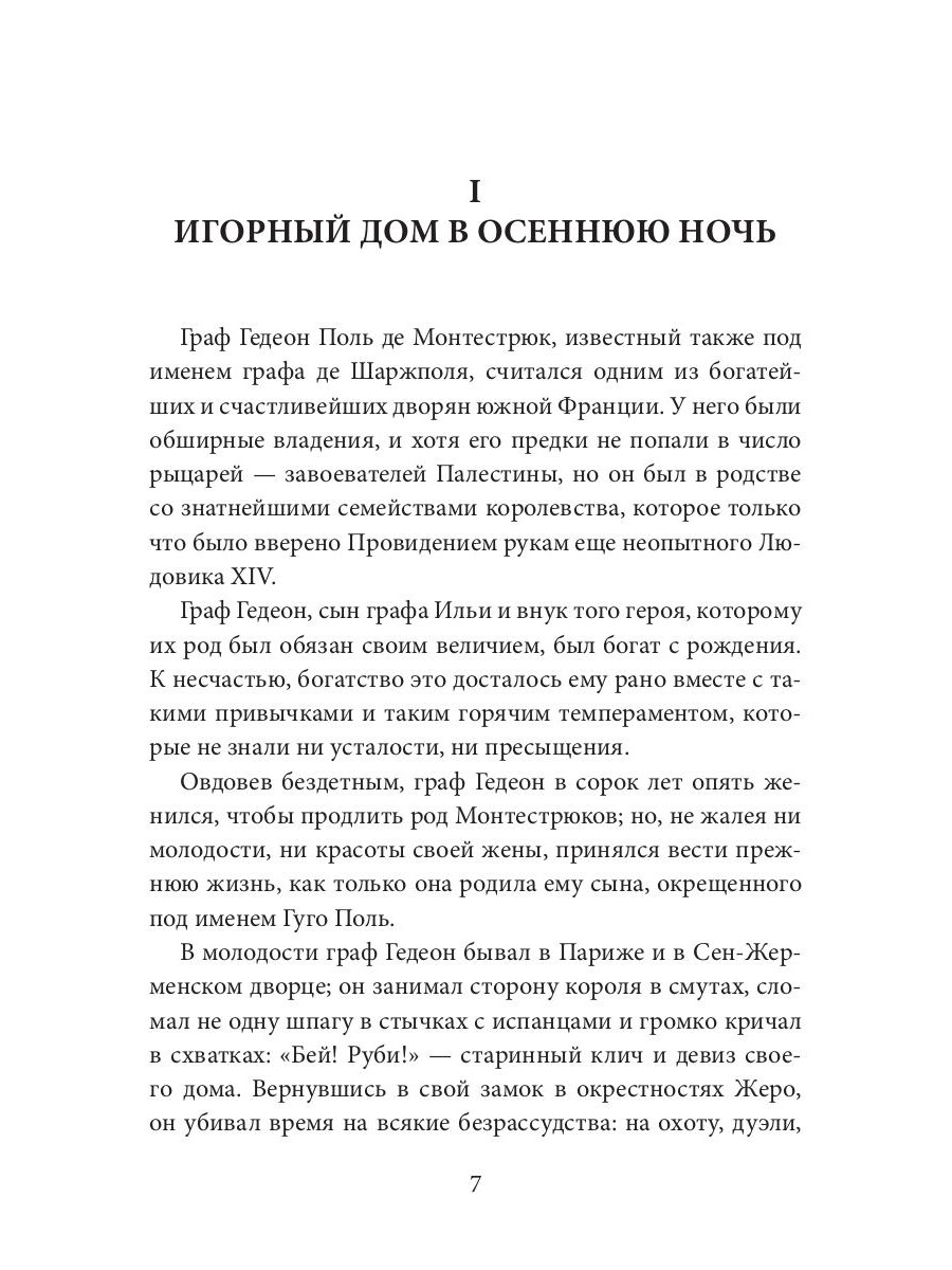 Юный провинциал, граф Гуго де Монтестрюк, воспитанный рано овдовевшей матерью и старым слугой, ставит превыше всего законы чести и верность слову. Отправляясь в столицу, он мечтает о славе своих будущих деяний. В блестящем парижском обществе множество прекрасных женщин, и лишь одну из них граф избирает своей путеводной звездой, но, чтобы по-настоящему обрести её ему необходимо пройти сквозь череду испытаний. Он столкнется с могущественным и коварным соперником, который ведет свою игру. И впереди у героя множество безумных и неожиданных приключений…| Издательство | Т8 RUGRAM |