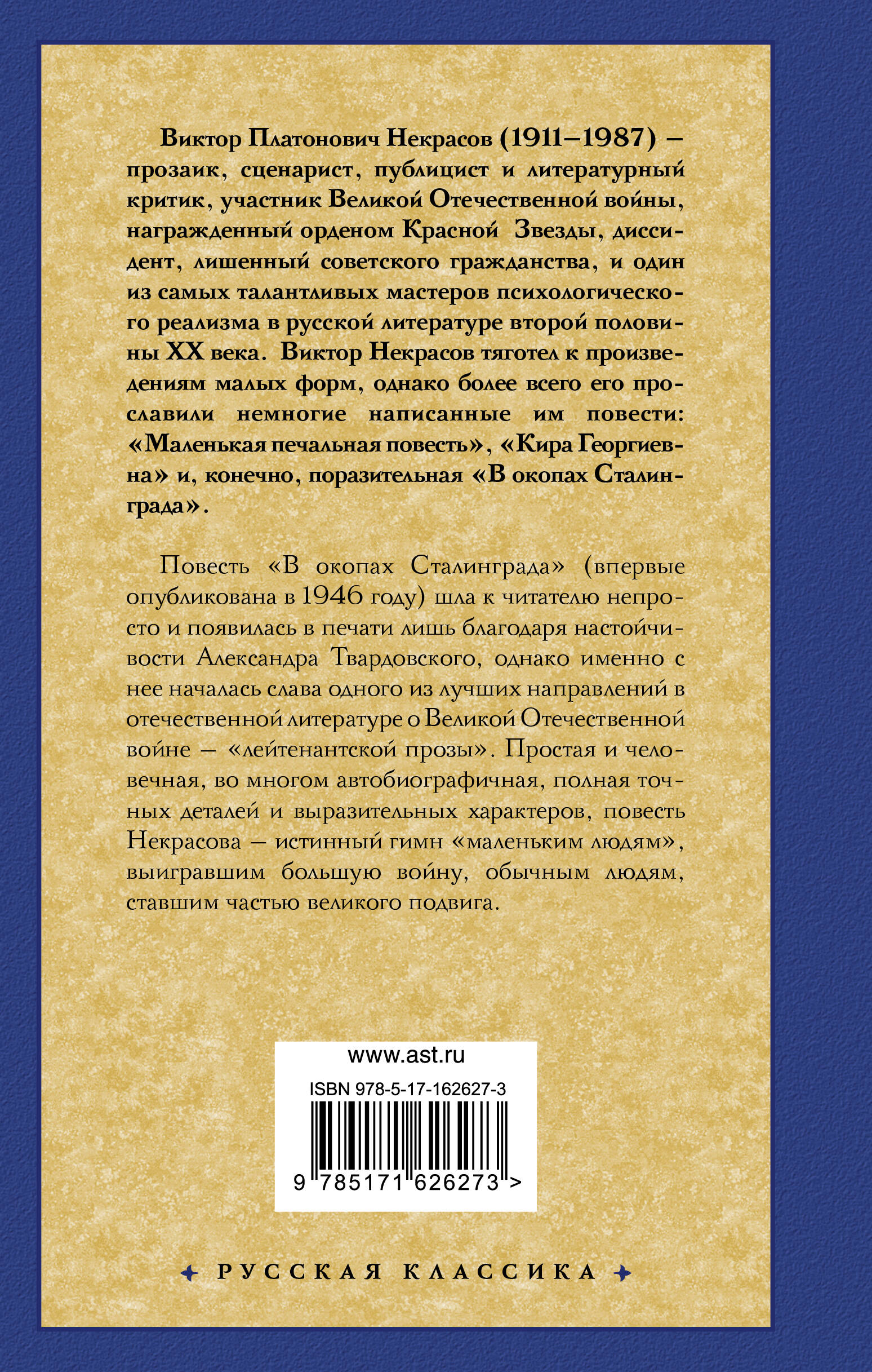 Повесть "В окопах Сталинграда" (впервые опубликована в 1946 году) шла к читателю непросто и появилась в печати лишь благодаря настойчивости Александра Твардовского, однако именно с нее началась слава одного из лучших направлений в отечественной литературе о Великой Отечественной войне - "лейтенантской прозы". Простая и человечная, во многом автобиографичная, полная точных деталей и выразительных характеров, повесть Некрасова - истинный гимн "маленьким людям", выигравшим большую войну, обычным людям, ставшим частью великого подвига.| Издательство | Издательство "АСТ" |