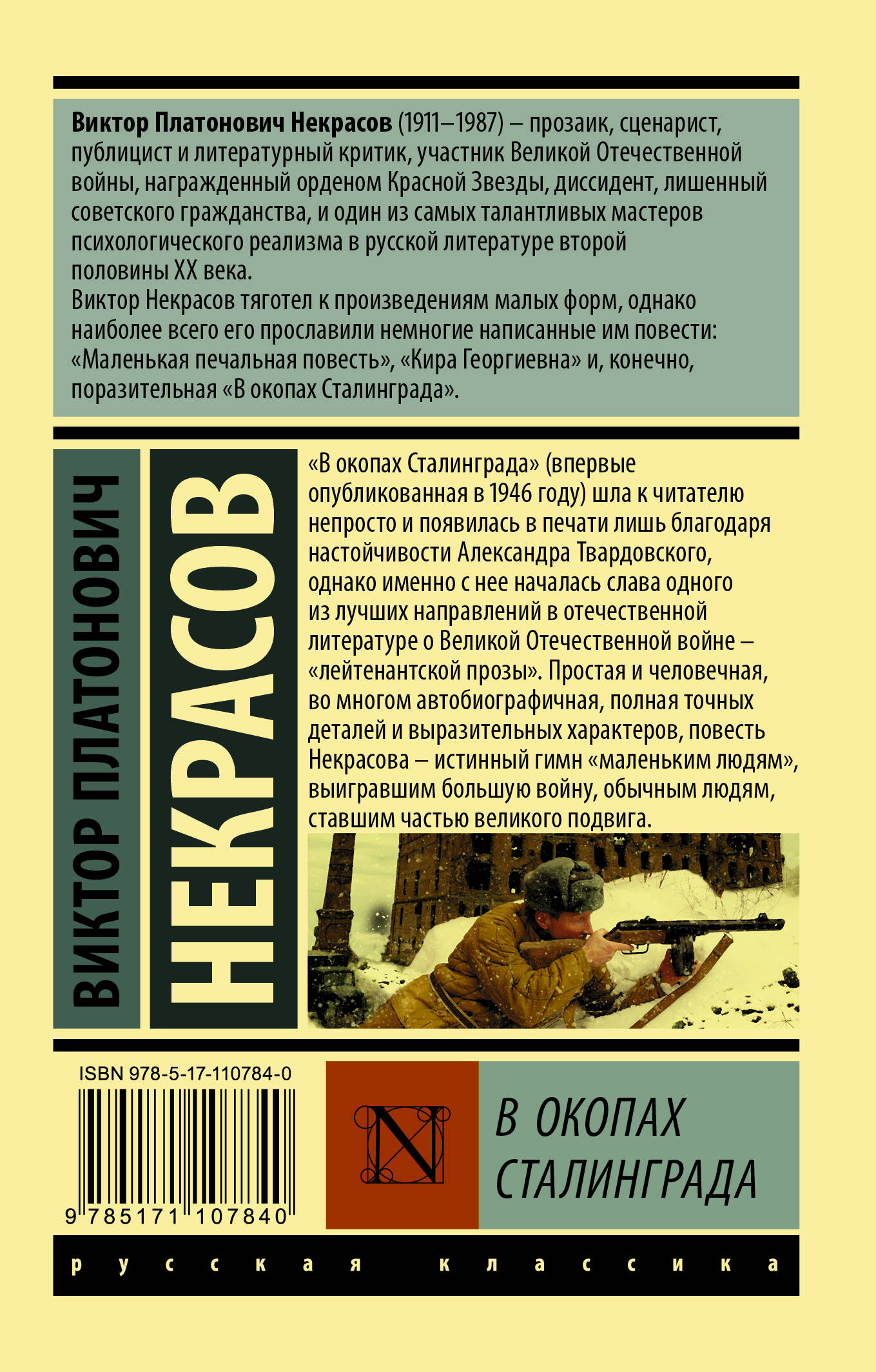 "В окопах Сталинграда" (впервые опубликованная в 1946 году) шла к читателю непросто и появилась в печати лишь благодаря настойчивости Александра Твардовского, однако именно с нее началась слава одного из лучших направлений в отечественной литературе о Великой Отечественной войне - "лейтенантской прозы". Простая и человечная, во многом автобиографичная, полная точных деталей и выразительных характеров, повесть Некрасова - истинный гимн "маленьким людям", выигравшим большую войну, обычным людям, ставшим частью великого подвига.| Издательство | ИЗДАТЕЛЬСТВО "АСТ" |