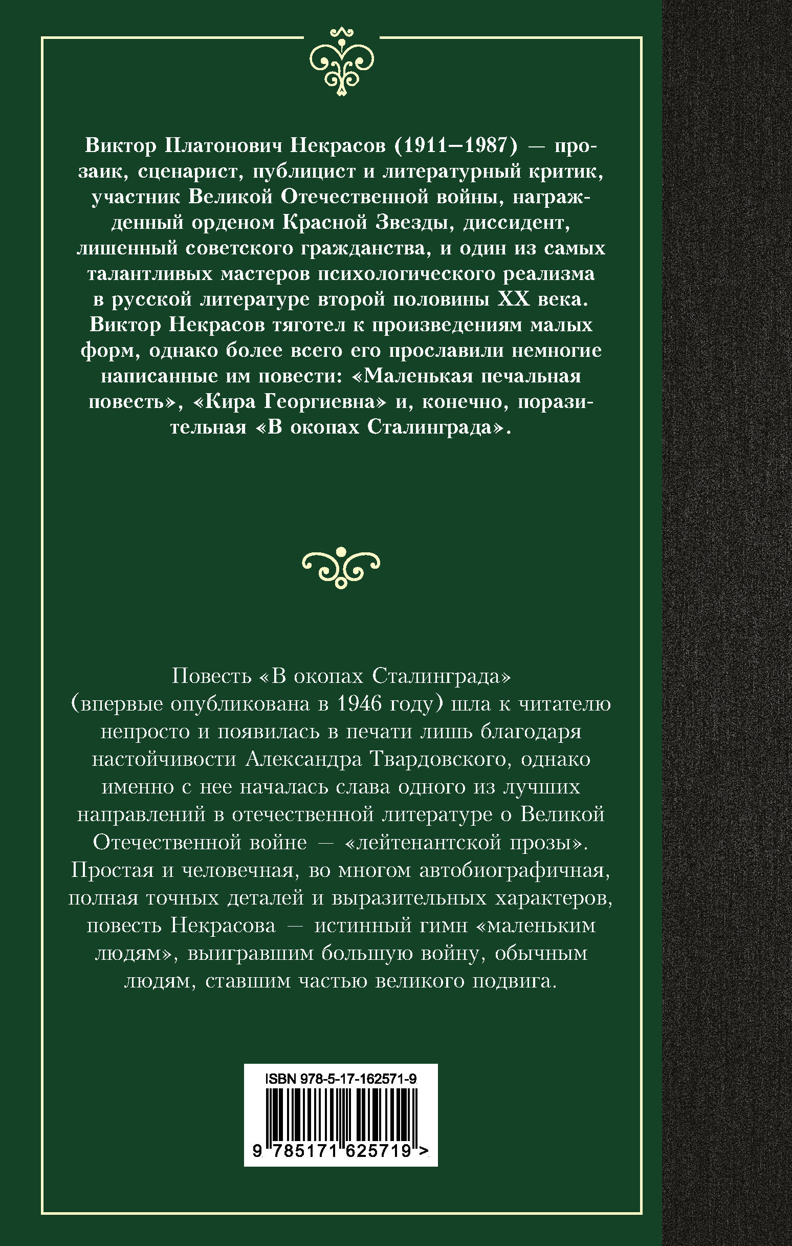 Повесть "В окопах Сталинграда" (впервые опубликована в 1946 году) шла к читателю непросто и появилась в печати лишь благодаря настойчивости Александра Твардовского, однако именно с нее началась слава одного из лучших направлений в отечественной литературе о Великой Отечественной войне - "лейтенантской прозы". Простая и человечная, во многом автобиографичная, полная точных деталей и выразительных характеров, повесть Некрасова - истинный гимн "маленьким людям", выигравшим большую войну, обычным людям, ставшим частью великого подвига.| Издательство | Издательство "АСТ" |