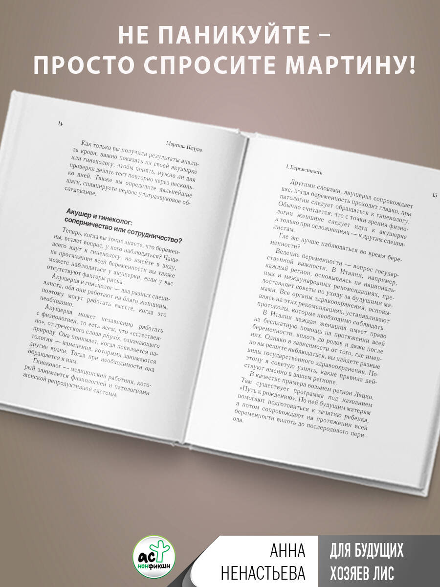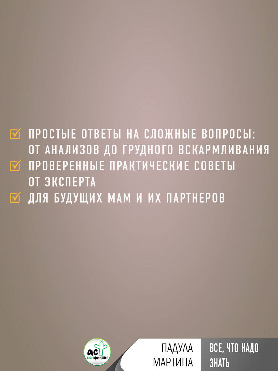 Вот ты увидела две полоски на тесте. А что же теперь? Очень часто радость и эйфория сопровождаются стрессом, сомнениями и вопросами: какие медицинские анализы сделать? Как и когда я могу заниматься спортом? Как правильно кормить грудью? Не всегда легко выплыть из этого водоворота вопросов и опасений. Мартина Падула в своей книге помогает разобраться с этими и другими вопросами, сопровождая будущих родителей на всех этапах беременности, на родах и даже после них. Автор делится полезными советами, развивает ложные, но при этом очень распространенные, мифы, а также рассказывает о том, как прожить первые три месяца после родов максимально осознанно и спокойно. Не паникуйте -- просто спросите Мартину!| Издательство | Издательство "АСТ" |