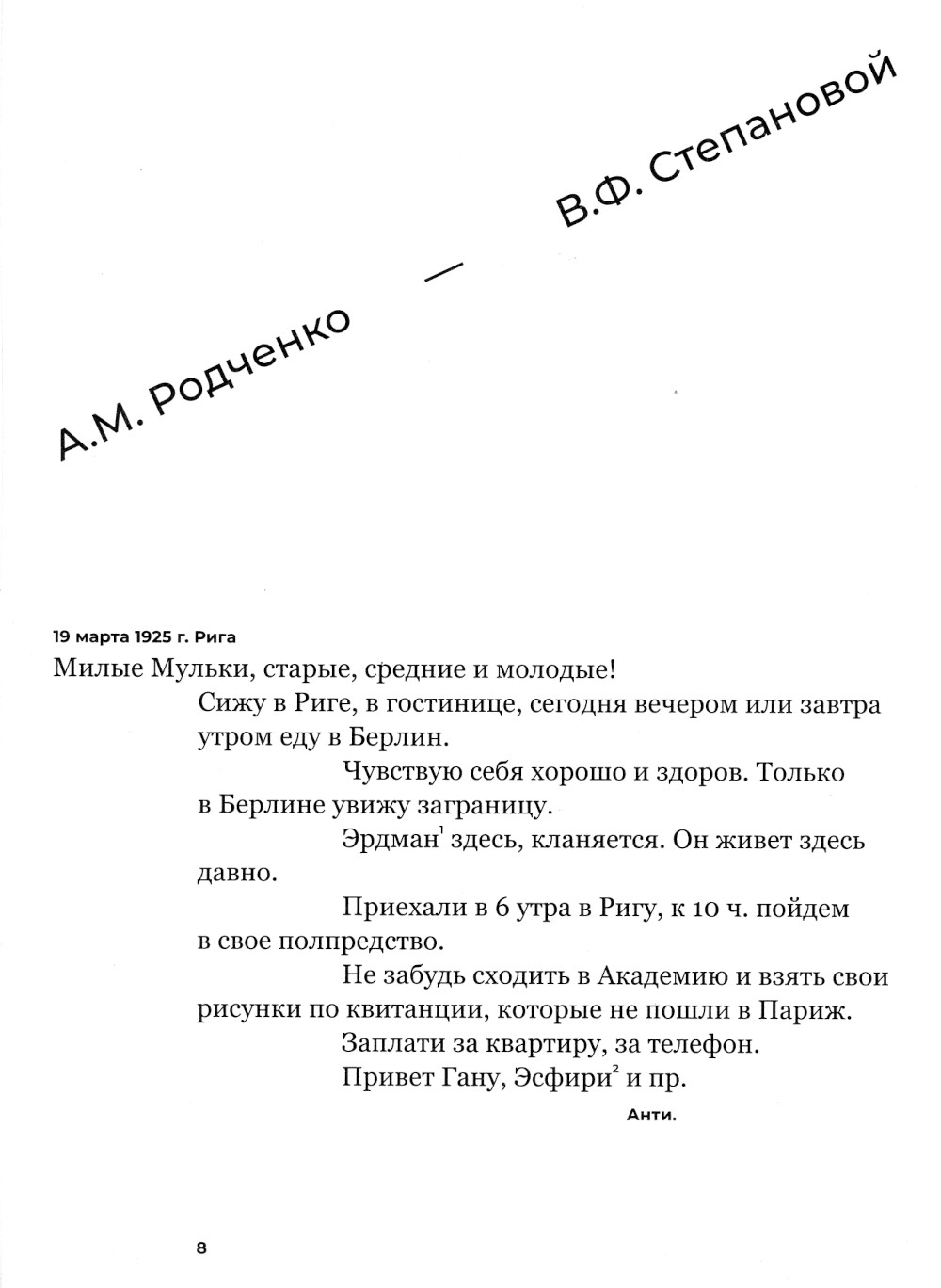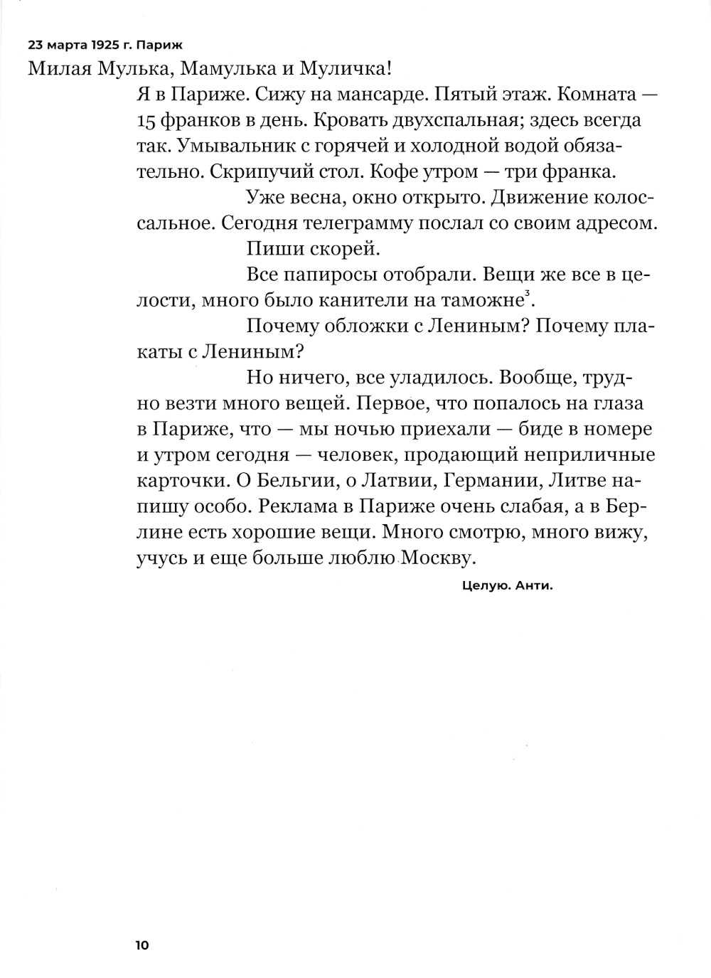 В марте 1925 года Родченко выехал в Париж для работы над оформлением советского раздела Международной выставки декоративного искусства и художественной промышленности. Он писал домой почти ежедневно. Дома Степанова собирала письма, подшивала их в специальную тетрадь. В № 1 журнала «Новый ЛЕФ» за 1927 год была опубликована часть этих писем. В те годы лефовцы-литераторы отстаивали принцип «документальной прозы», то есть максимально фактографическое описание происходящего (принцип интервью, дневника, пачки документов). Предельная откровенность писем Родченко им импонировала. Это был взгляд художника нового типа, конструктивиста, дизайнера одновременно и на Париж, и на Москву со стороны.| Издательство | Ад Маргинем Пресс |