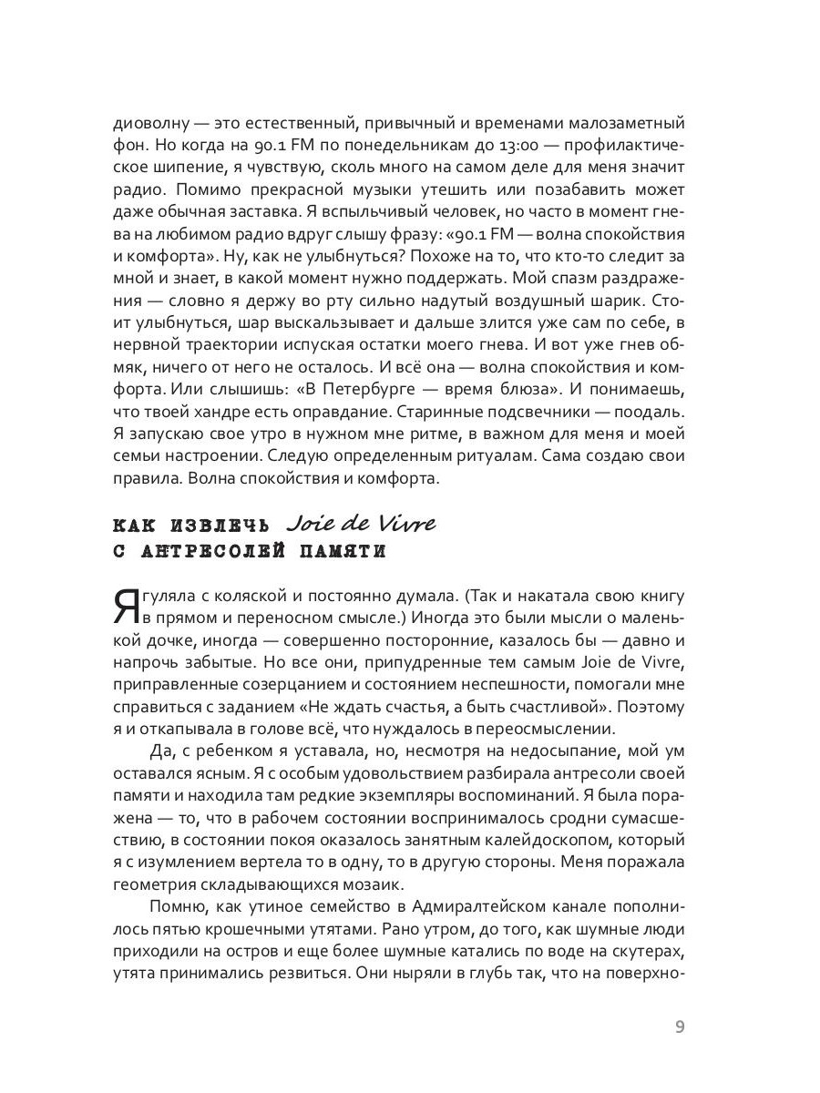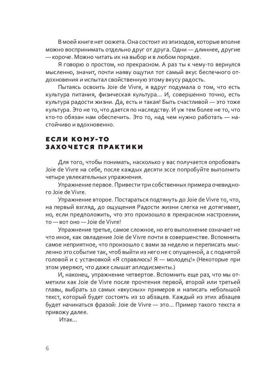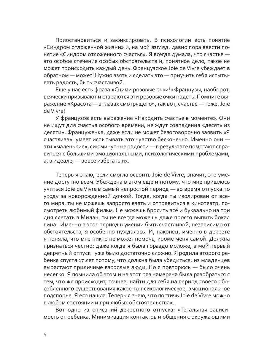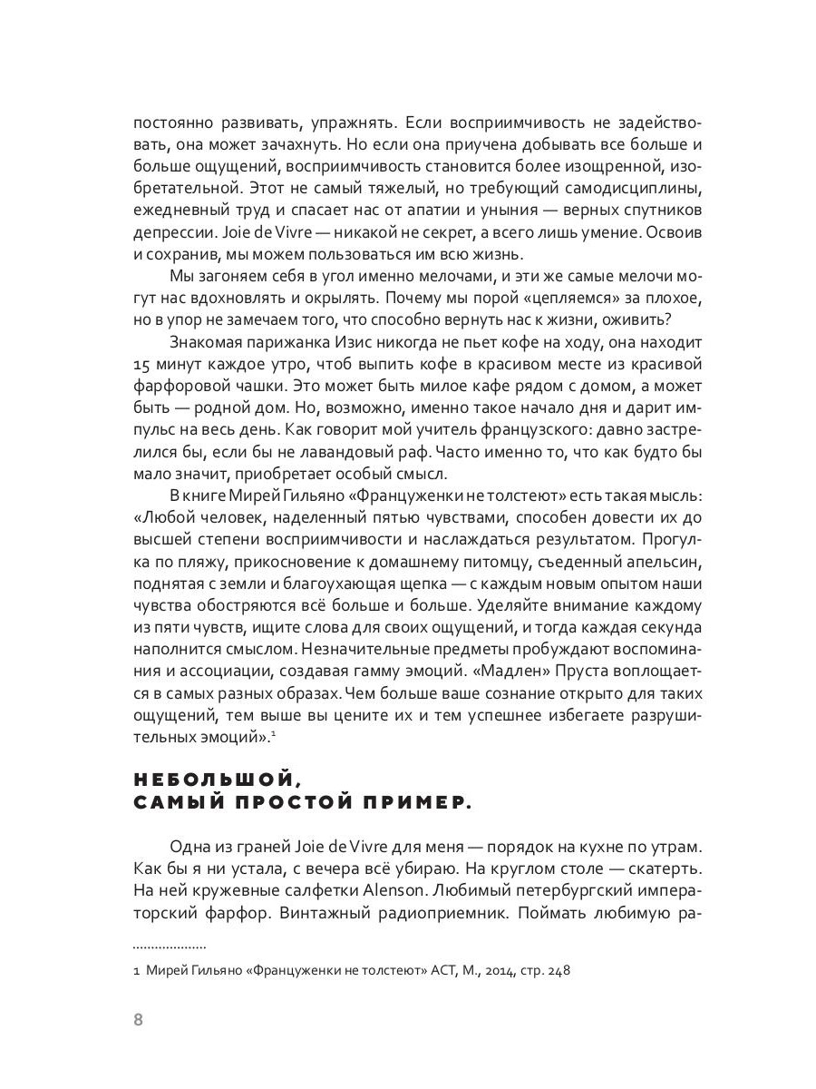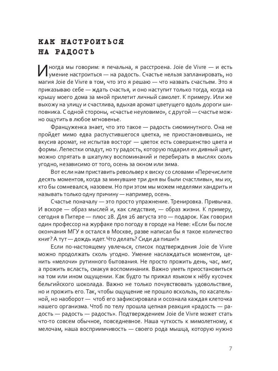 Эта книга об особом умении французов радоваться «мелочам», об их даре из ничего создавать невероятные эмоции и воспоминания, которые остаются в памяти навсегда. Это явление даже имеет у французов конкретную формулировку - Joie de vivre - радость жизни. Как никто другой, они способны наслаждаться моментом, не ищут особых причин для счастья, но умеют обратить в счастье всё, что под рукой. Как следствие, они проживают более качественную, красивую жизнь. В своей книге я наглядно, на примерах, легко, но убедительно рассказываю о том, что встроить Joie de vivre в жизнь любого из нас - это просто. Радость, аппетит к жизни и ее изумительный вкус - всё это не только для французов, но в не меньшей степени для всех нас! Ну и, конечно, в книге много Петербурга, потому что этот город не только место моей жизни, но и вся моя жизнь.| Издательство | Де'Либри |