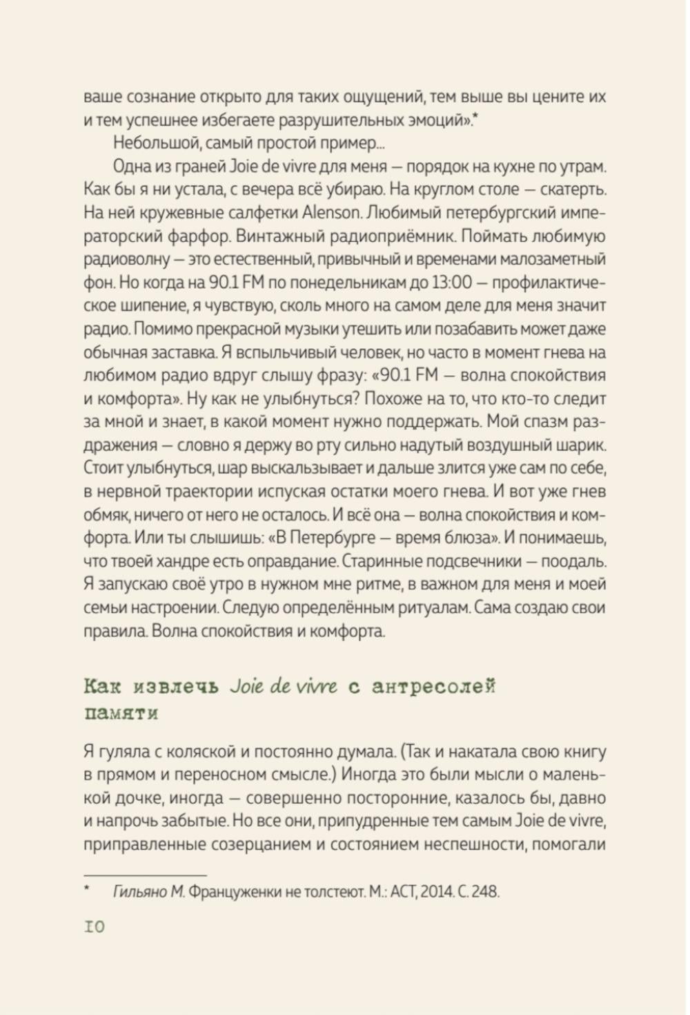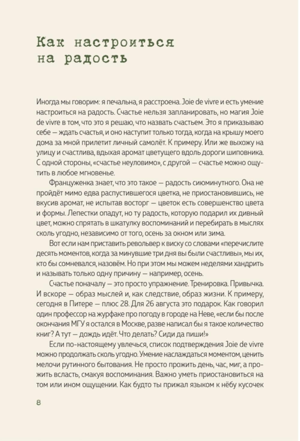 Joie de Vivre - радость жизни, для которой французы не ищут особого повода. Как никто другой, они способны наслаждаться моментом и не ищут причин для счастья, но умеют обратить в счастье всё, что под рукой. Как справиться с эмоциональным напряжением? Как противостоять разрушительным эмоциям, как не оказаться в западне собственной усталости? Как начать воспринимать жизнь и годы, иногда очень похожие друг на друга так, чтобы каждый вечер благодарить мироздание за ещё один дивный, незабываемый день? После прочтения этой книги вы убедитесь, что счастье - это привычка. «В Петербурге время чая. Искусство наслаждаться жизнью каждый день» об особом умении французов радоваться «мелочам», об их даре создавать невероятные эмоции и воспоминания, которые остаются в памяти навсегда: «Joie de vivre» - радость жизни. В книге Лилия Шпренгер наглядно, на примерах, легко, но убедительно рассказывает о том, как встроить Joie de vivre в жизнь. Радость, аппетит к жизни и ее изумительный вкус - всё это не только для французов, но в не меньшей степени - для каждого из нас! А размышления о радости в жизни проходят на улочках Петербурга, у изворотливых каналов, в уютный чайных, в садах и парках с их невероятными видами и интересными знакомствами.| Издательство | Питер |