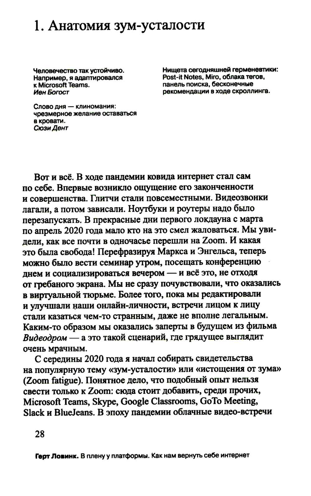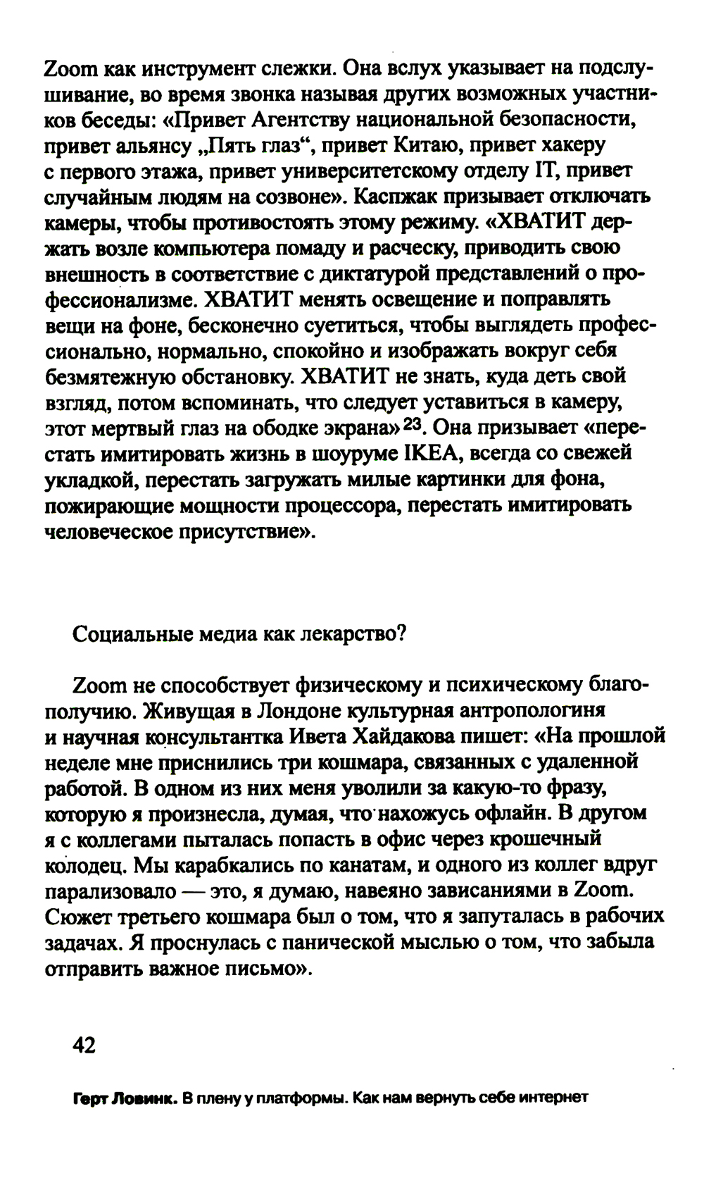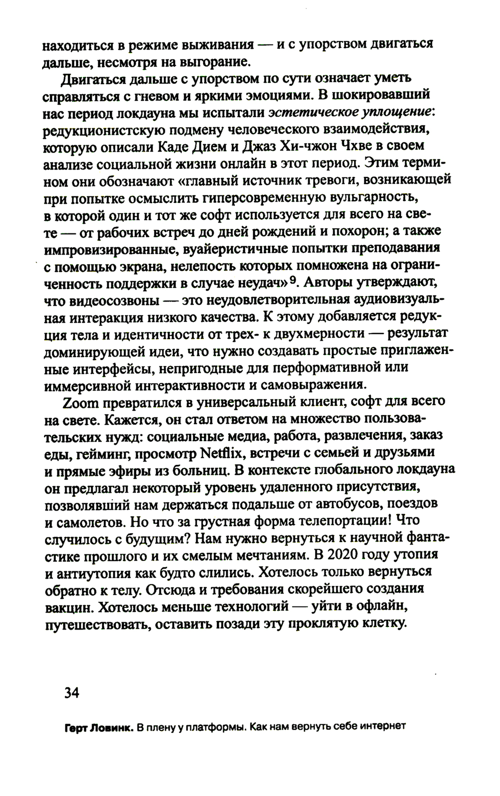 В плену у платформы. Как нам вернуть себе интернет - сборник написанных в годы пандемии COVID-19 эссе нидерландского теоретика медиа Герта Ловинка, в которых он продолжает исследовать захват интернета платформами-гигантами и то, как это влияет на активизм, политику эмоций, искусство, финансы и повседневность. Во время локдауна большинству из нас пришлось окончательно сдаться в плен цифровым платформам, что сделало прорыв к новым формам совместности и самоорганизации еще более затруднительным - и еще более актуальным. Однако, как и в предыдущих работах, Ловинк не ограничивается критической диагностикой, а пытается обновить через острые вопросы и новые концепты теорию и практику медиа-активизма с прицелом на иное, коллективное будущее.| Издательство | Ад Маргинем Пресс |