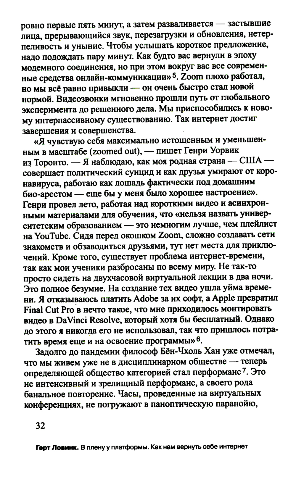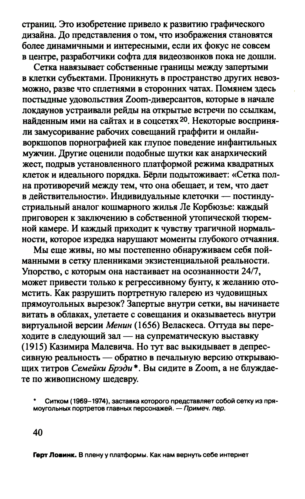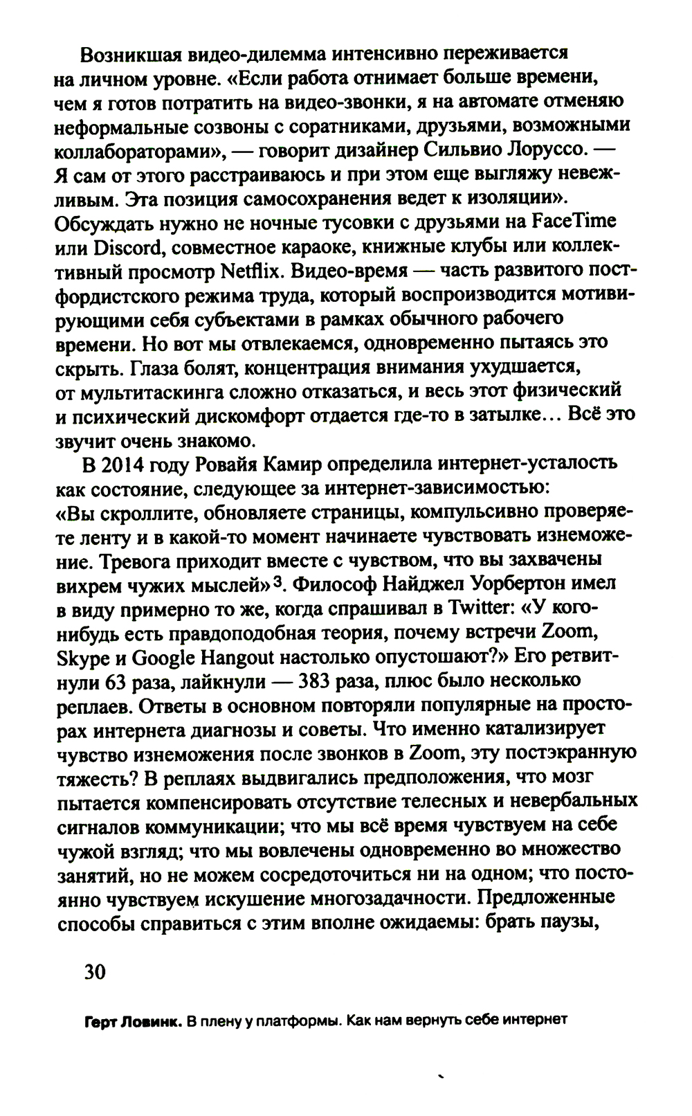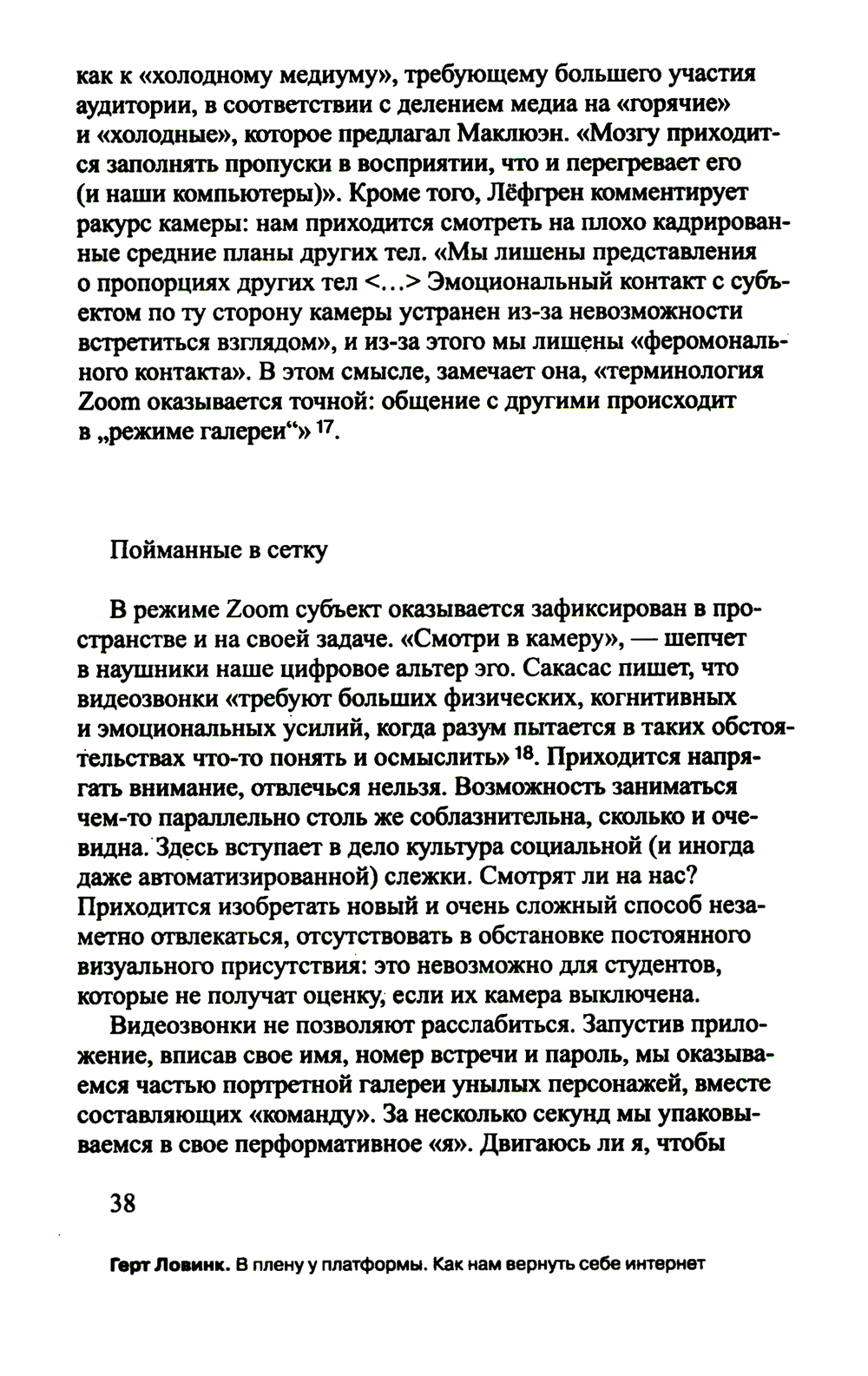 В плену у платформы. Как нам вернуть себе интернет - сборник написанных в годы пандемии COVID-19 эссе нидерландского теоретика медиа Герта Ловинка, в которых он продолжает исследовать захват интернета платформами-гигантами и то, как это влияет на активизм, политику эмоций, искусство, финансы и повседневность. Во время локдауна большинству из нас пришлось окончательно сдаться в плен цифровым платформам, что сделало прорыв к новым формам совместности и самоорганизации еще более затруднительным - и еще более актуальным. Однако, как и в предыдущих работах, Ловинк не ограничивается критической диагностикой, а пытается обновить через острые вопросы и новые концепты теорию и практику медиа-активизма с прицелом на иное, коллективное будущее.| Издательство | Ад Маргинем Пресс |