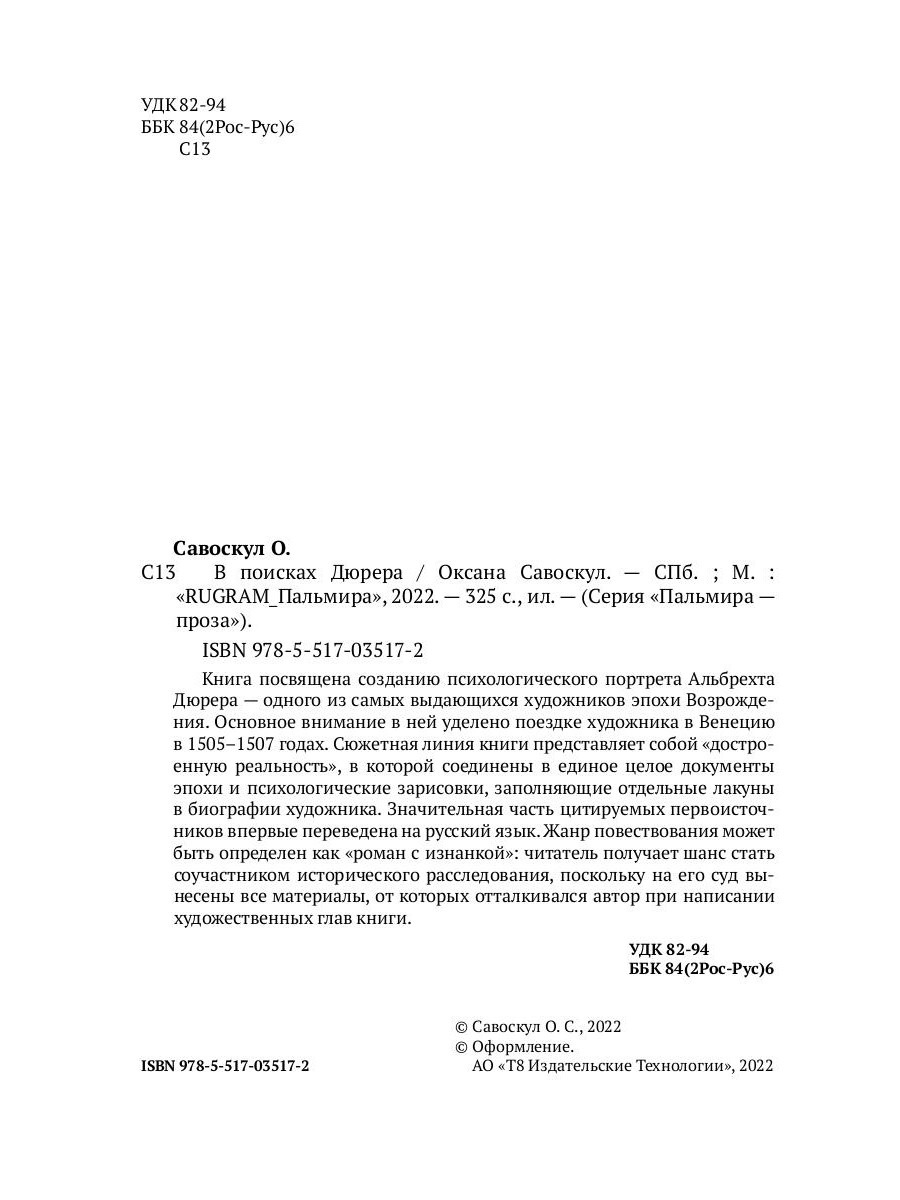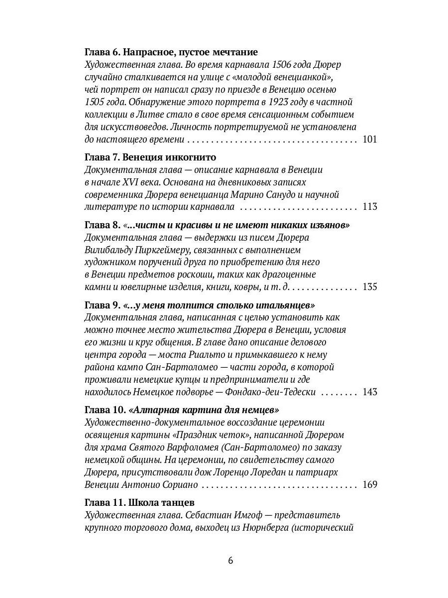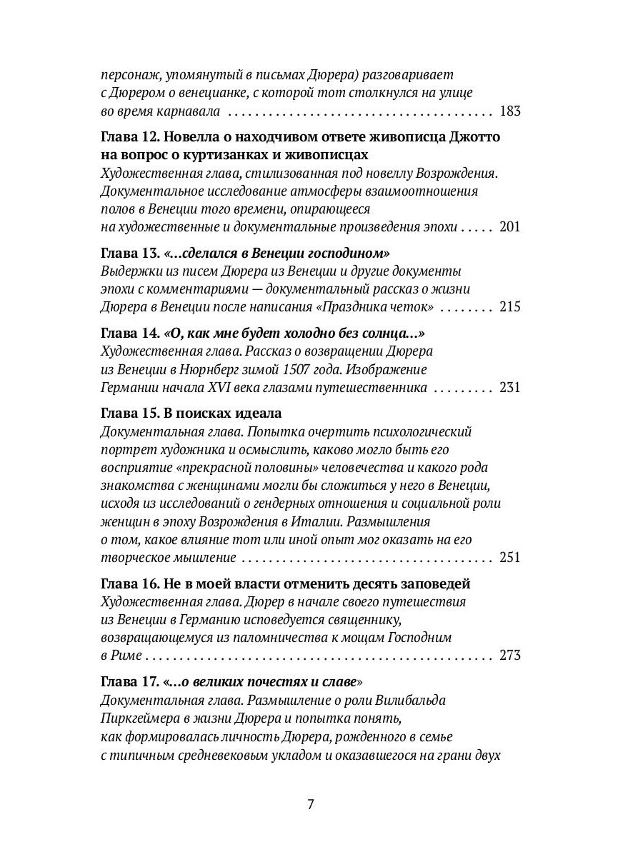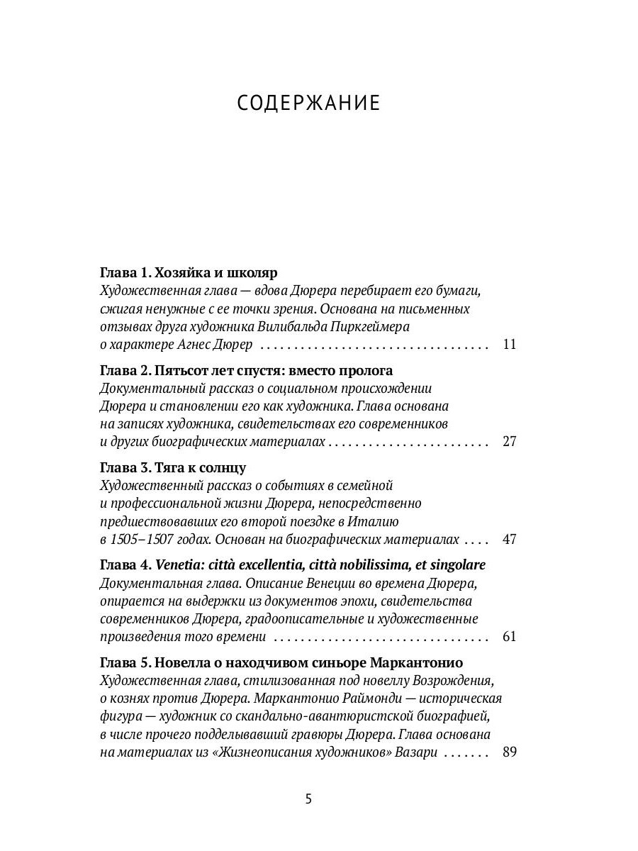 Книга посвящена созданию психологического портрета Альбрехта Дюрера - одного из самых выдающихся художников эпохи Возрождения. Основное внимание в ней уделено поездке художника в Венецию в 1505-1507 годах. Сюжетная линия книги представляет собой «достроенную реальность», в которой соединены в единое целое документы эпохи и психологические зарисовки, заполняющие отдельные лакуны в биографии художника. Значительная часть цитируемых первоисточников впервые переведена на русский язык. Жанр повествования может быть определен как «роман с изнанкой»: читатель получает шанс стать соучастником исторического расследования, поскольку на его суд вынесены все материалы, от которых отталкивался автор при написании художественных глав книги.