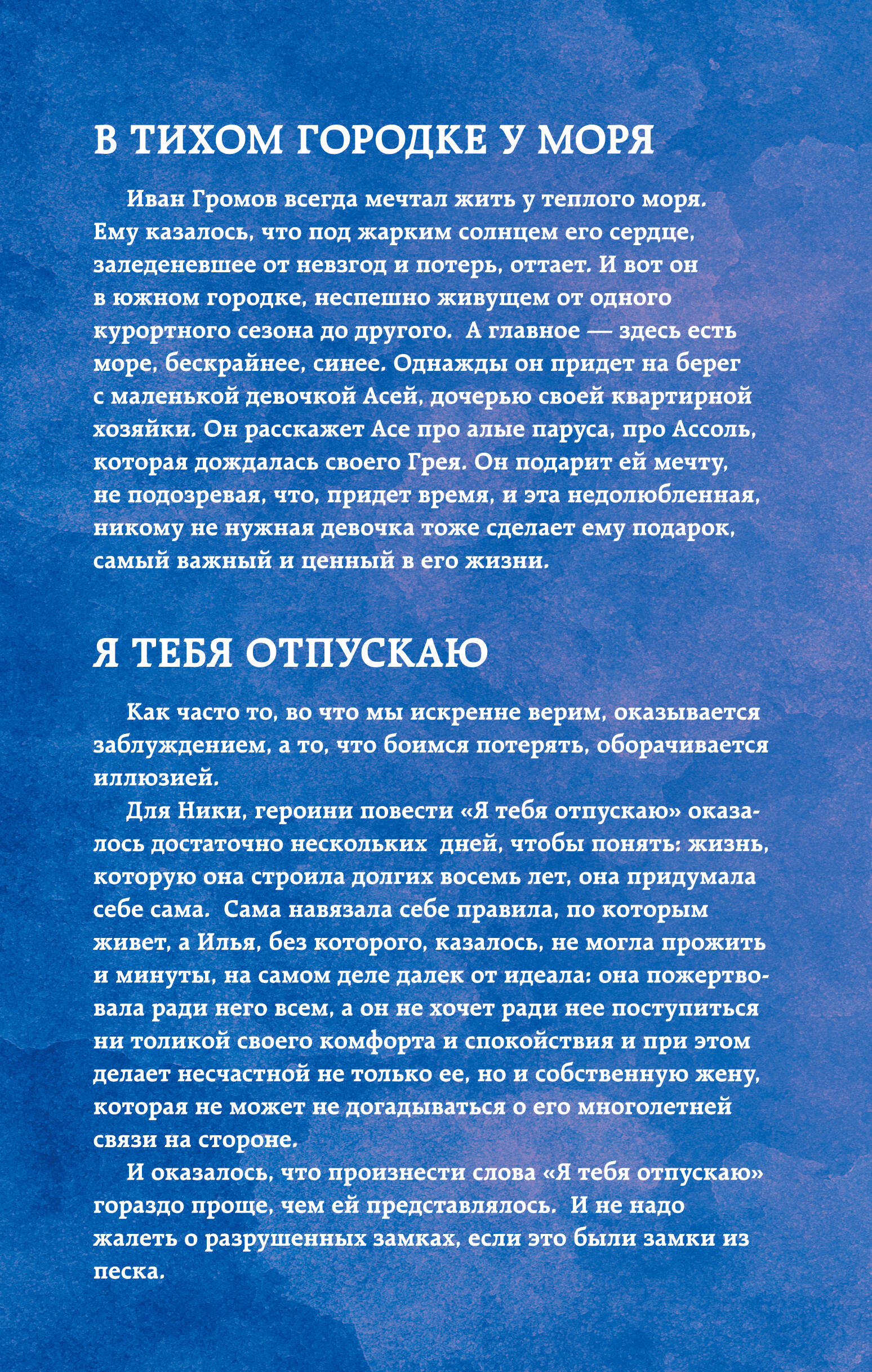 «В тихом городке у моря» «Я тебя отпускаю» Мария Метлицкая пишет о самых обычных людях - мужчинах и женщинах, которые отчаянно ищут счастье. Им не нужны киношные страсти, они не мечтают о сказочном богатстве. Семья, родной человек, которому можно доверять, на которого можно положиться, с которым есть о чем помолчать - вот что для них счастье. Кто-то его находит, кто-то нет. Но каждый из них верит, что это счастье есть и рано или поздно они его найдут.| Издательство | ООО "Издательство "Эксмо" |