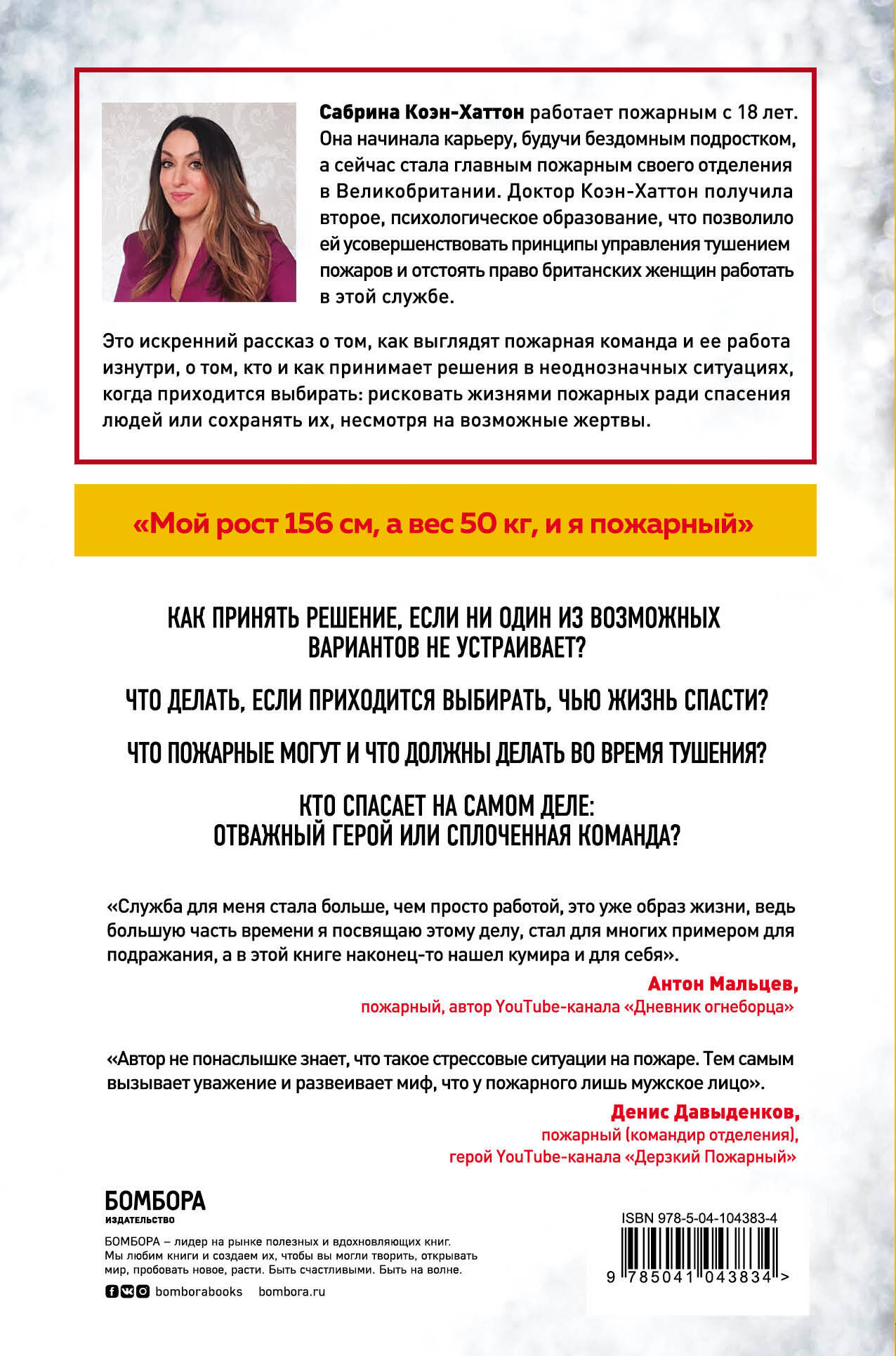 Что вы выберете при принятии важного решения: довериться интуиции или хорошенько все обдумать? А если от этого зависят жизни нескольких десятков людей? Если при этом на раздумья у вас всего пара минут? Скорее всего, вы уже ощущаете легкую панику из-за всех этих условий. Однако для пожарных такой стресс - неотъемлемая часть работы, к которой поневоле приходится адаптироваться. Сабрина Коэн-Хаттон, с 18 лет работавшая в спасательной службе, решила не просто найти свой способ сделать это, но помочь всем пожарным спасателям. Она захотела найти наиболее оптимальные алгоритмы принятия трудных решений, когда вокруг пылают здания, гибнут люди, а от тебя зависит, как будут действовать пожарные. Для этого Сабрина Коэн-Хаттон получила докторскую степень по психологии и провела грандиозное исследование, в котором изучала, как действуют пожарные, прямо на поле боя. В этой книге доктор Коэн-Хаттон показала наиболее яркие моменты из своей практики, когда от одного лишь правильного или неверного решения зависит исход всей битвы с огнем и десятки жизней.