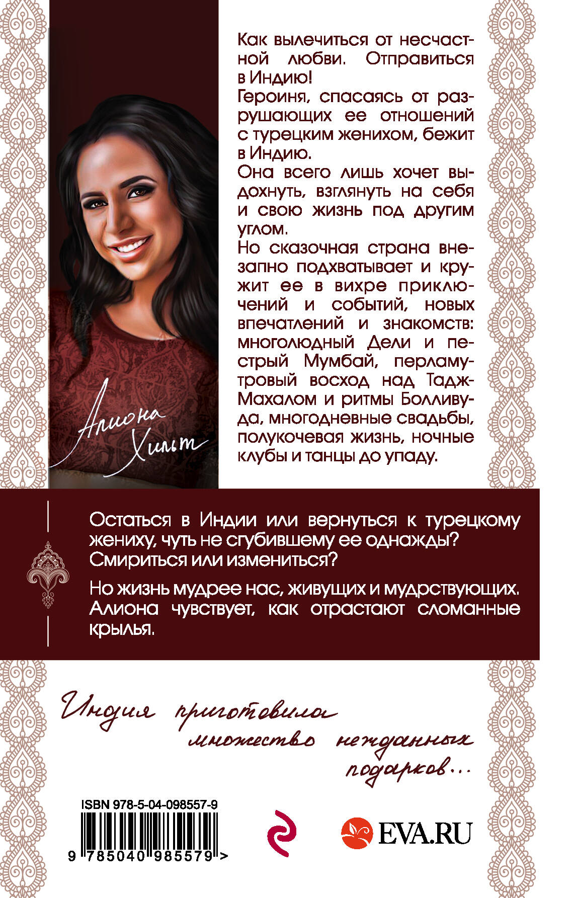Как вылечиться от несчастной любви? Отправиться в Индию! Героиня, спасаясь от разрушающих ее отношений с турецким женихом, бежит в Индию. Она всего лишь хочет выдохнуть, взглянуть на себя и свою жизнь под другими углом. Но сказочная страна внезапно подхватывает и кружит ее в вихре приключений и событий, новых впечатлений и знакомств: многолюдный Дели и пестрый Мумбай, перламутровый восход над Тадж-Махалом и ритмы Болливуда, многодневные свадьбы, полукочевая жизнь, ночные клубы и танцы до упаду. Остаться в Индии или вернуться к турецкому жениху, чуть не сгубившему ее однажды? Смириться или измениться? Но жизнь мудрее нас, живущих и мудрствующих. Алиона чувствует, как отрастают сломанные крылья.| Издательство | ООО "Издательство "Эксмо" |