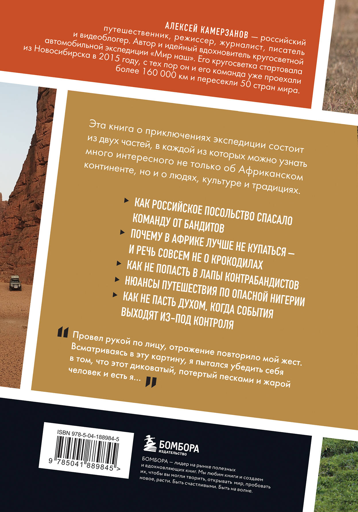 Алексей Камерзанов - российский путешественник, режиссер, журналист, писатель и видеоблогер. Его первая автомобильная кругосветка «Мир наш» стартовала из Новосибирска в 2015 году, с тех пор он и его команда исследуют различные места планеты Земля и уже проехали более 160 000 километров. На каждом этапе своего нового путешествия команда снимает сериал о своих приключениях и делится им на различных телеканалах и в социальных сетях. Эта книга о приключениях экспедиции состоит из двух частей, в каждой из которых можно узнать много интересного не только об африканском континенте, но и о людях, культуре и традициях. • Как российское посольство спасало команду от бандитов. • Почему в Африке лучше не купаться - и речь совсем не о крокодилах. • Как не попасть в лапы контрабандистов. • Нюансы путешествия по опасной Нигерии. Издание дополнено фотографиями из личного архива автора.| Издательство | ООО "Издательство "Эксмо" |