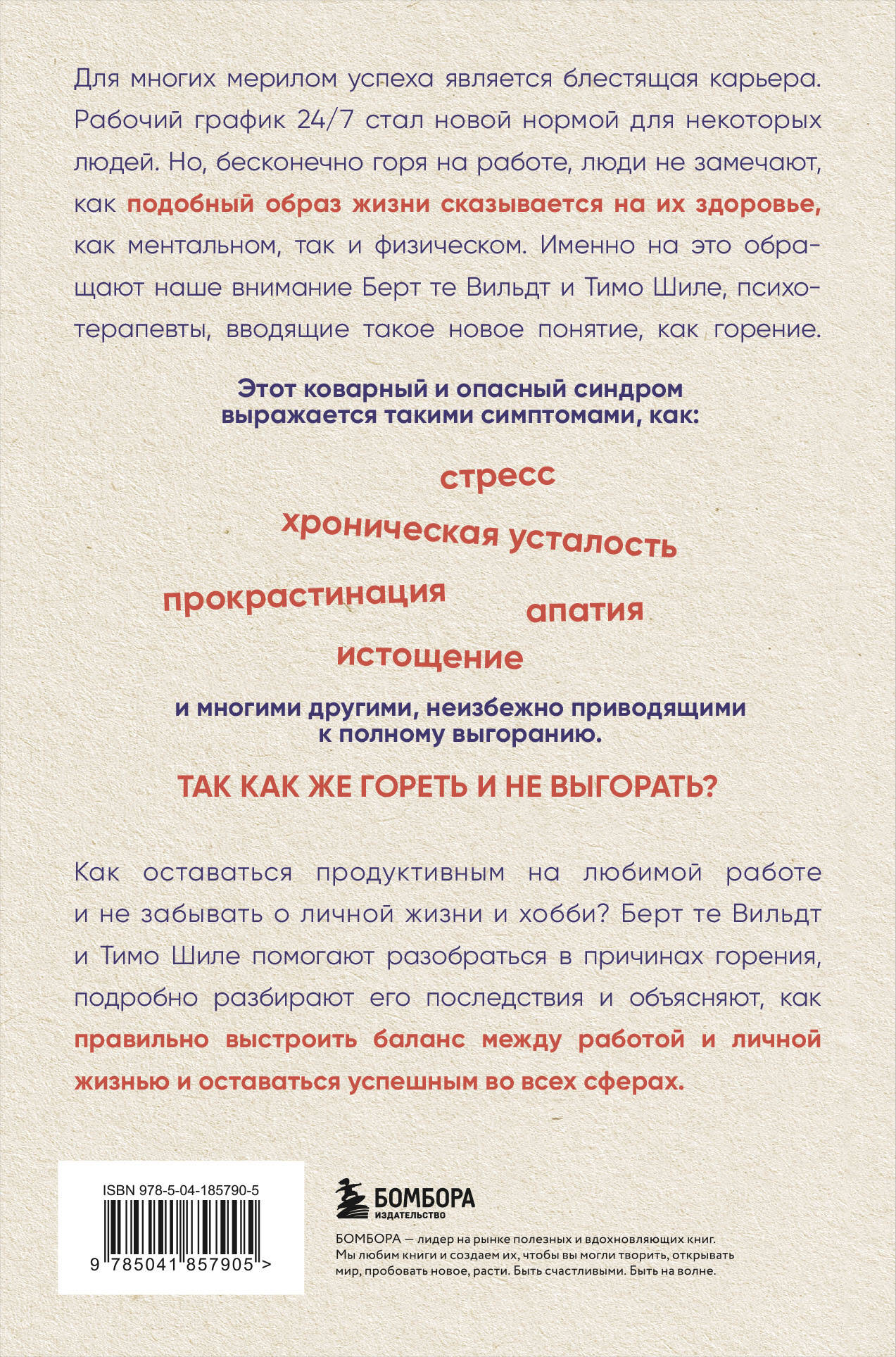Вы постоянно составляете бесконечные списки дел? Стремитесь быть лучшим сотрудником? Выполняете рабочие задачи в свободное время? Тогда эта книга - знак, что пора остановиться на секунду и подумать, нет ли у вас синдрома «горения». Именно о нем рассказывают Берт те Вильдт и Тимо Шиле, психотерапевты, чья профессиональная деятельность направлена на выявление этого недуга и его лечение. Если на работе ваша энергия бьет через край, а все домашние дела вы откладываете на потом. Если в последнее время у вас в приоритете исключительно задачи с дедлайнами. Если вы демонстрируете позитивный настрой, но глубоко в душе ощущаете апатию… то вам непременно стоит пересмотреть свое отношение к работе и жизни в целом. А помогут в этом Берт те Вильдт и Тимо Шиле. Они расскажут о том, как избавиться от фиксации на работе и зажить жизнью, полной радостных и ярких моментов.| Издательство | ООО "Издательство "Эксмо" |