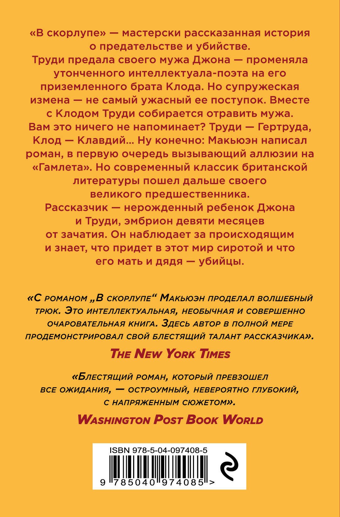 Изящная и смелая трактовка шекспировского "Гамлета" от одного из лучших британских писателей нашего времени. Вот своевременная книга, нарочно не придумаешь: на фоне очередных дебатов о запрете абортов британский ветеран Макьюэн выпускает роман, написанный от лица эмбриона. Является ли зародыш личностью? О да. На четвертой странице он признается в любви к «Улиссу». Станислав Зельвенский, «Афиша» «В скорлупе» - мастерски рассказанная история о предательстве и убийстве. Как видит мир эмбрион? Очевидно, совсем не так, как мы. У него другая мораль, другие взгляды, другой подход к вещам. Он создает десять новых заповедей. Он уже чувствует мир. Он жаждет нового и готов исследовать мир (имея ограниченные возможности). На его пути стоит одно главное препятствие: он не может ничего сделать. Он может только наблюдать. «В скорлупе» - роман, в первую очередь вызывающий аллюзии на «Гамлета». Но современный классик британской литературы пошел дальше своего великого предшественника. Это дерзкая игра на поле великого классика.| Издательство | ООО "Издательство "Эксмо" |