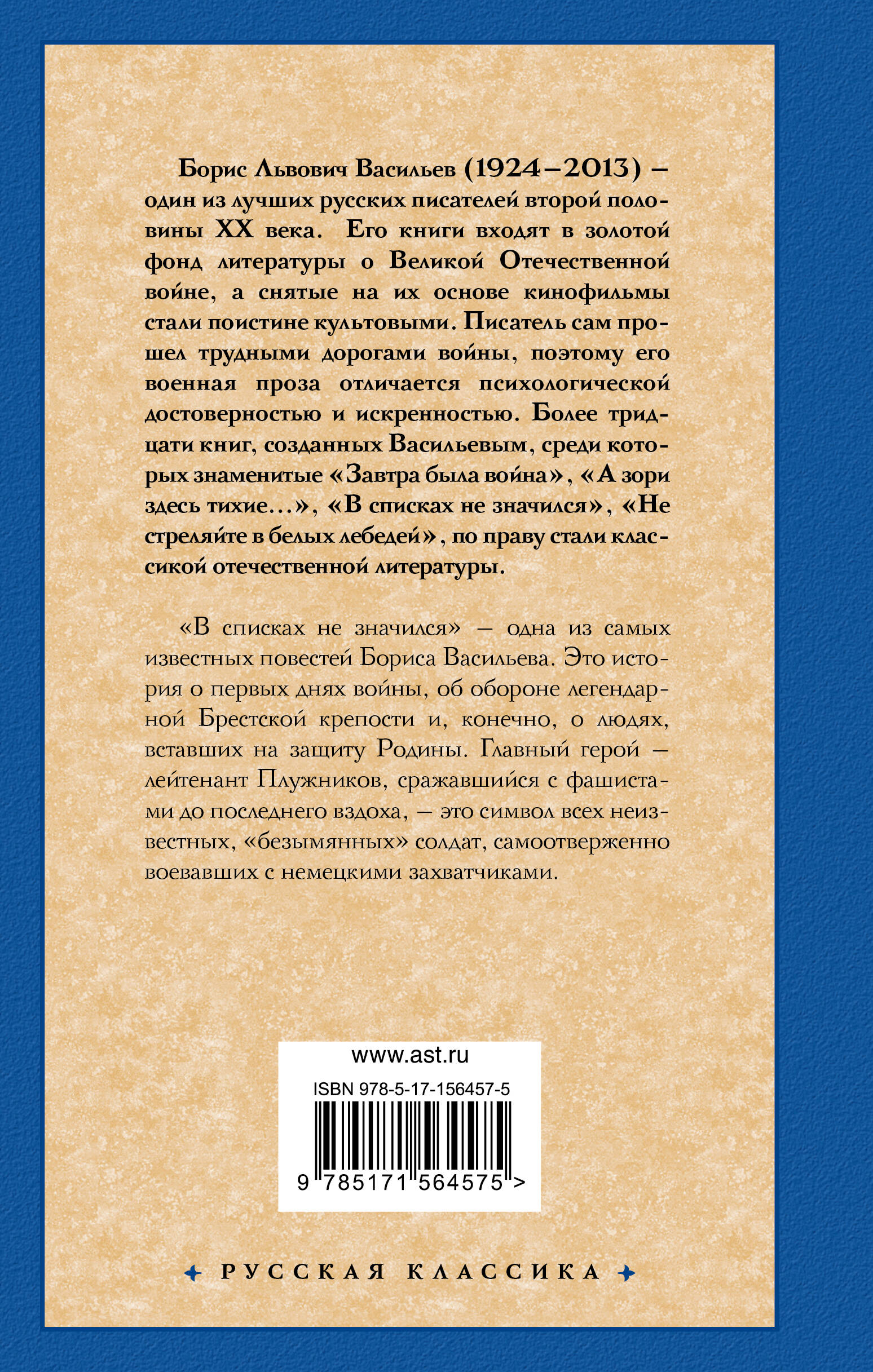 "В списках не значился" - одна из самых известных повестей Бориса Васильева. Это история о первых днях войны, об обороне легендарной Брестской крепости и, конечно, о людях, вставших на защиту Родины. Главный герой - лейтенант Плужников, сражавшийся с фашистами до последнего вздоха, - это символ всех неизвестных, "безымянных" солдат, самоотверженно воевавших с немецкими захватчиками.| Издательство | ИЗДАТЕЛЬСТВО "АСТ" |