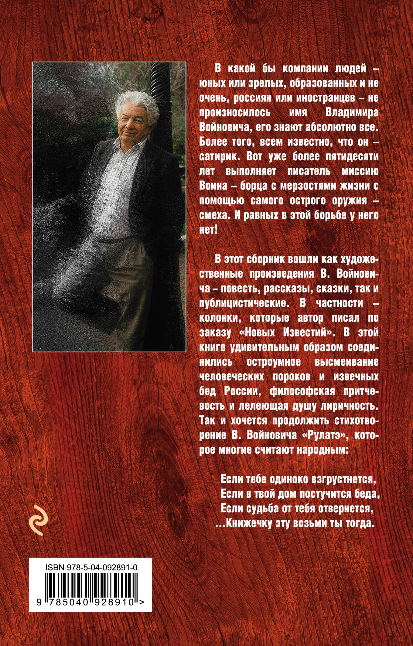 В этот сборник вошли как художественные произведения В. Войновича - повесть, рассказы, сказки, - так и публицистические. В частности, колонки, которые автор писал по заказу "Новых Известий". В этой книге удивительным образом соединились остроумное высмеивание человеческих пороков и извечных бед России, философская притчевость и лелеющая душу лиричность. Так и хочется продолжить стихотворение В. Войновича "Рулатэ", которое многие считают народным: Если тебе одиноко взгрустнется, Если в твой дом постучится беда, Если судьба от тебя отвернется, …Книжечку эту возьми ты тогда.| Издательство | ООО "Издательство "Эксмо" |