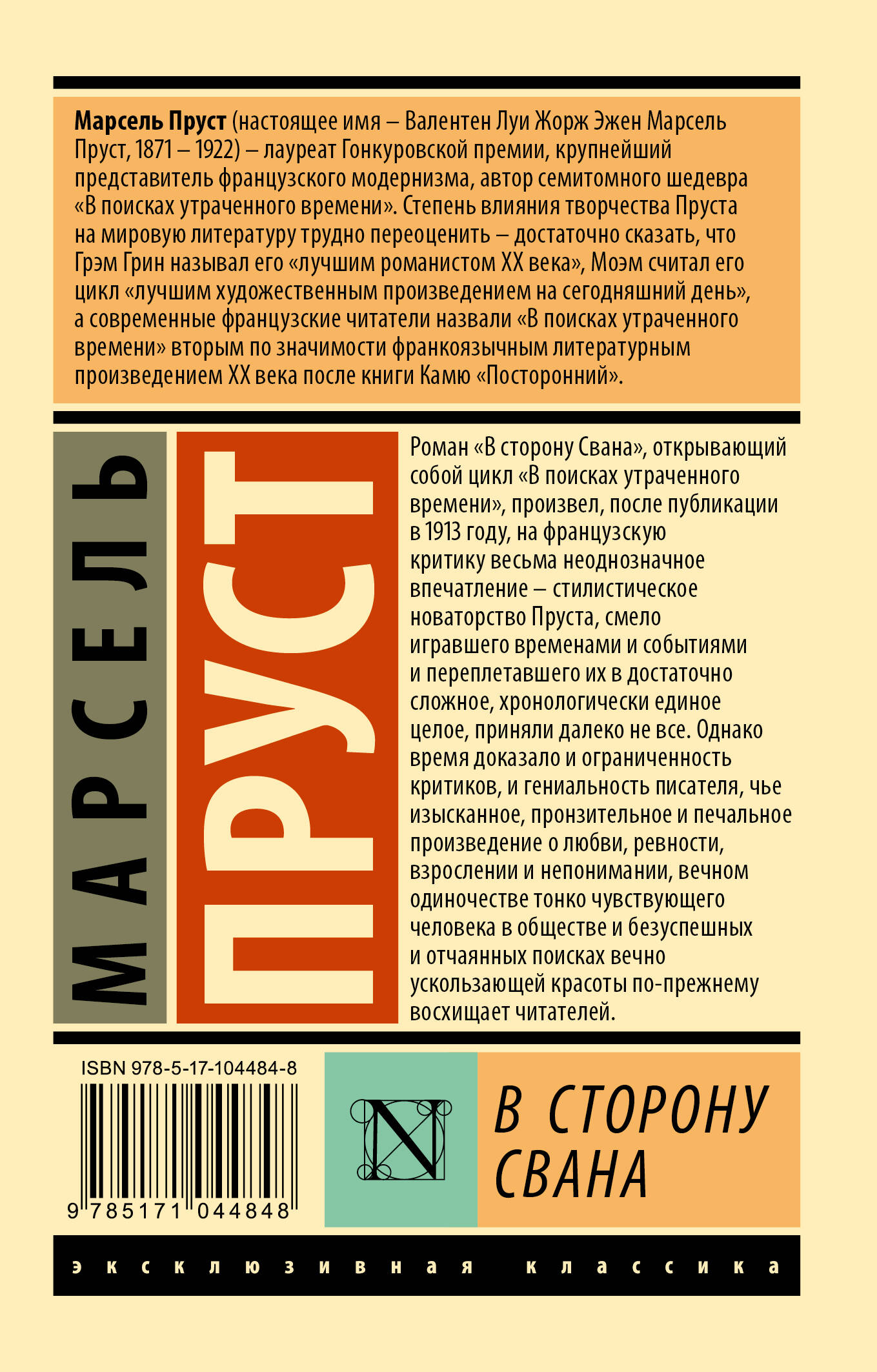 Роман "В сторону Свана", открывающий собой цикл "В поисках утраченного времени", произвел, после публикации в 1913 году, на французскую критику весьма неоднозначное впечатление - стилистическое новаторство Пруста, смело игравшего временами и событиями и переплетавшего их в достаточно сложное хронологически единое целое, приняли далеко не все. Однако время доказало и ограниченность критиков, и гениальность писателя, чье изысканное, пронзительное и печальное произведение о любви, ревности, взрослении и непонимании, вечном одиночестве тонко чувствующего человека в обществе и безуспешных и отчаянных поисках вечно ускользающей красоты по-прежнему восхищает читателей.| Издательство | ИЗДАТЕЛЬСТВО "АСТ" |