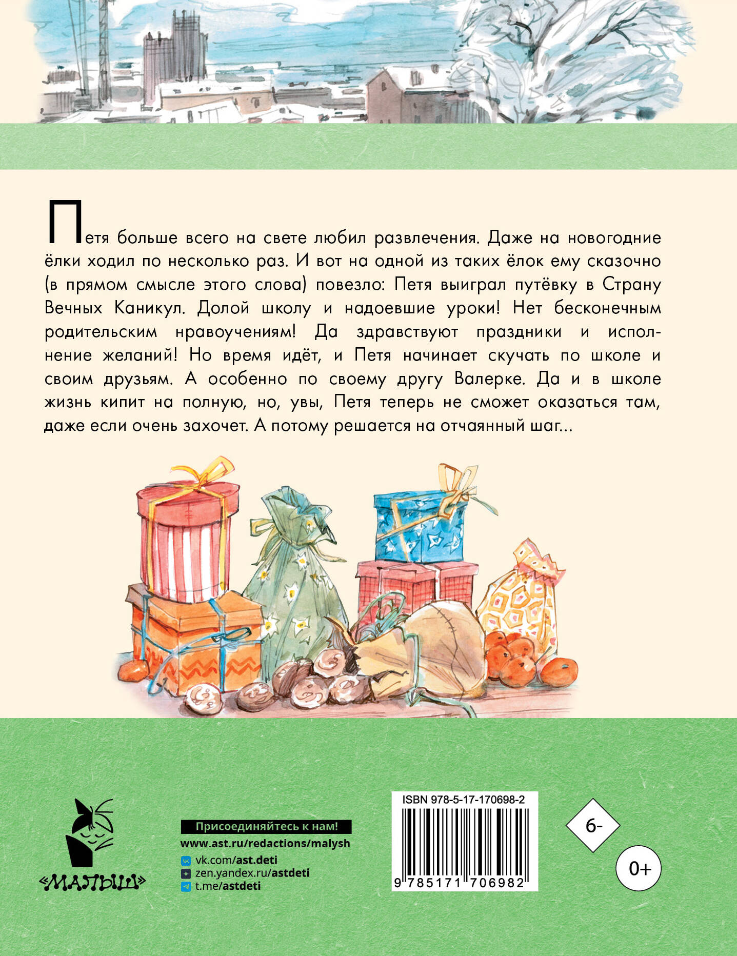 Петя больше всего на свете любил развлечения. Даже на новогодние ёлки ходил по несколько раз. И вот на одной из таких ёлок ему сказочно (в прямом смысле этого слова) повезло: Петя выиграл путёвку в Страну Вечных Каникул. Долой школу и надоевшие уроки! Нет бесконечным родительским нравоучениям! Да здравствуют праздники и исполнение желаний! Но время идёт, и Петя начинает скучать по школе и своим друзьям. А особенно по своему другу Валерке. Да и в школе жизнь кипит на полную, но, увы, Петя теперь не сможет оказаться там, даже если очень захочет. А потому решается на отчаянный шаг…