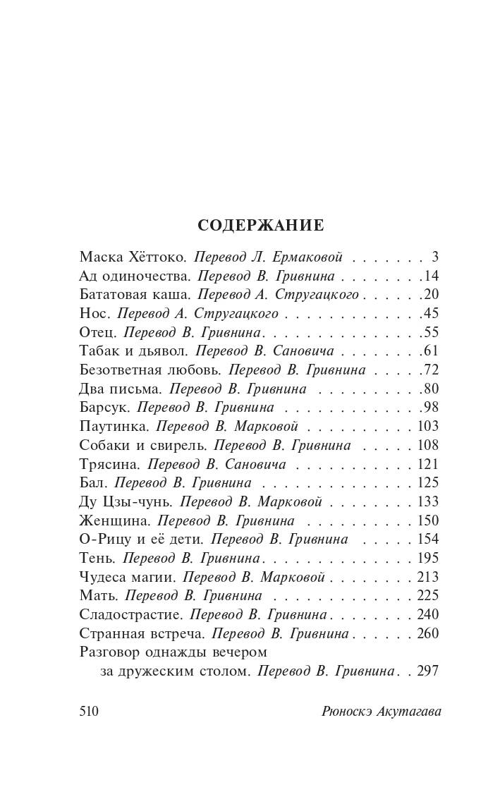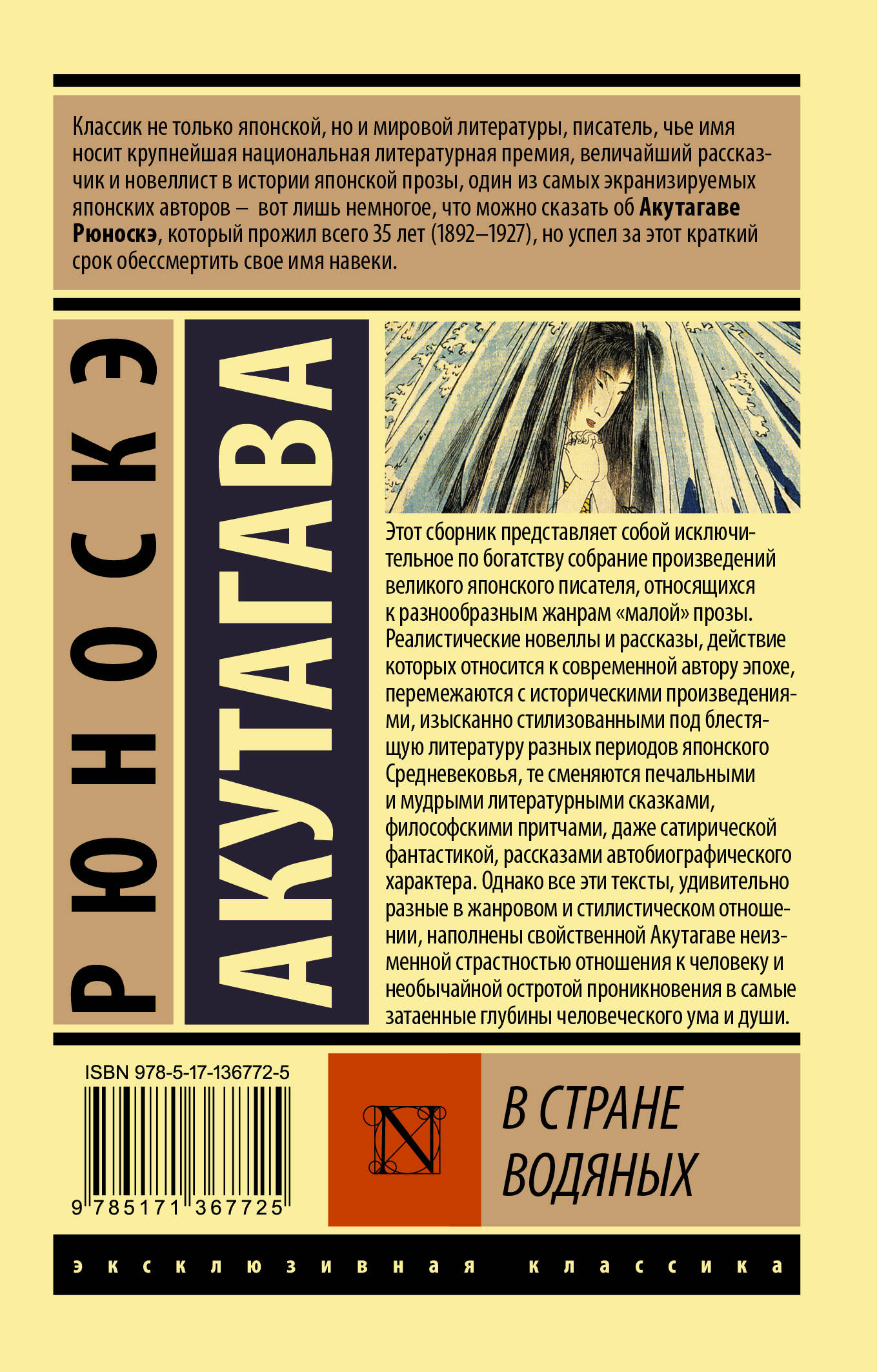 Этот сборник представляет собой исключительное по богатству собрание произведений великого японского писателя, относящихся к разнообразным жанрам "малой" прозы. Реалистические новеллы и рассказы, действие которых относится к современной автору эпохе, перемежаются с историческими произведениями, изысканно стилизованными под блестящую литературу разных периодов японского Средневековья, те сменяются печальными и мудрыми литературными сказками, философскими притчами, даже сатирической фантастикой, рассказами автобиографического характера. Однако все эти тексты, удивительно разные в жанровом и стилистическом отношении, наполнены свойственной Акутагаве неизменной страстностью отношения к человеку и необычайной остротой проникновения в самые затаенные глубины человеческого ума и души.| Издательство | ИЗДАТЕЛЬСТВО "АСТ" |