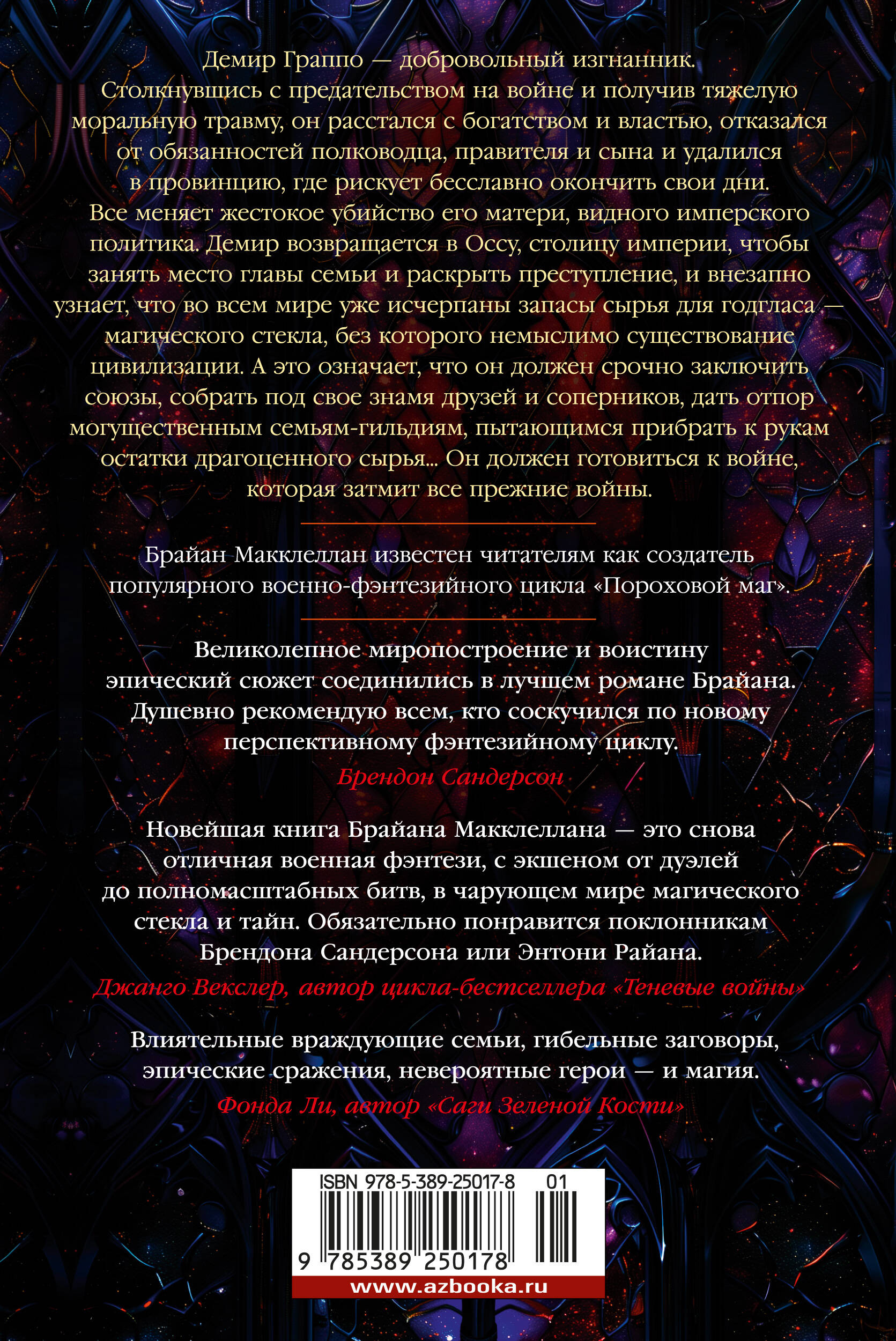 Демир Граппо - добровольный изгнанник. Столкнувшись с предательством на войне и получив тяжелую моральную травму, он расстался с богатством и властью, отказался от обязанностей полководца, правителя и сына и удалился в провинцию, где рискует бесславно окончить свои дни. Все меняет жестокое убийство его матери, видного имперского политика. Демир возвращается в Оссу, столицу империи, чтобы занять место главы семьи и раскрыть преступление, и внезапно узнает, что во всем мире уже исчерпаны запасы сырья для годгласа - магического стекла, без которого немыслимо существование цивилизации. А это означает, что он должен срочно заключить союзы, собрать под свое знамя друзей и соперников, дать отпор могущественным семьям-гильдиям, пытающимся прибрать к рукам остатки драгоценного сырья... Он должен готовиться к войне, которая затмит все прежние войны. Брайан Макклеллан известен читателям как создатель популярного военно-фэнтезийного цикла "Пороховой маг". Впервые на русском!| Издательство | Азбука-Аттикус Издат.группа ООО |