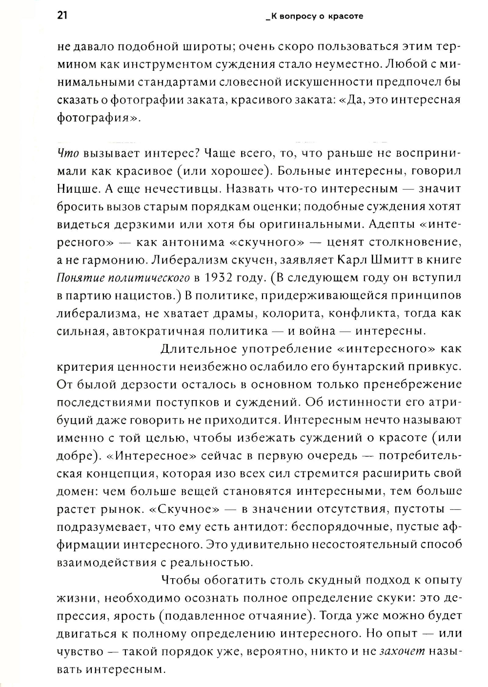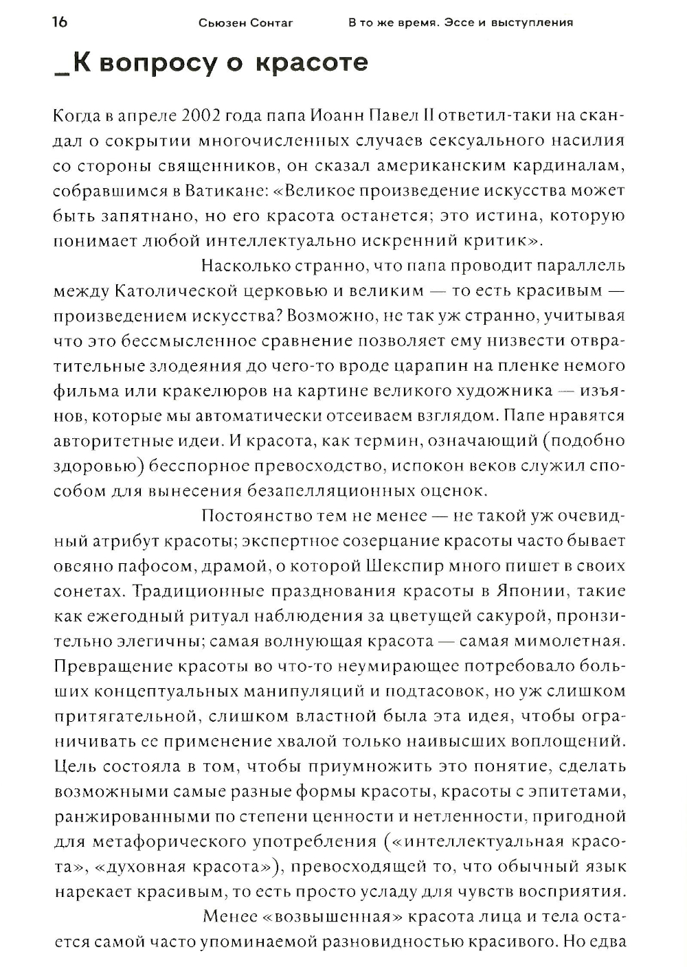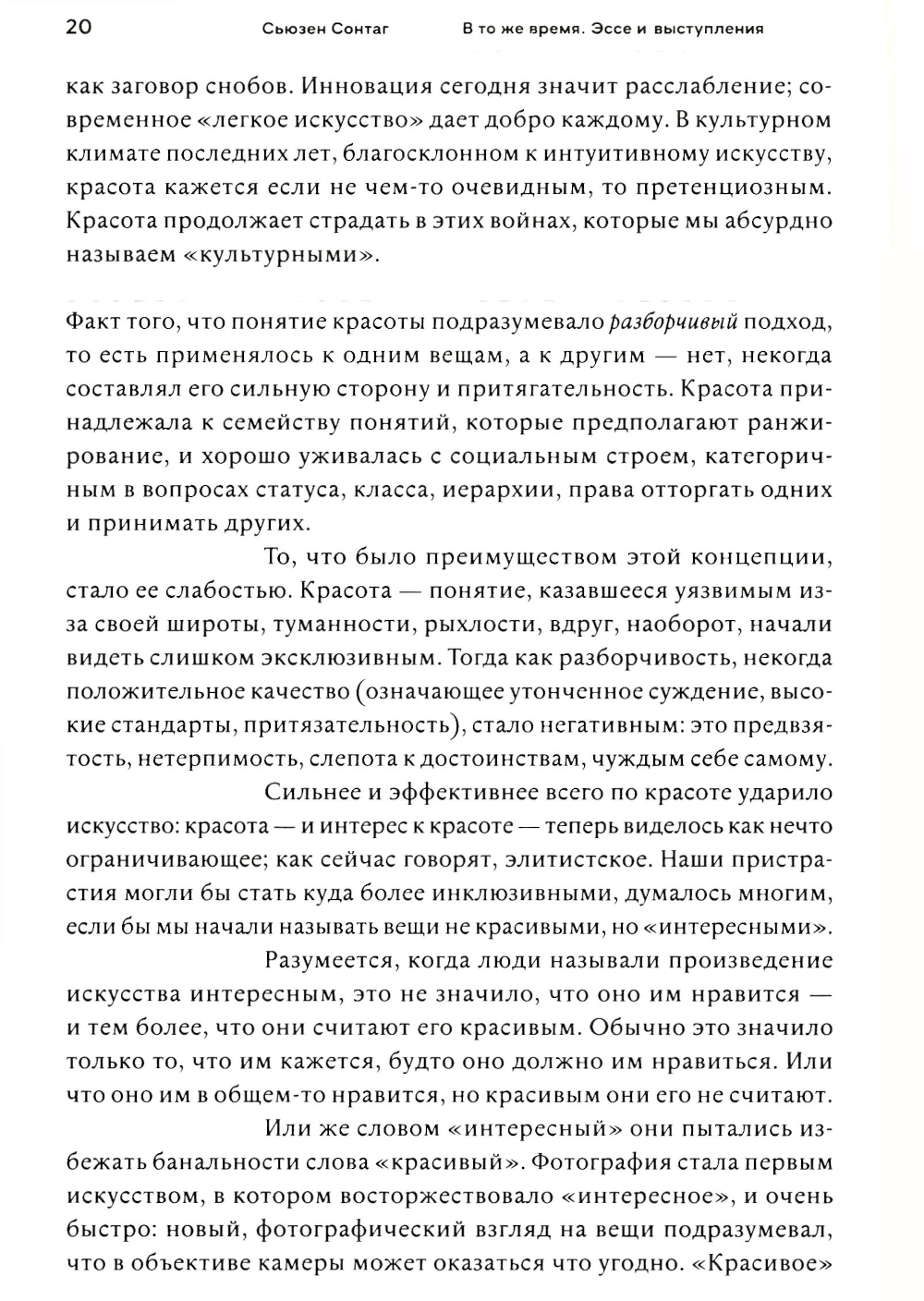 Сборник из шестнадцати эссе и выступлений Сьюзен Сонтаг (1933-2004), подготовленный ею в последние годы жизни, ретроспективно воспринимается как творческое завещание. Рассуждения о красоте, фотографии, художественных поисках Виктора Сержа, Леонида Цыпкина, Анны Банти, Халлдора Лакснесса, о переписке Рильке с Пастернаком и Цветаевой оказываются органически связаны с восприятием трагедии 11 сентября и войны в Ираке, подводя к одной из крупнейших и главных тем американской мыслительницы и писательницы: ответственности и задачам литературы в ХХ веке. Глубокое и созидательное прочтение работ других авторов, верность высоким моральным критериям, многомерные оценки происходящего «везде и одновременно» позволяют считать этот сборник шедевром позднего периода творчества Сонтаг.