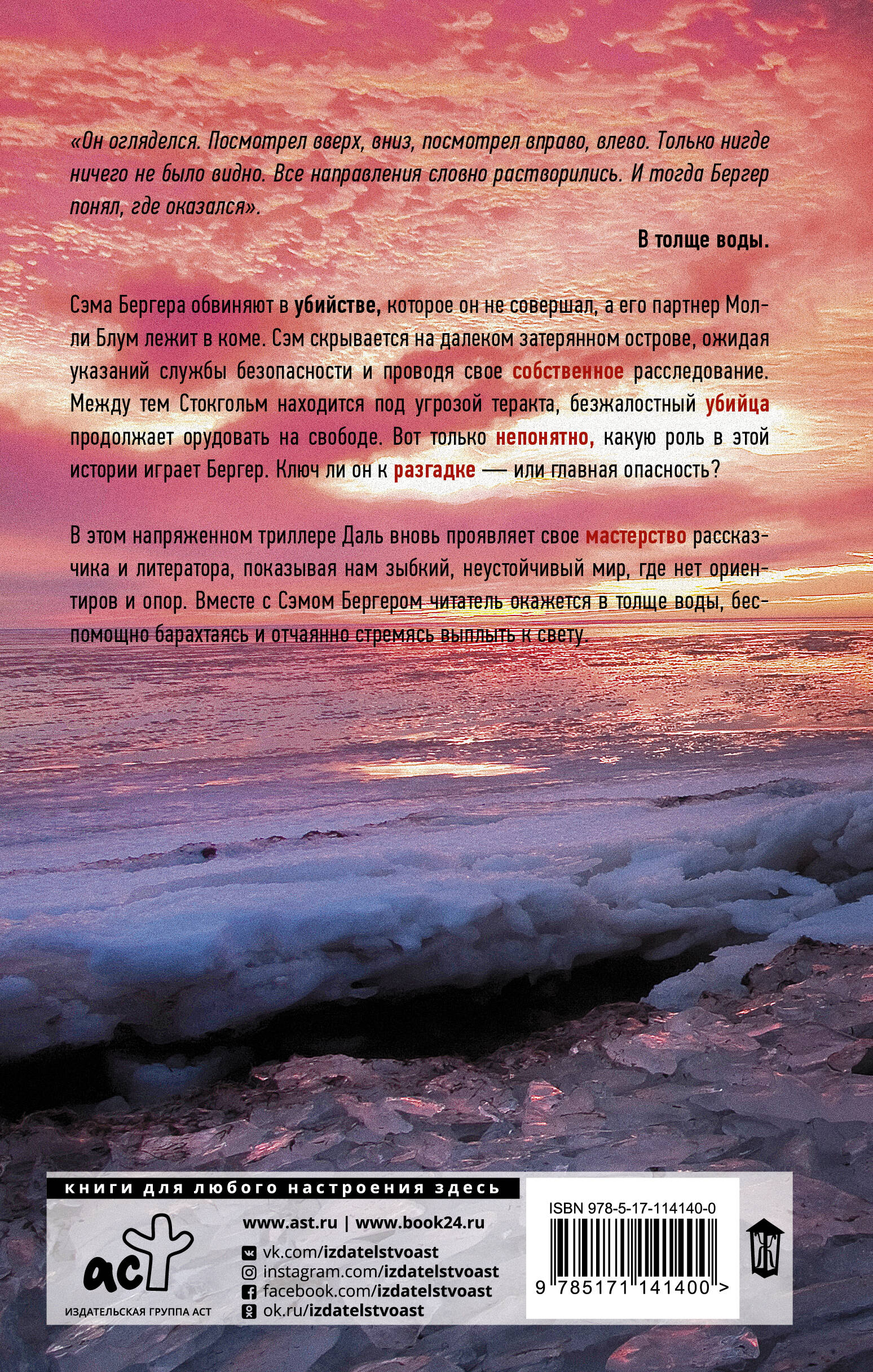 Сэма Бергера обвиняют в убийстве, которое он не совершал, а его партнер Молли Блум лежит в коме. Сэм скрывается на далеком затерянном острове, ожидая указаний службы безопасности и проводя свое собственное расследование. Между тем Стокгольм находится под угрозой теракта, безжалостный убийца продолжает орудовать на свободе. Вот только непонятно, какую роль в этой истории играет Бергер. Ключ ли он к разгадке - или главная опасность? В этом напряженном триллере Даль вновь проявляет свое мастерство рассказчика и литератора, показывая нам зыбкий, неустойчивый мир, где нет ориентиров и опор. Вместе с Сэмом Бергером читатель окажется в толще воды, беспомощно барахтаясь и отчаянно стремясь выплыть к свету.| Издательство | ИЗДАТЕЛЬСТВО "АСТ" |