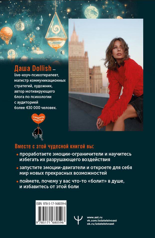 Даша Dollish - live-коуч-психотерапевт, магистр коммуникационных стратегий, художник, автор мотивирующего блога по психологии с аудиторией более 430 000 человек. Перед вами уникальные истории, чтение которых вызывает потрясающий психотерапевтический эффект. Страх, злость, агрессия, сомнение, обида, стыд - эмоции-ограничители. Они мешают принимать решения, трезво реагировать на ситуации и менять жизнь так, чтобы она стала воплощением мечты. Радость, уверенность, легкость, любовь - эмоции-двигатели. Они толкают нас на действия, позволяют думать о прекрасном и фантазировать. Авторские трансформационные сказки - как тренинг личностного роста. Они помогут проработать заблокированные эмоции и найти силы строить жизнь каждый день. Терапевтические упражнения покажут, где найти внутренний свет, и научат гармонично распределять энергию. Вы примете свое прошлое, начнете жить в настоящем моменте с открытым сердцем и светлым разумом и избавитесь от хоровода сомнений и тревог.| Издательство | Издательство "АСТ" |