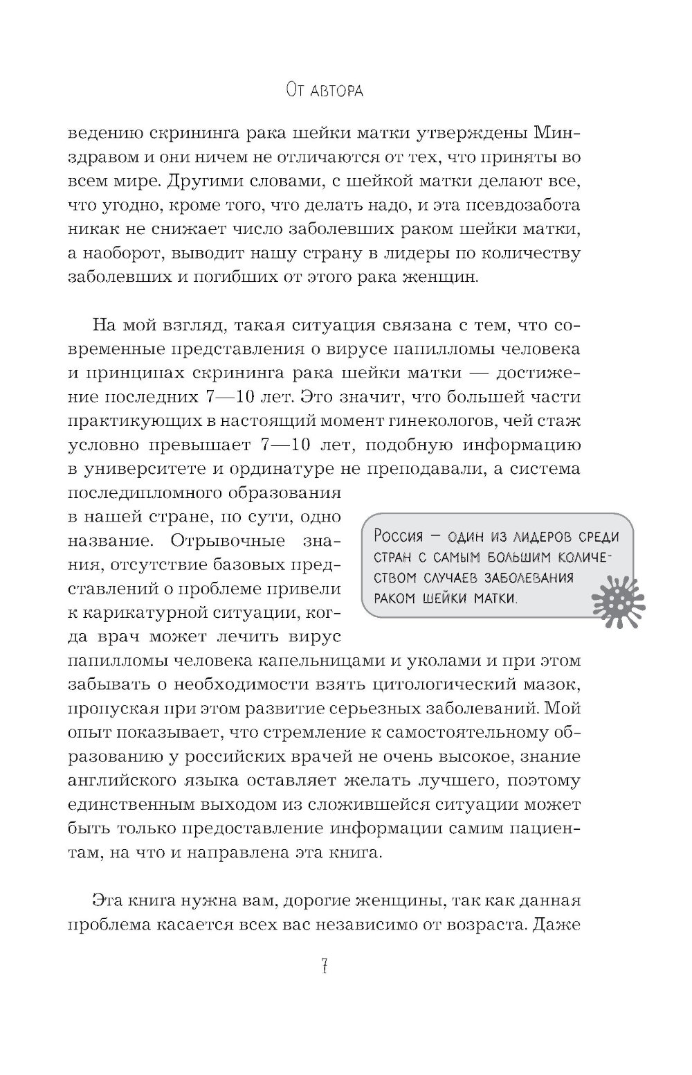 Вирус папилломы человека - один из самых спорных и опасных в истории человечества. Существующий более 300 млн лет, он, с одной стороны, как вирус гриппа, стал нашим безобидным соседом, а с другой стороны, научился убивать тихо и бессимптомно. Во всем мире от вызванного ВПЧ рака шейки матки погибает от 2 до 4% женщин. В России - на порядок больше. Паника, страх и огромное количество мифов вокруг этого странного вируса создали ему ореол таинственности и враждебности. - Какие типы ВПЧ безобидны, а какие онкогенны? - Как во всем мире защищаются от болезни еще в 14 лет? - Почему проверяться надо только через 3 года после первого полового контакта? - Что имеет в виду врач, читая вашу цитологию? Интересные факты об истории открытия, полезная информация о способах защиты и важные факты о собственном здоровье в 20, 30, 40, 50 и 65 лет в новой книге самого известного российского гинеколога Дмитрия Лубнина, автора бестселлера «Project woman».| Издательство | Эксмо |