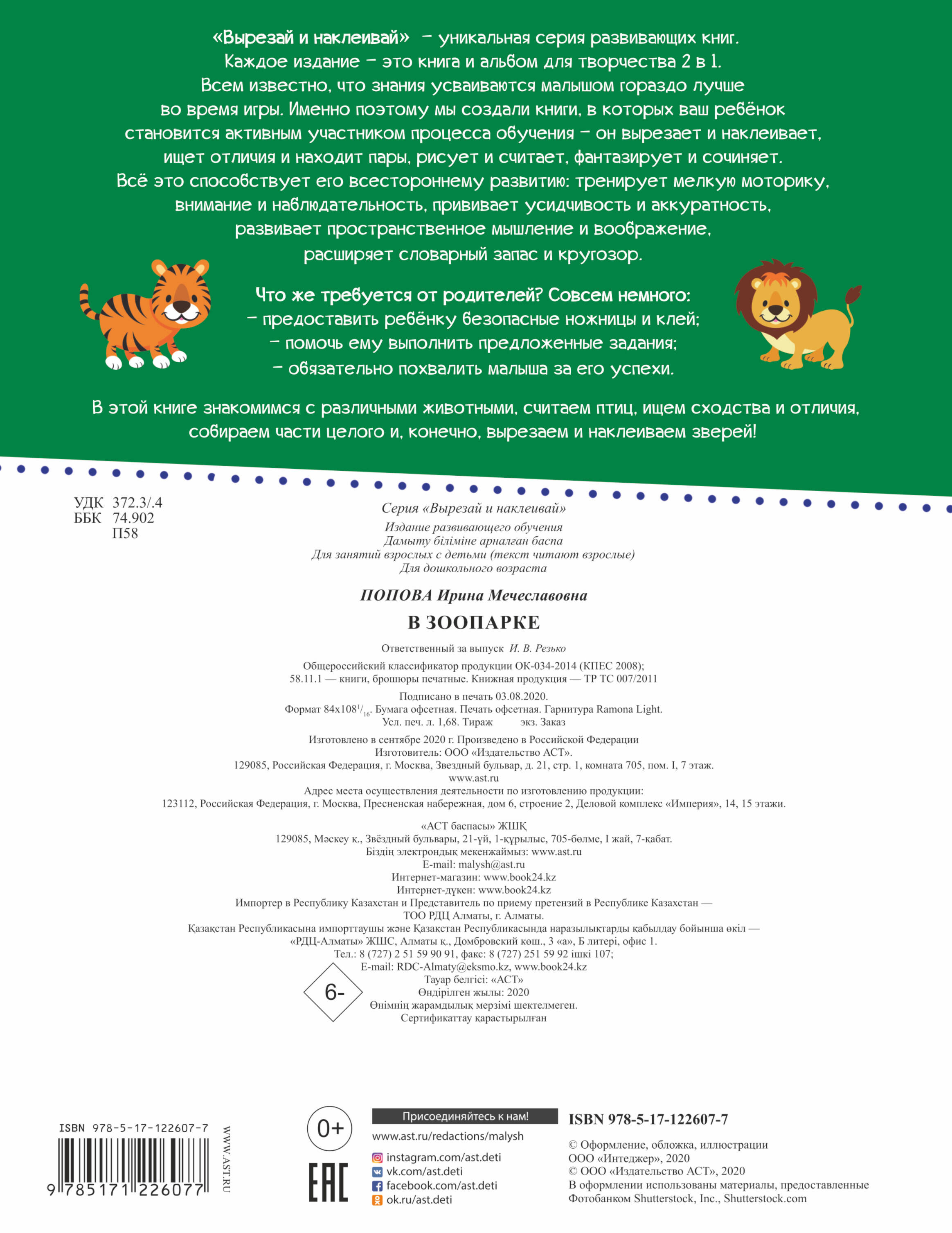 "Вырезай и наклеивай" - уникальная серия развивающих книг. Каждое издание - это книга и альбом для творчества 2 в 1. Ведь всем известно, что знания усваиваются малышом гораздо лучше во время игры. Именно поэтому мы создали книги, в которых ваш ребёнок становится активным участником учебного процесса - он рисует и считает, ищет отличия и находит пары, вырезает и наклеивает, фантазирует и сочиняет. Всё это способствует его всестороннему развитию: тренирует внимание и наблюдательность, прививает усидчивость и аккуратность, развивает пространственное мышление и воображение, расширяет словарный запас и кругозор. Что же требуется от родителей? Совсем немного: - предоставить ребёнку безопасные ножницы и клей; - прочитать задание и объяснить, что нужно делать; - помочь (если потребуется) вырезать детали внизу страницы; - наклеить готовые детали в нужное место на картинке; - обязательно похвалить малыша за его успехи. В этой книге знакомимся с различными животными, считаем птиц, угадываем, где чья тень, собираем части целого и, конечно, вырезаем и наклеиваем зверей!| Издательство | ИЗДАТЕЛЬСТВО "АСТ" |