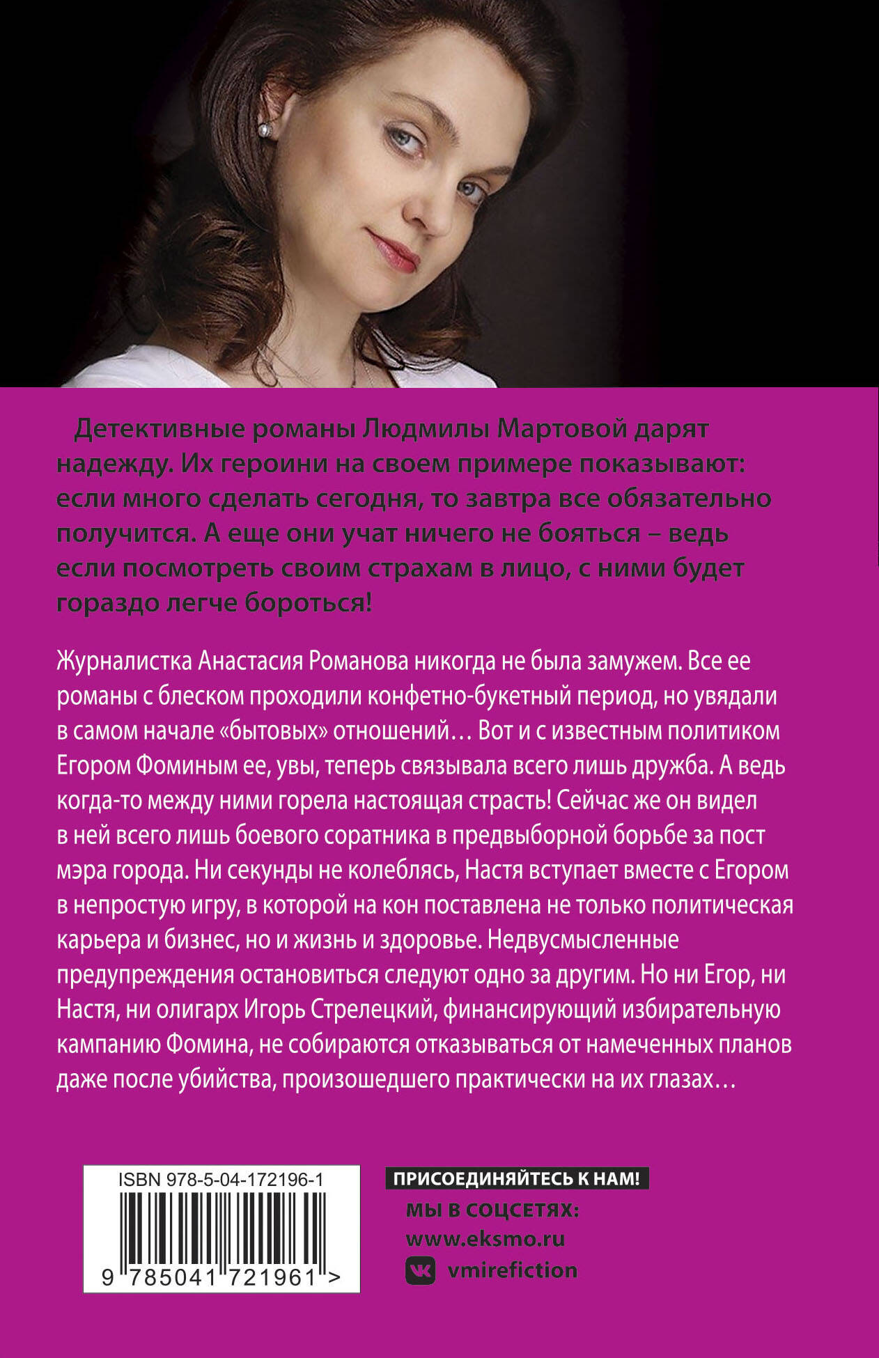 Журналистка Анастасия Романова никогда не была замужем. Все ее романы с блеском проходили конфетно-букетный период, но увядали в самом начале «бытовых» отношений… Вот и с известным политиком Егором Фоминым ее, увы, теперь связывала всего лишь дружба. А ведь когда-то между ними горела настоящая страсть! Сейчас же он видел в ней всего лишь боевого соратника в предвыборной борьбе за пост мэра города. Ни секунды не колеблясь, Настя вступает вместе с Егором в непростую игру, в которой на кон поставлена не только политическая карьера и бизнес, но и жизнь и здоровье. Недвусмысленные предупреждения остановиться следуют одно за другим. Но ни Егор, ни Настя, ни олигарх Игорь Стрелецкий, финансирующий избирательную кампанию Фомина, не собираются отказываться от намеченных планов даже после убийства, произошедшего практически на их глазах… Людмила Мартова - мастер увлекательной детективной мелодрамы, автор захватывающих остросюжетных историй. Их отличают закрученная детективная интрига, лихой финал с неожиданной развязкой и, конечно же, яркая любовная линия. Героини романов Людмилы Мартовой - современные молодые женщины, которые точно знают, чего хотят от жизни.| Издательство | ООО "Издательство "Эксмо" |