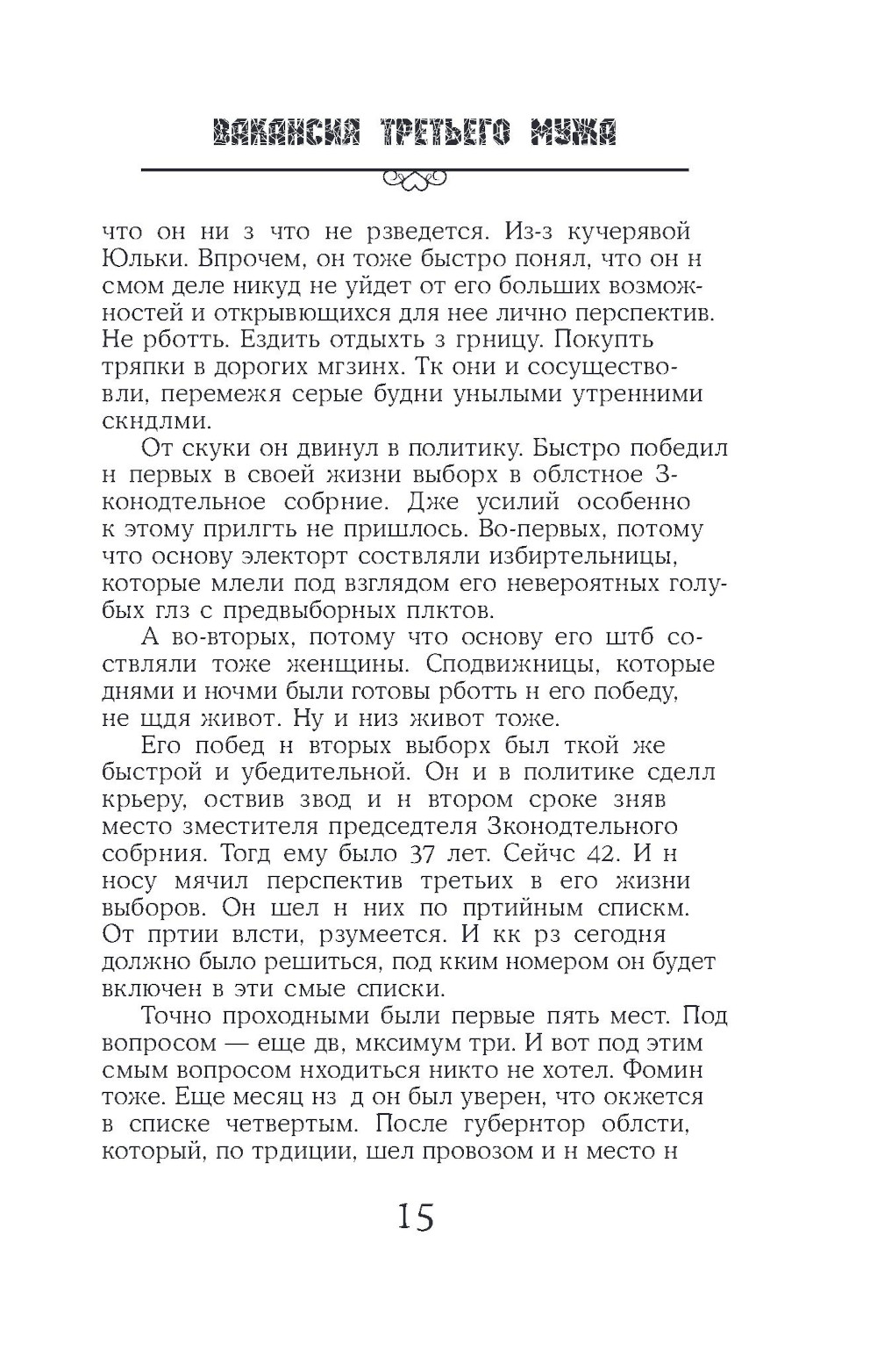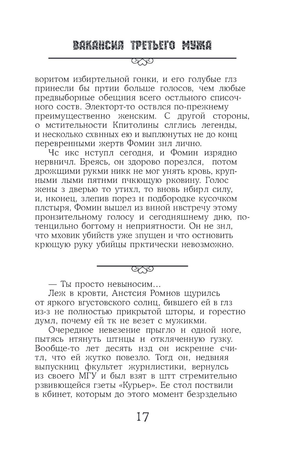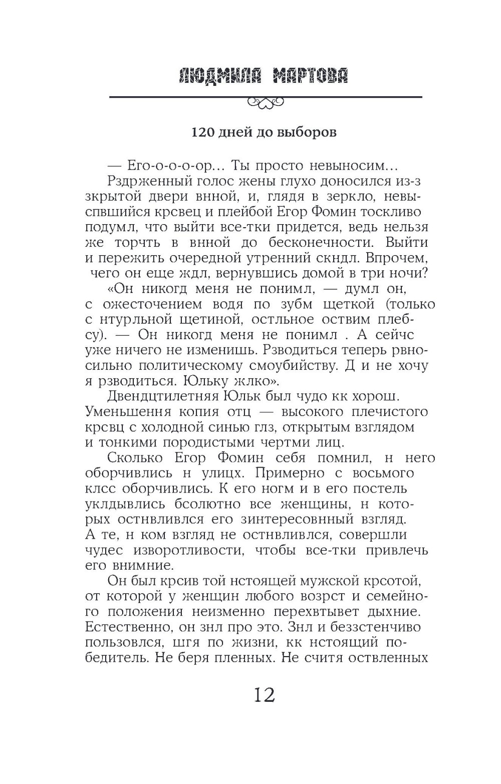 Журналистка Анастасия Романова никогда не была замужем. Все ее романы с блеском проходили конфетно-букетный период, но увядали в самом начале «бытовых» отношений… Вот и с известным политиком Егором Фоминым ее, увы, теперь связывала всего лишь дружба. А ведь когда-то между ними горела настоящая страсть! Сейчас же он видел в ней всего лишь боевого соратника в предвыборной борьбе за пост мэра города. Ни секунды не колеблясь, Настя вступает вместе с Егором в непростую игру, в которой на кон поставлена не только политическая карьера и бизнес, но и жизнь и здоровье. Недвусмысленные предупреждения остановиться следуют одно за другим. Но ни Егор, ни Настя, ни олигарх Игорь Стрелецкий, финансирующий избирательную кампанию Фомина, не собираются отказываться от намеченных планов даже после убийства, произошедшего практически на их глазах…
