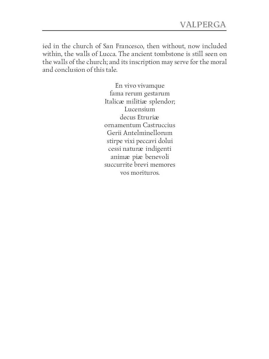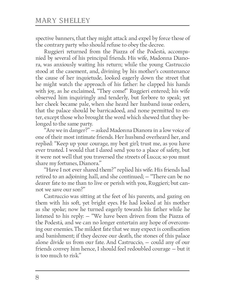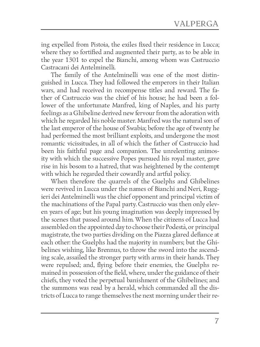 Mary Wollstonecraft Shelley (1797-1851) was an English novelist, dramatist, and short story writer, universally known for her Gothic novel "Frankenstein: or, The Modern Prometheus". This novel, written after "Frankenstein", revolves around the life of Castruccio Castracani, a tyrant, who successfully commanded Ghibelline forces in Tuscany against the Guelphs. The story also follows tragic destinies of two heroes, Ethanasia, Countess of Valperga, torn between loyalty to her Guelph roots and her affection for Castruccio, and Beatrice, with whom Castruccio falls in love.