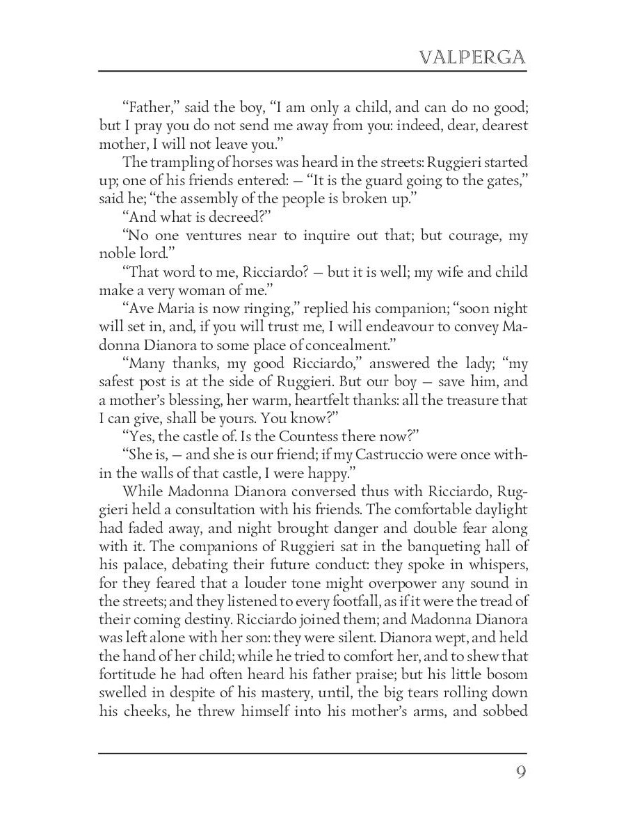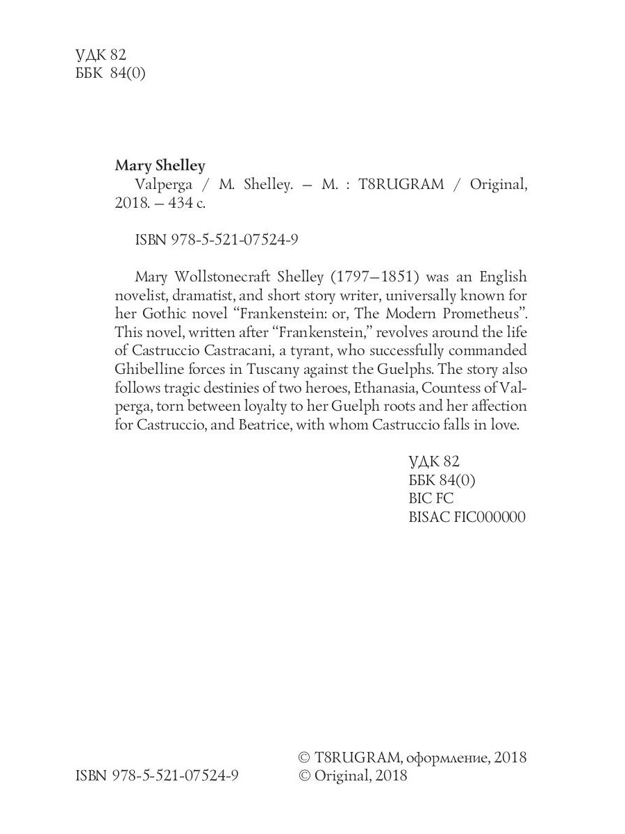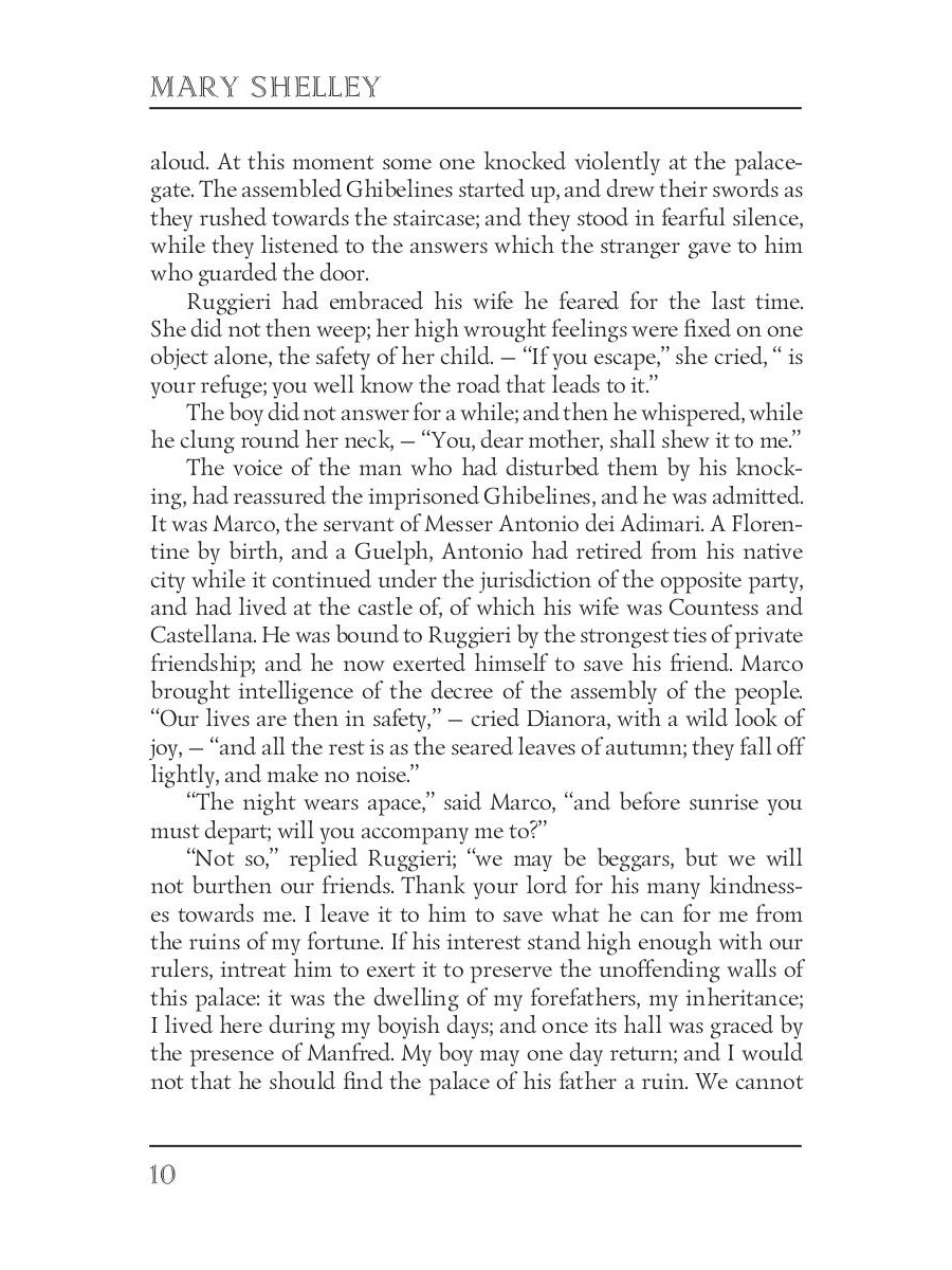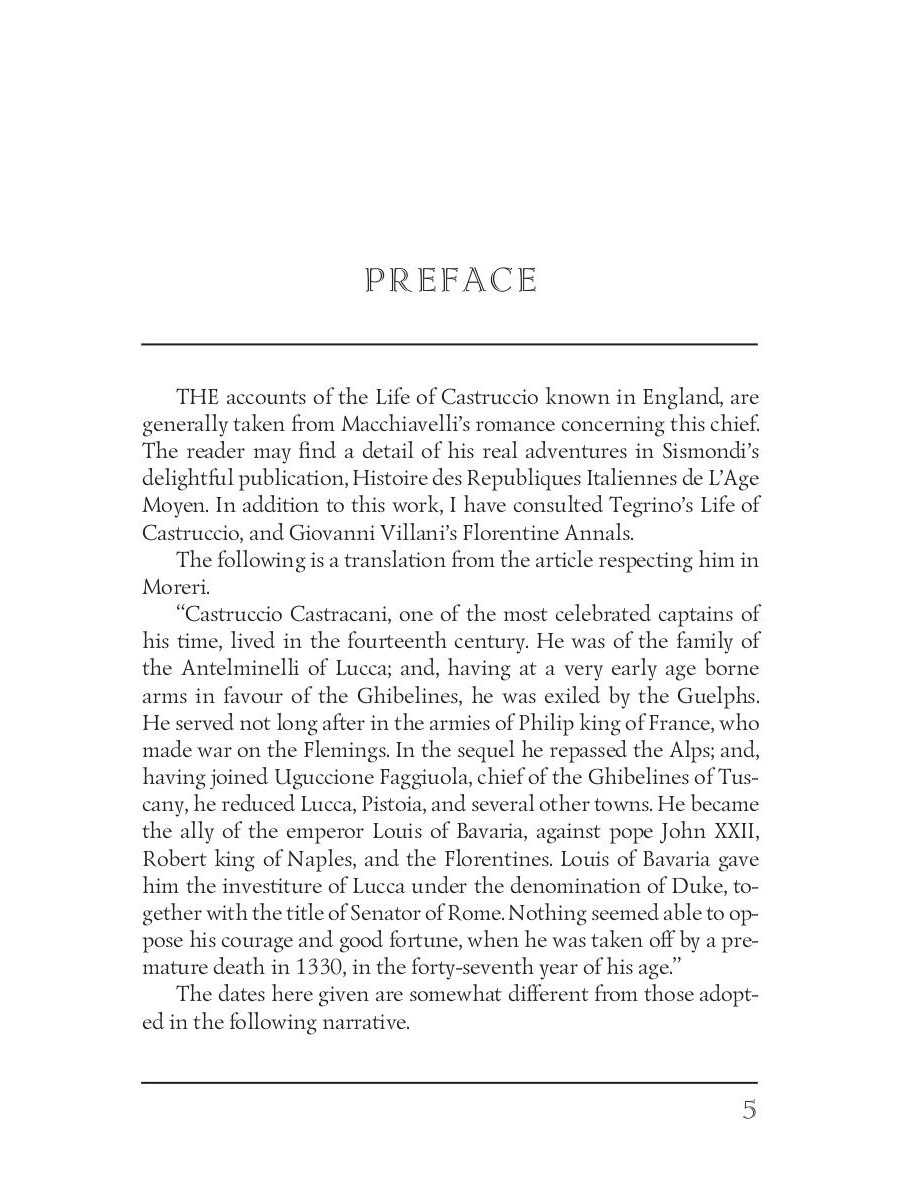 Mary Wollstonecraft Shelley (1797-1851) was an English novelist, dramatist, and short story writer, universally known for her Gothic novel "Frankenstein: or, The Modern Prometheus". This novel, written after "Frankenstein", revolves around the life of Castruccio Castracani, a tyrant, who successfully commanded Ghibelline forces in Tuscany against the Guelphs. The story also follows tragic destinies of two heroes, Ethanasia, Countess of Valperga, torn between loyalty to her Guelph roots and her affection for Castruccio, and Beatrice, with whom Castruccio falls in love.