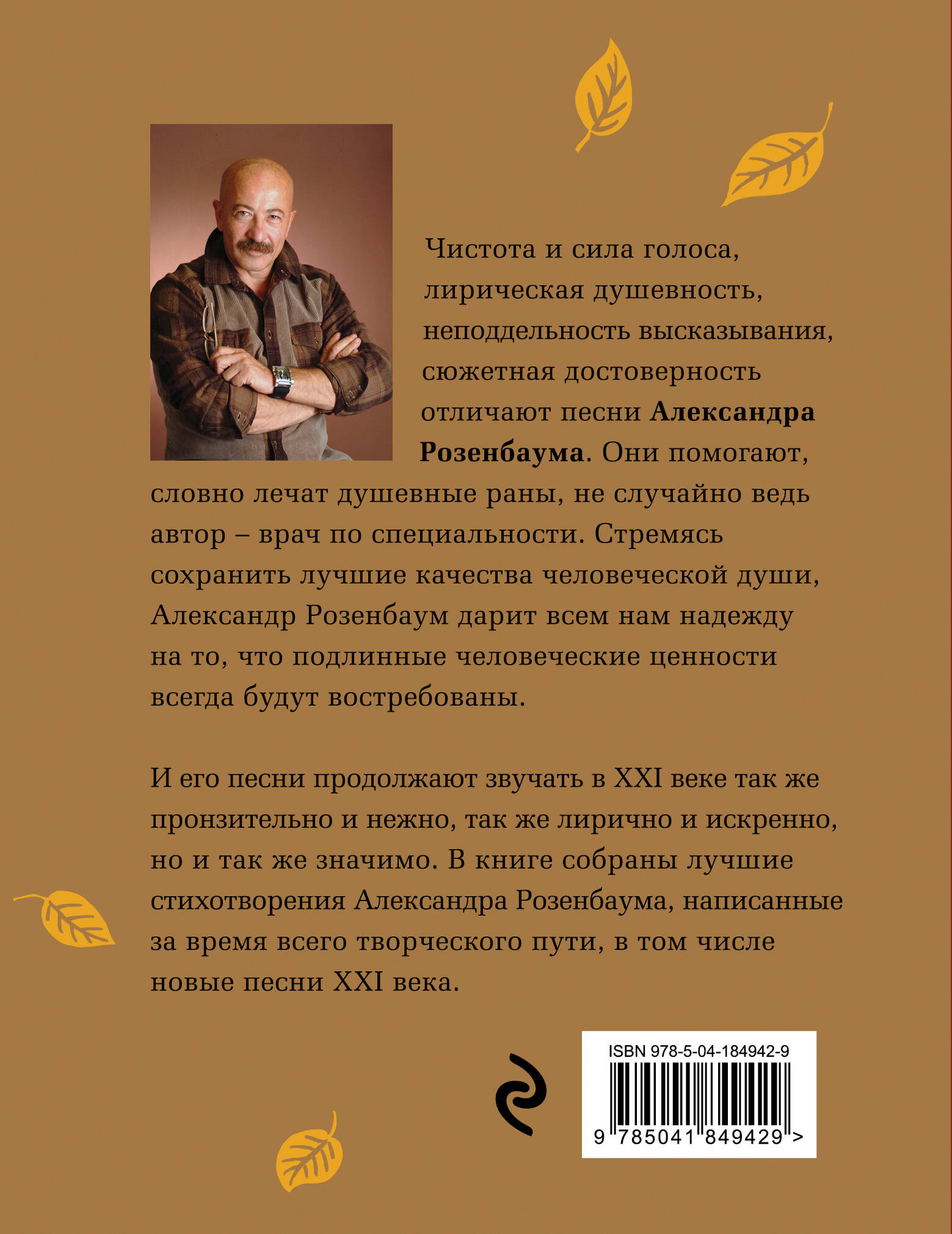 Стихи и песни, вошедшие в эту книгу - это своеобразная поэтическая панорама нашей жизни. О чем они? О родине и детстве, об отчем доме, о друзьях, о врачах «Скорой помощи». Здесь и полюбившиеся всем ранние произведения с образом одесского бандита начала прошлого века, цыганская тема, казачьи песни и философская лирика, размышления о своей судьбе и судьбе нашей страны… Здесь - песни, прошедшие испытание временем и любимые не одним поколением слушателей. Музыка и слова Александра Розенбаума продолжают звучать в ХХI веке так же пронзительно и нежно, так же лирично и искренно, как и прежде.| Издательство | ООО "Издательство "Эксмо" |