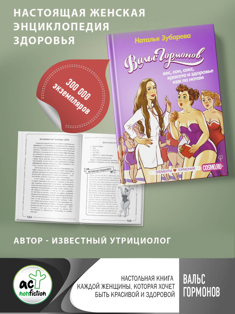 Наталья Зубарева - врач, специализирующаяся на гормональном здоровье и питании для баланса эндокринной системы. В блоге @doctor_zubareva, который читает более 1 миллиона подписчиков, - самые острые темы женского здоровья, бесценные советы и рекомендации, тысячи историй выздоровевших пациенток. "Вальс гормонов" - это уникальная женская энциклопедия здоровья. Вы узнаете, как: • снизить вес; • избавиться от бессонницы; • нормализовать женский цикл; • стать красавицей с идеальными кожей, ногтями и волосами; • почувствовать крылья за спиной и бесконечный приток энергии и сил. Десятки ответов на самые важные и серьезные вопросы о женском здоровье, о связанных с гормональным дисбалансом проблемах и их решении. Главное о женском гормональном здоровье простым и понятным языком от самого популярного доктора Instagram.| Издательство | ИЗДАТЕЛЬСТВО "АСТ" |