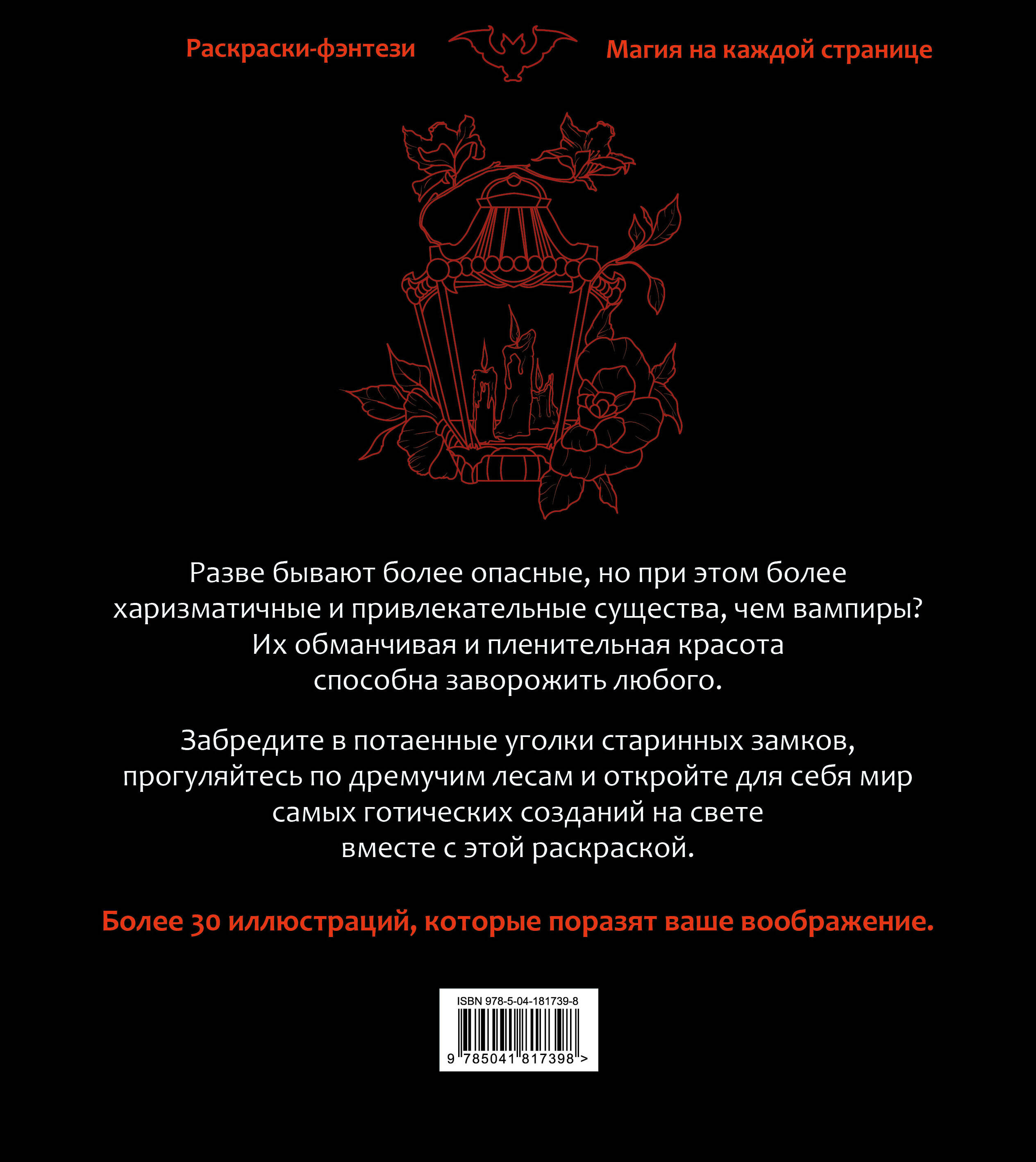 Утонченная раскраска-антистресс для взрослых! Вампирская тематика очаровывает каждого: старинные замки, камзолы и платья с ажурными рукавами, свечи и пленительная, опасная, бессмертная красота. Хотите прикоснуться к миру чарующей готики? Тогда скорее воссоздайте его на страницах этой раскраски! Раскрашивайте коварных, но харизматичных вампиров и заполняйте иллюстрации всеми оттенками мрака. Не бойтесь быть креативными! Раскраска также может стать отличным подарком поклонникам готической тематики на день рождения и любой другой праздник. Погружайтесь в мир теней и помните, что тьма бывает притягающе красивой и восхищающе манящей!| Издательство | ООО "Издательство "Эксмо" |